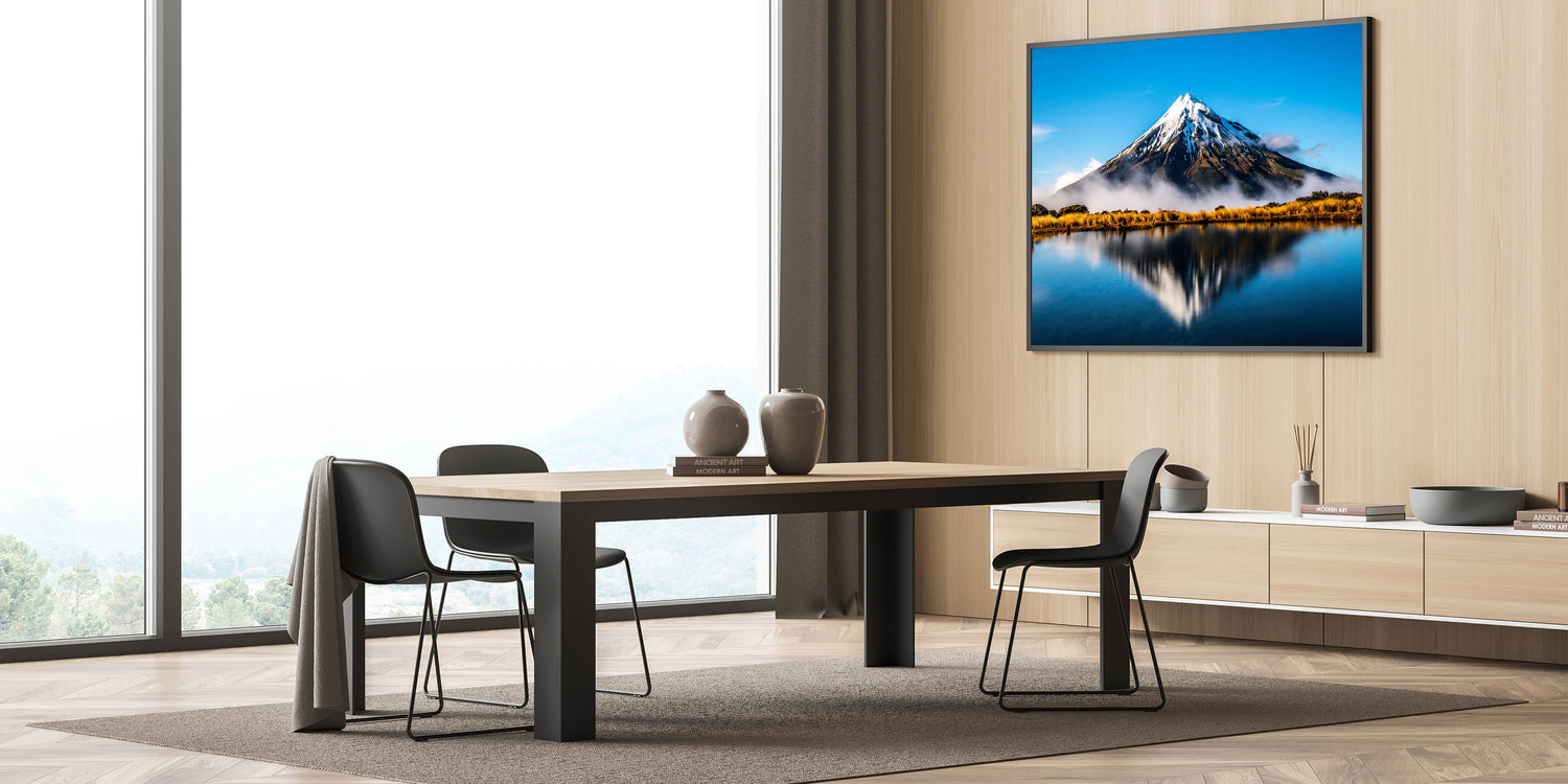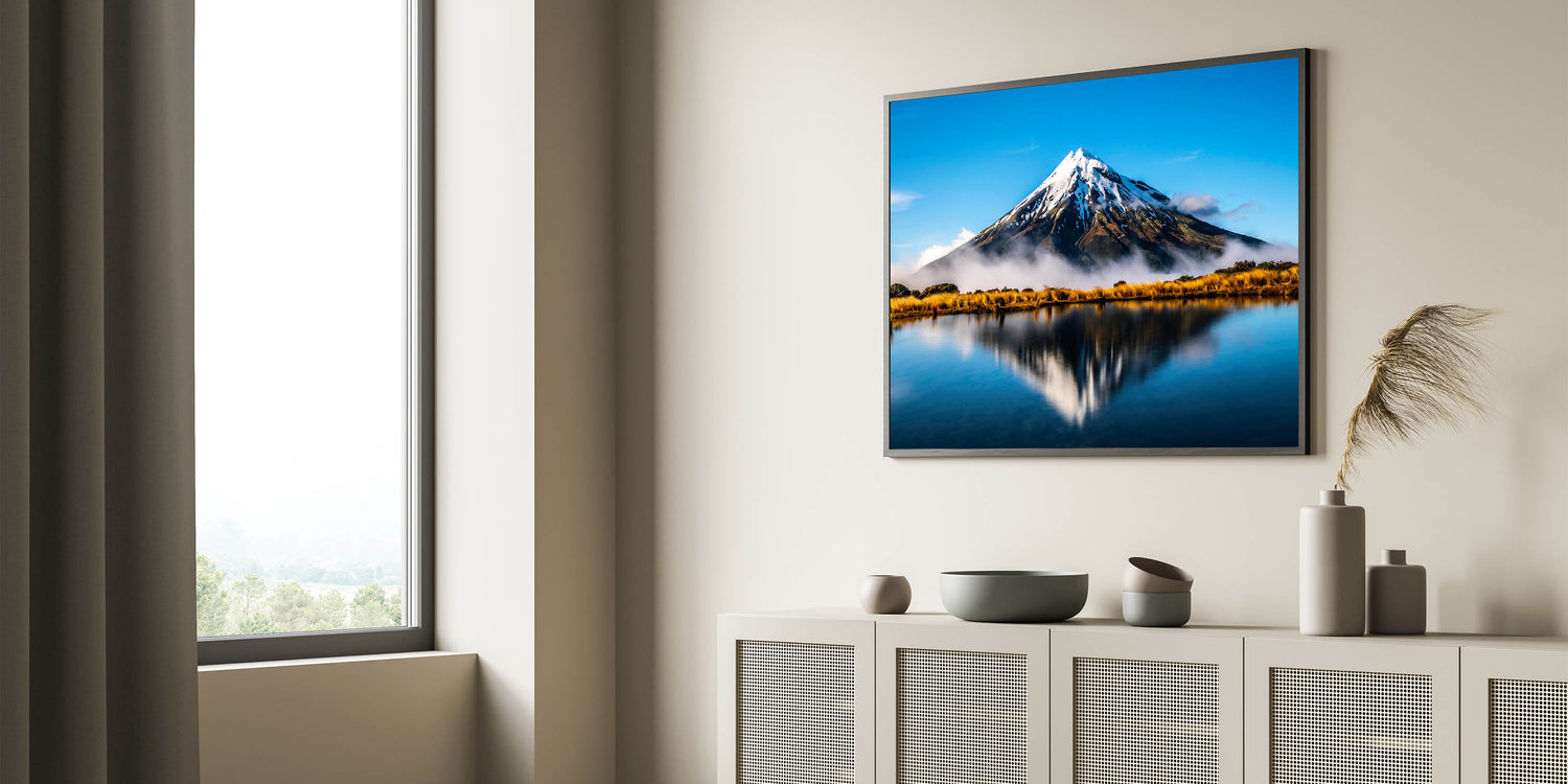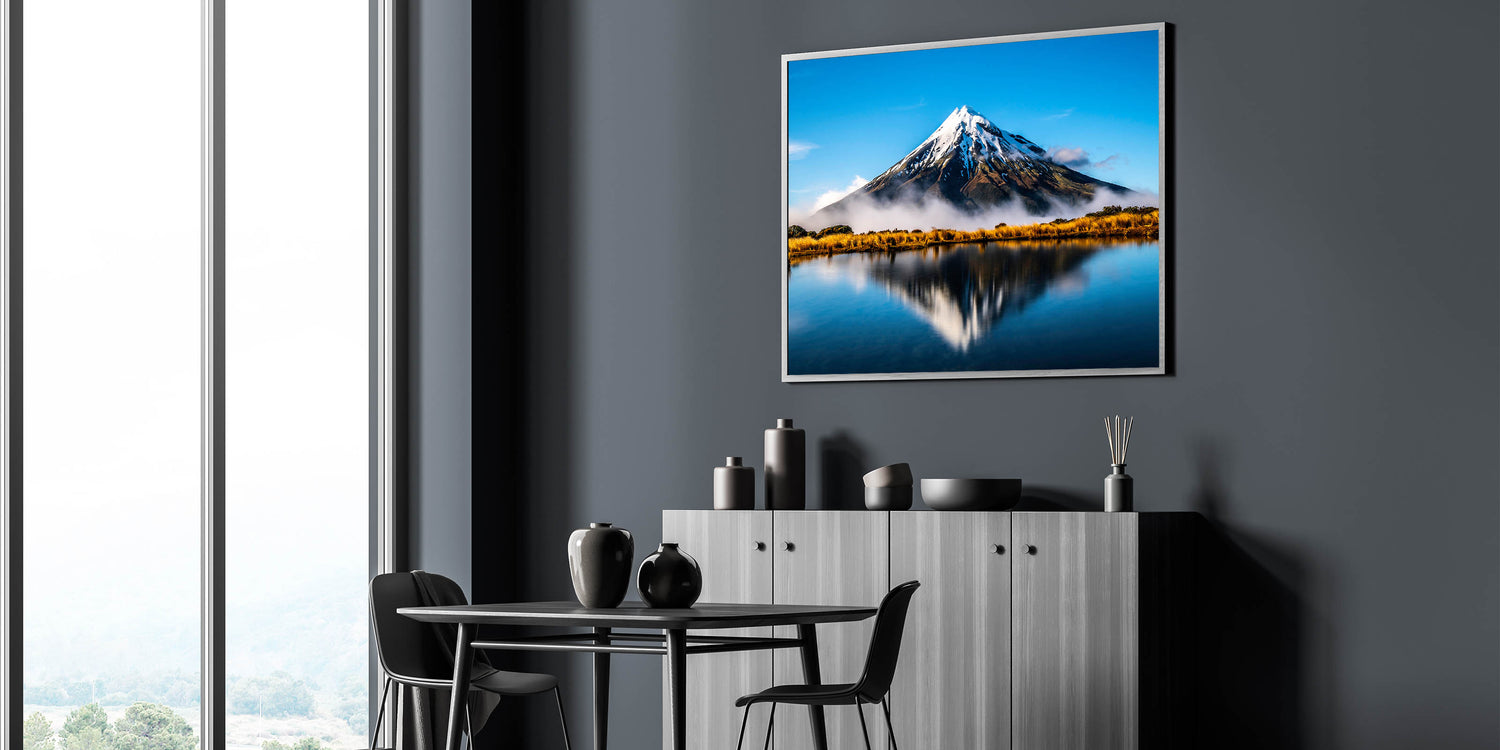 - High-resolution printing ensures that every detail, from the mountain's rugged textures to the tranquil water reflections, is captured with stunning clarity.