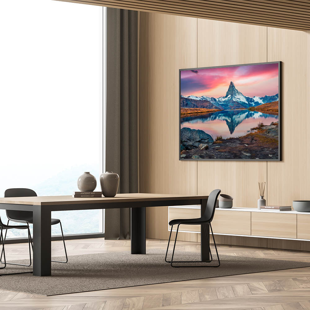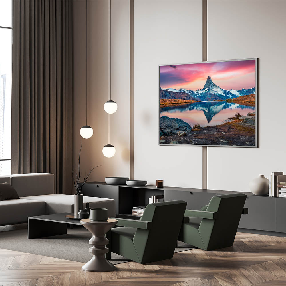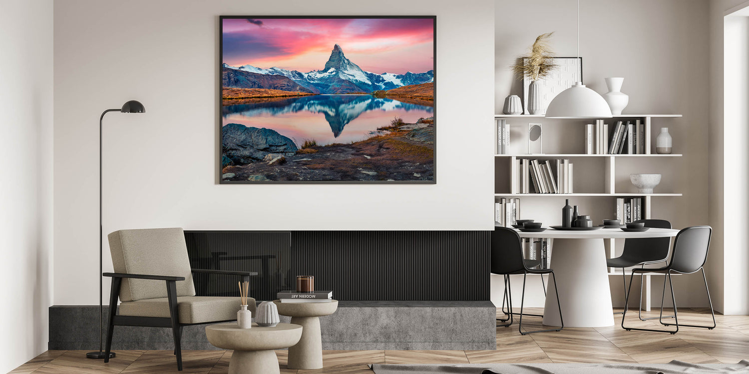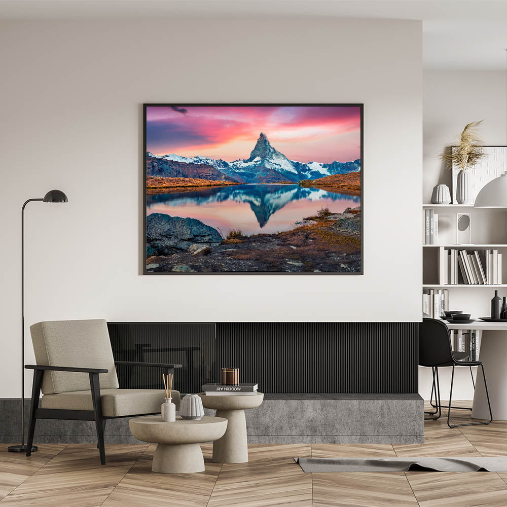 Experience the awe-inspiring beauty of nature with this majestic mountain sunset art. The vivid colors of the setting sun reflect off the tranquil waters, creating a stunning visual that perfectly captures the serene grandeur of the mountains. This mountain landscape print is ideal for adding a touch of natural beauty and dramatic color to any room.