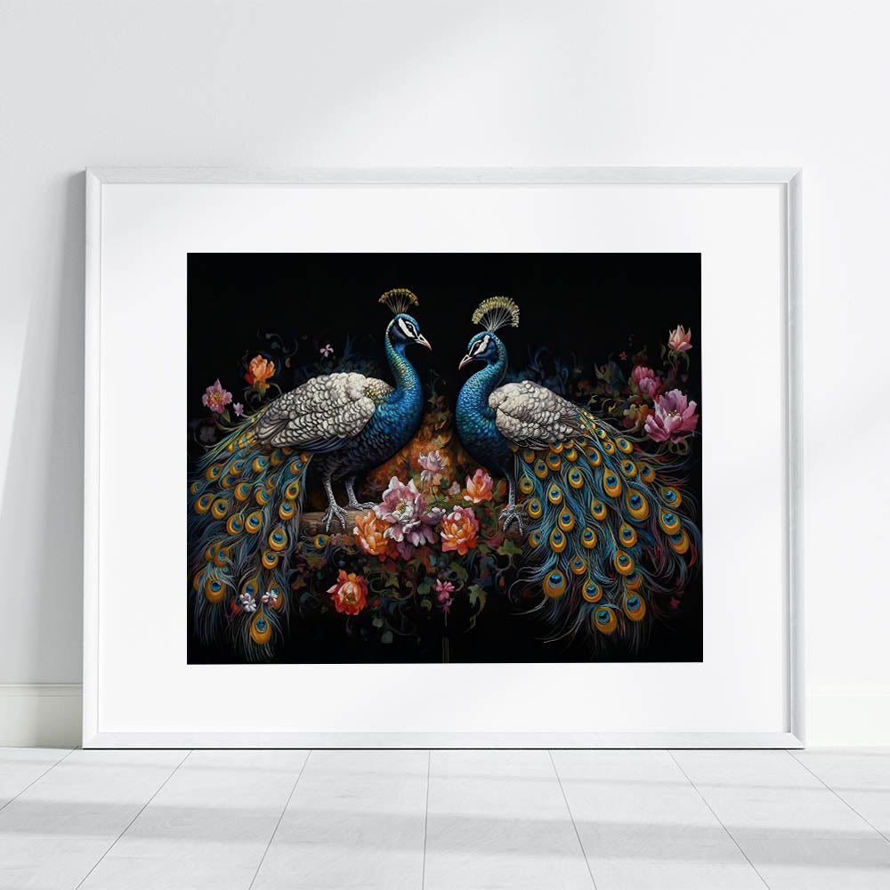 Enhance your home with this Majestic Peacock Pair Wall Art, a stunning piece that beautifully captures the elegance of two peacocks amidst a lush floral background. The vibrant blues and greens of the peacocks’ feathers, combined with the rich floral accents, create a visually captivating artwork that brings luxury and charm to any room. This masterpiece is available in multiple formats, including stretched canvas, framed canvas, acrylic glass, and rolled prints, offering versatile options to suit your decor preferences.