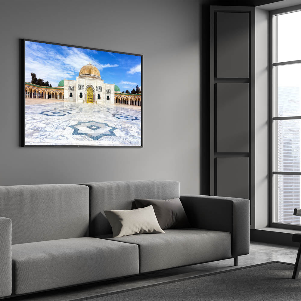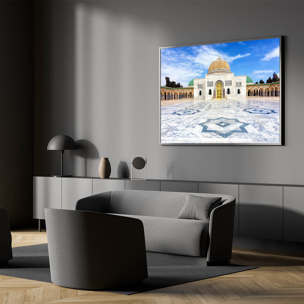 Elevate your space with the elegance and beauty of Tunisian Islamic architecture. This stunning wall art showcases the magnificent courtyard of a mosque, with its intricate patterns, domes, and stunning marble floors. The golden doors and green domes stand out against the bright blue sky, offering a glimpse into the rich cultural heritage and craftsmanship of Tunisia. Perfect for those who appreciate historical and architectural beauty, this artwork brings a sense of serenity and grandeur to any room.