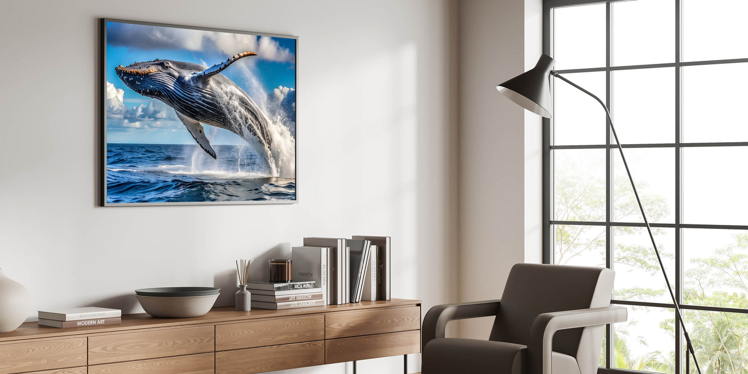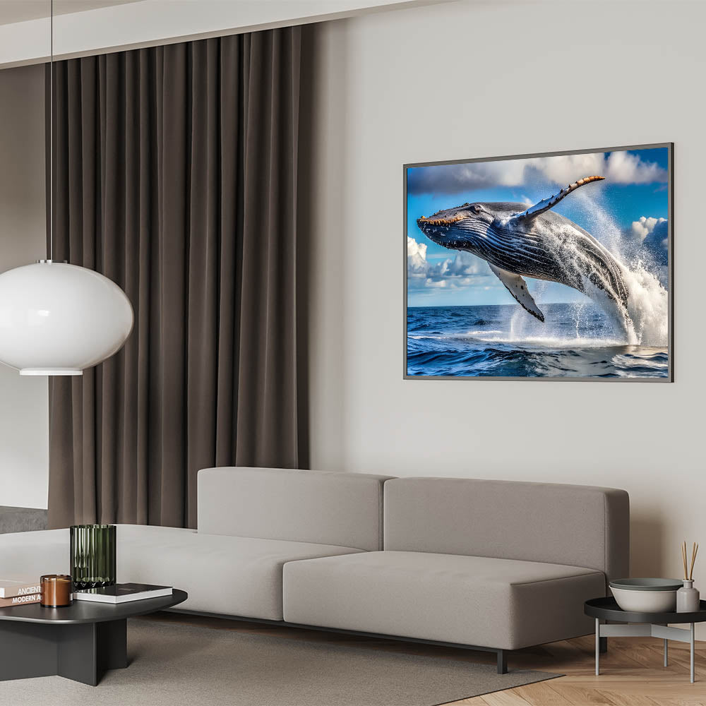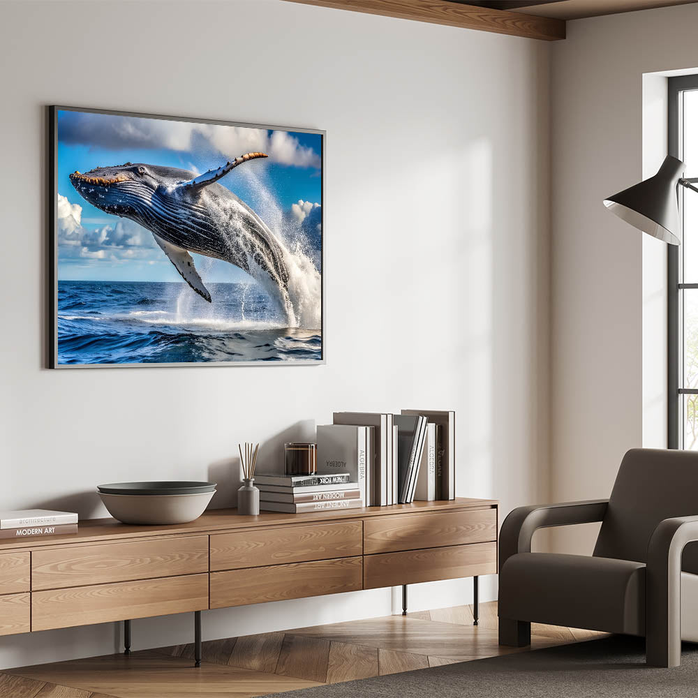 Capture the breathtaking moment of a majestic whale breaching the ocean’s surface with this stunning wall art. The powerful leap of the whale, set against a backdrop of deep blue seas and a cloud-streaked sky, brings the beauty and wonder of marine life into your home. Perfect for wildlife enthusiasts and ocean lovers, this artwork will add an awe-inspiring touch to any space.