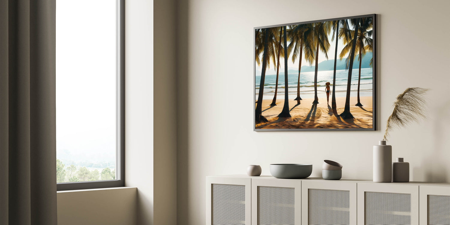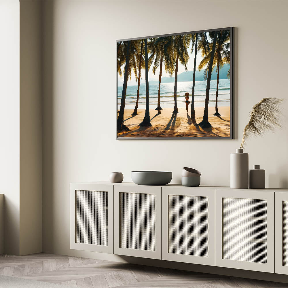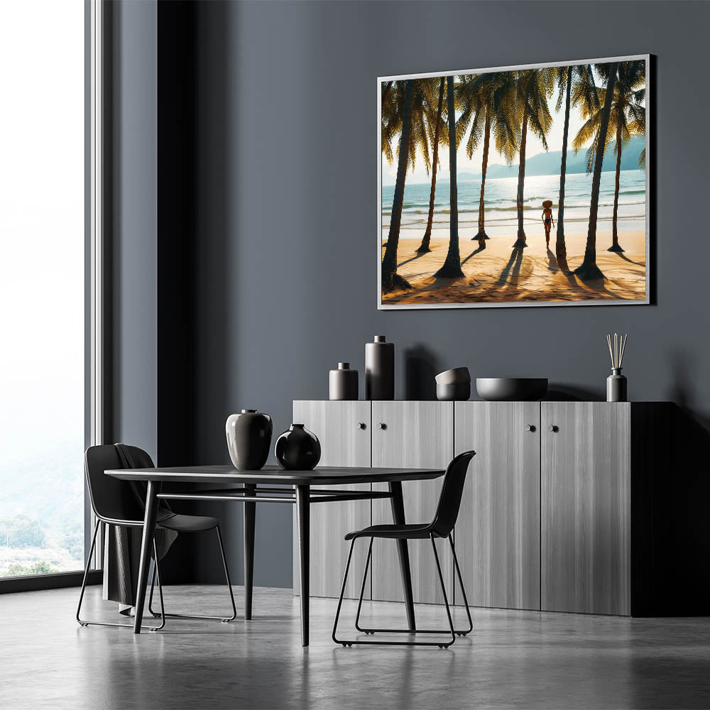 Capture the essence of tropical tranquility with this stunning Malaysia art print, featuring a serene beach scene at sunset. A woman strolls peacefully along the sandy shore, framed by towering palm trees swaying gently in the evening breeze. The warm golden tones of the sand and the soft glow of the sunset over the ocean create a calming atmosphere, making this piece perfect for bringing a touch of relaxation and natural beauty into any space.