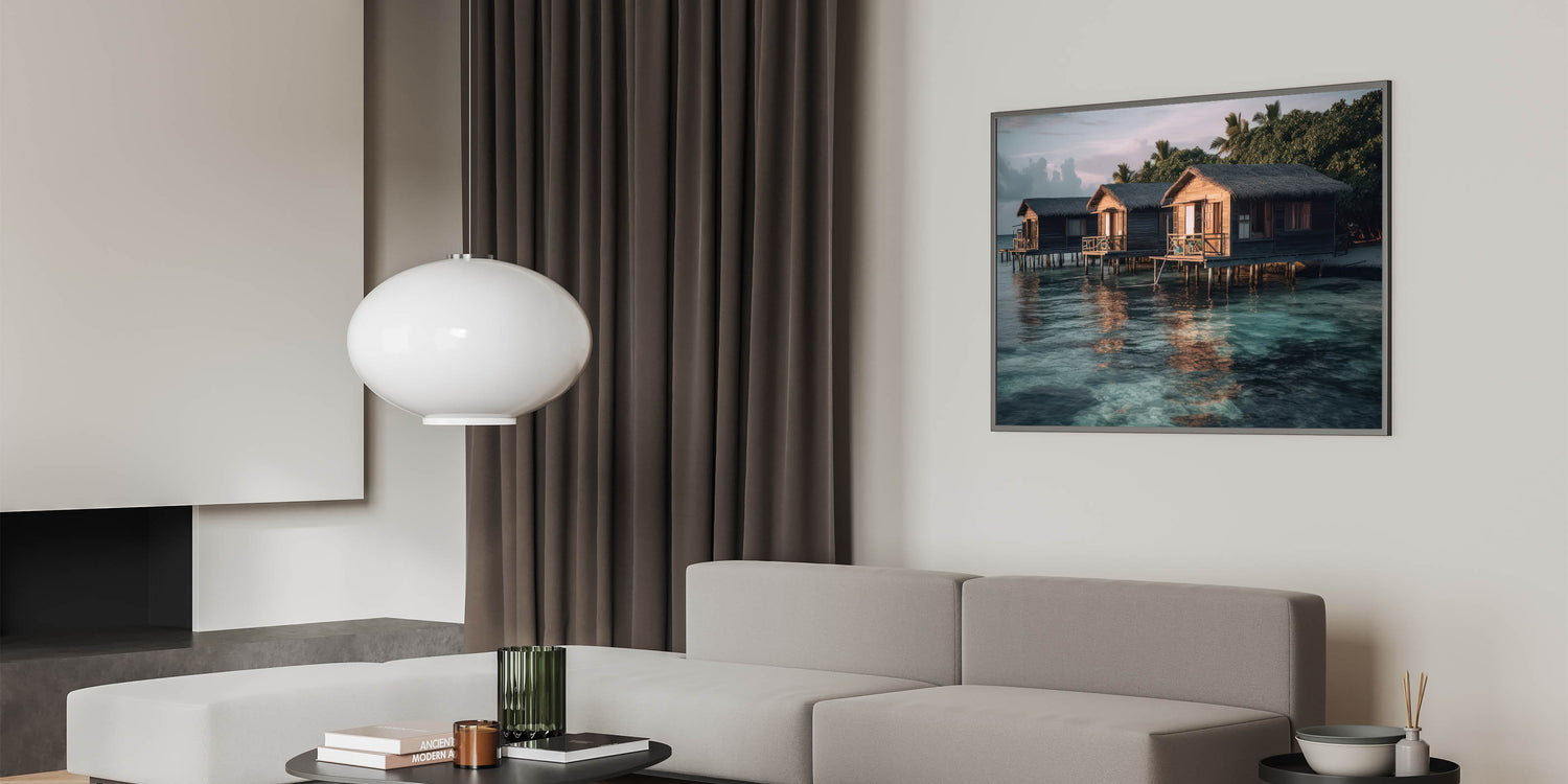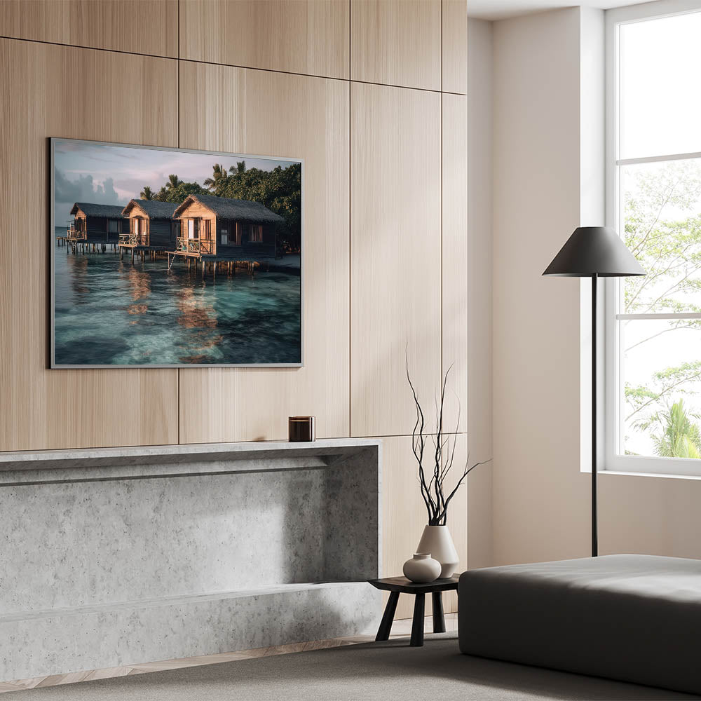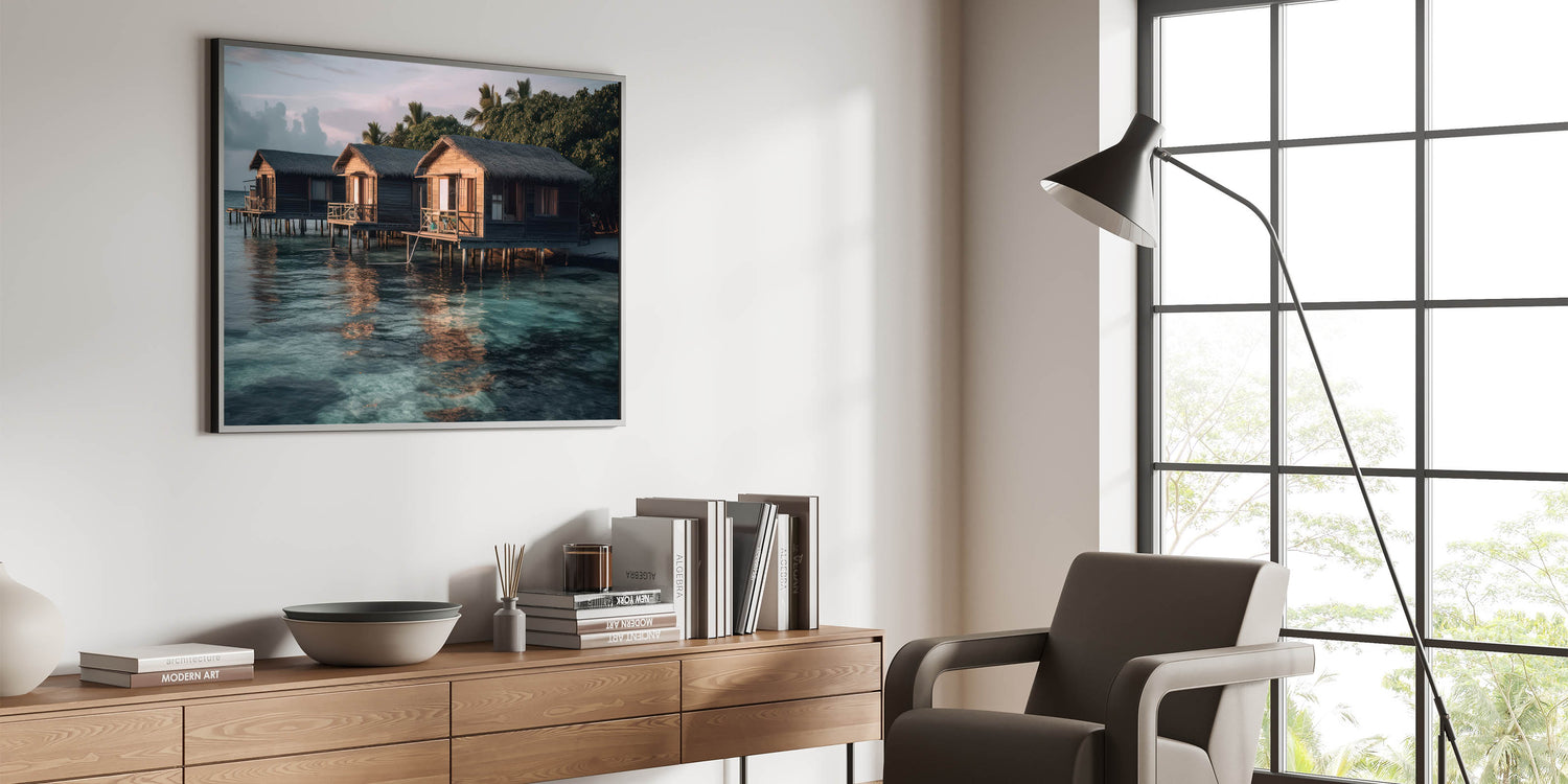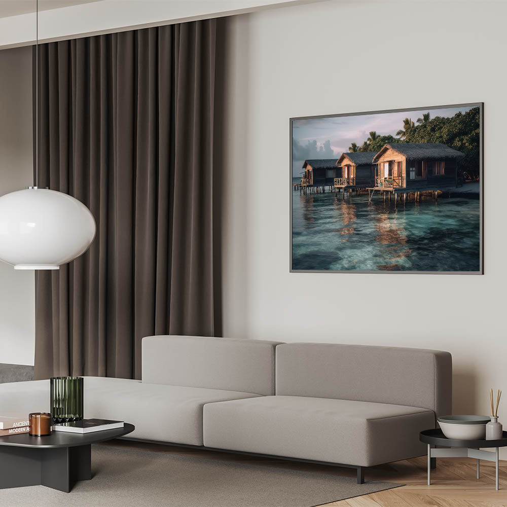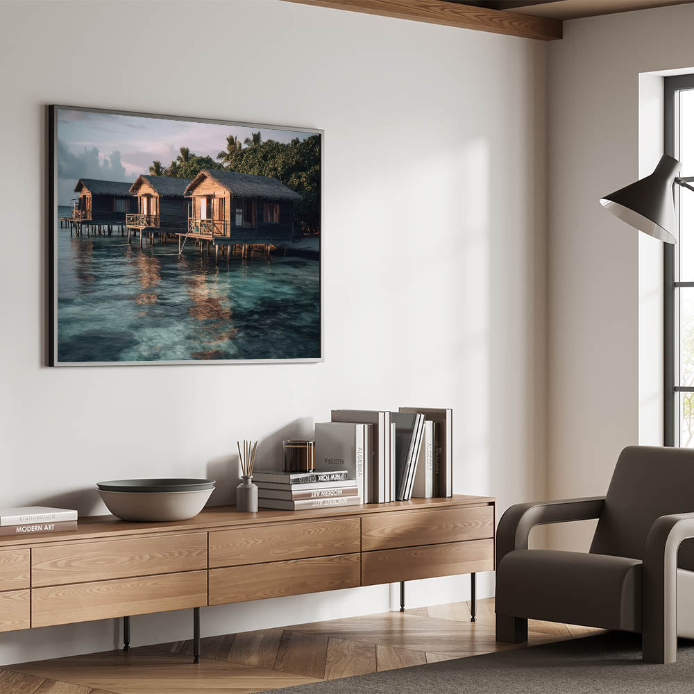 Ideal for creating a peaceful and tropical vibe in your living room, bedroom, or office, this Malaysia art print brings the essence of island living into your space. The overwater bungalows and serene reflections make this piece an inviting focal point that adds warmth and elegance.
