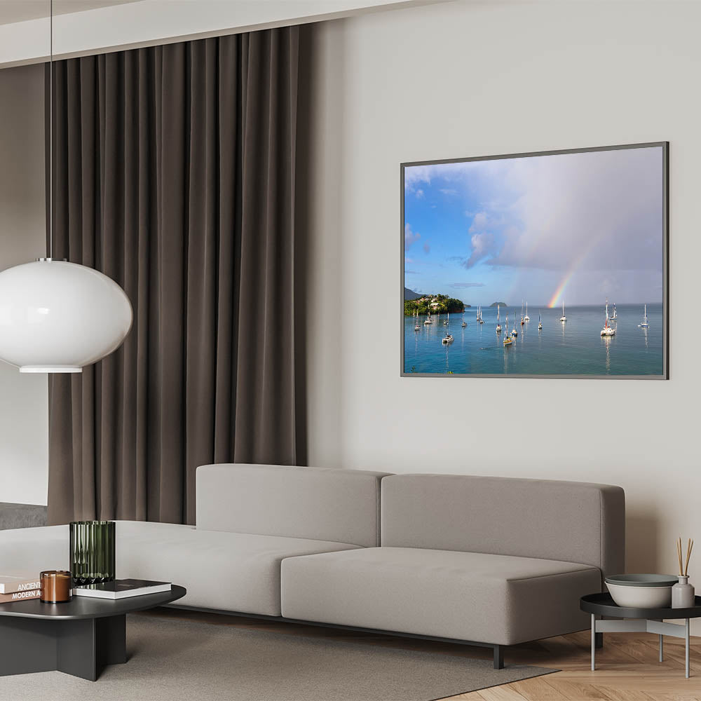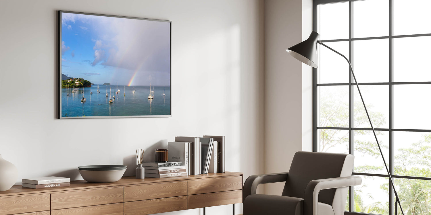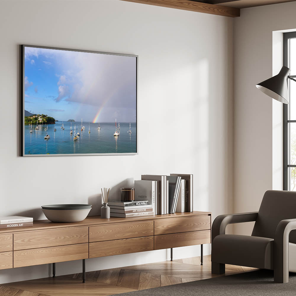 Bring the enchanting beauty of Martinique into your home with this breathtaking canvas print, featuring a serene view of sailboats anchored beneath a vibrant rainbow. The tranquil waters, lush green coastline, and dramatic sky make this piece an ideal addition to any space that craves the calm and beauty of the Caribbean. This stunning artwork captures the magic of a tropical rainstorm passing over the island, leaving behind a colorful rainbow that reflects on the peaceful waters. Available in multiple formats, including canvas, acrylic, and framed prints, this piece brings the serene essence of island life to your walls.