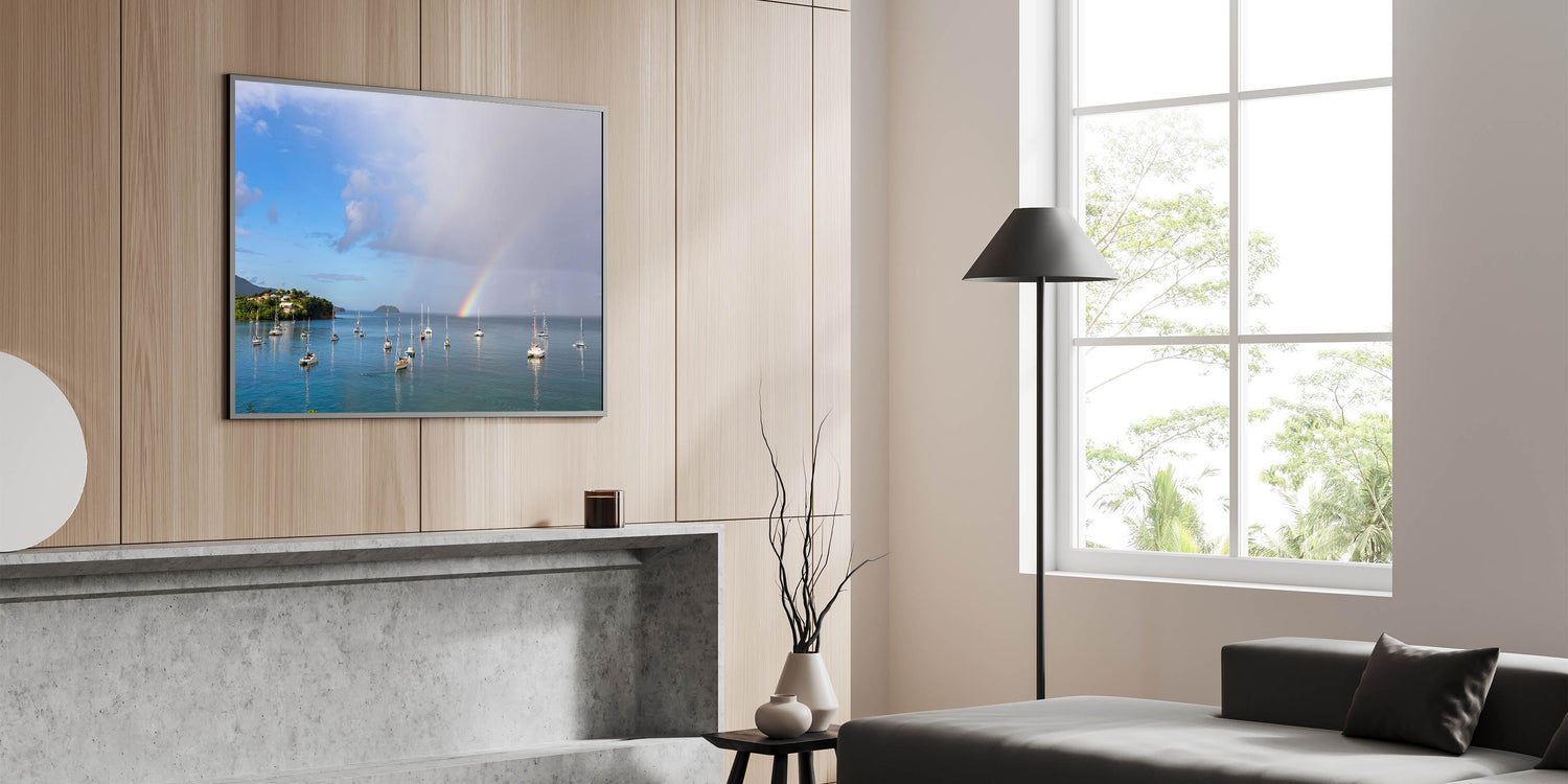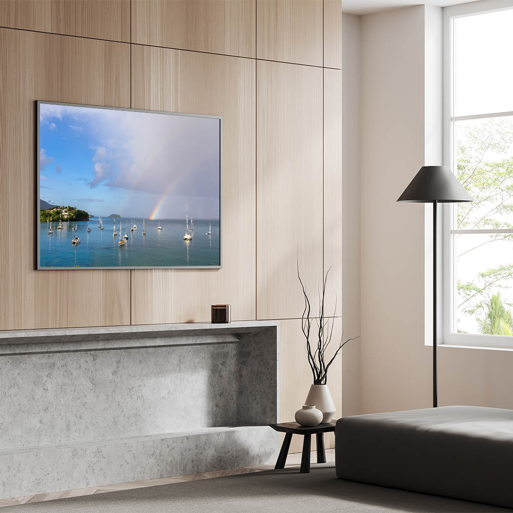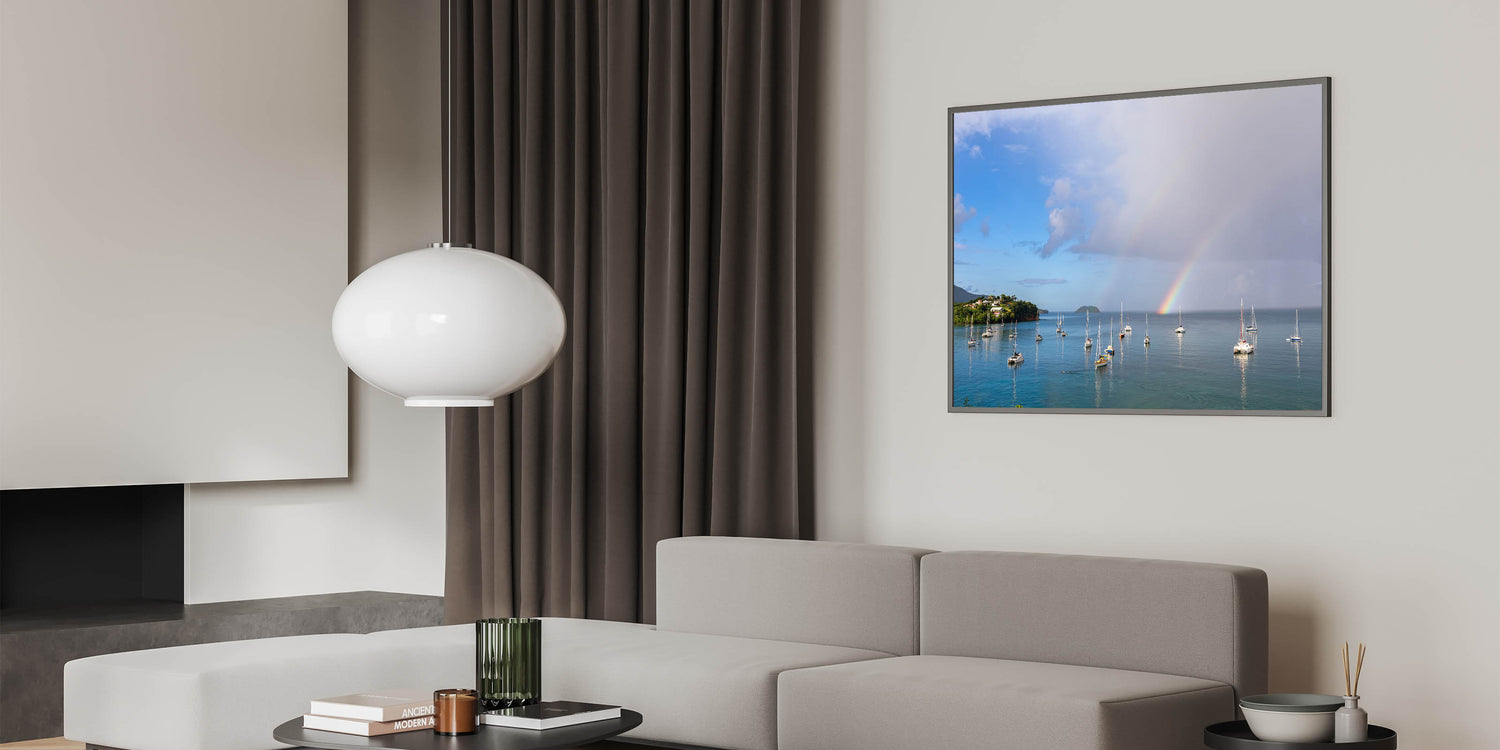 Bring the enchanting beauty of Martinique into your home with this breathtaking canvas print, featuring a serene view of sailboats anchored beneath a vibrant rainbow. The tranquil waters, lush green coastline, and dramatic sky make this piece an ideal addition to any space that craves the calm and beauty of the Caribbean. This stunning artwork captures the magic of a tropical rainstorm passing over the island, leaving behind a colorful rainbow that reflects on the peaceful waters. Available in multiple formats, including canvas, acrylic, and framed prints, this piece brings the serene essence of island life to your walls.