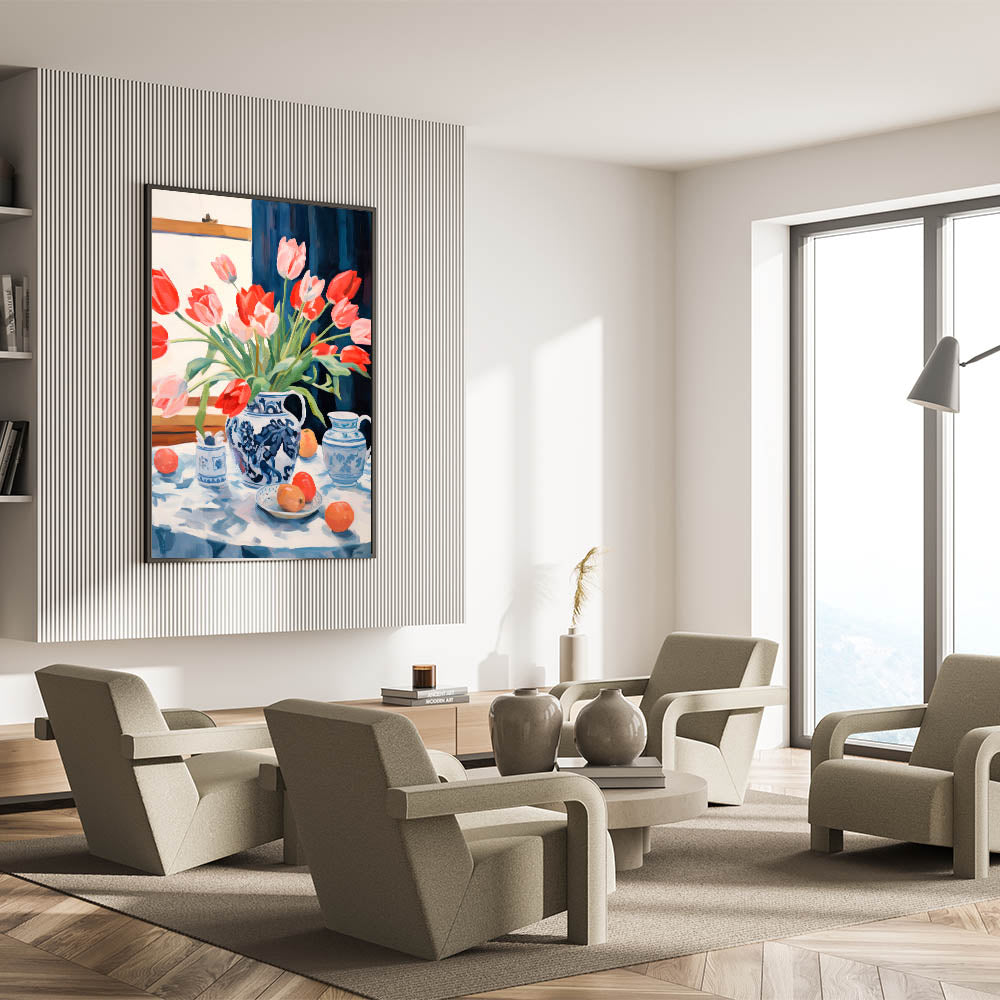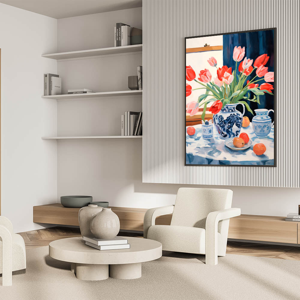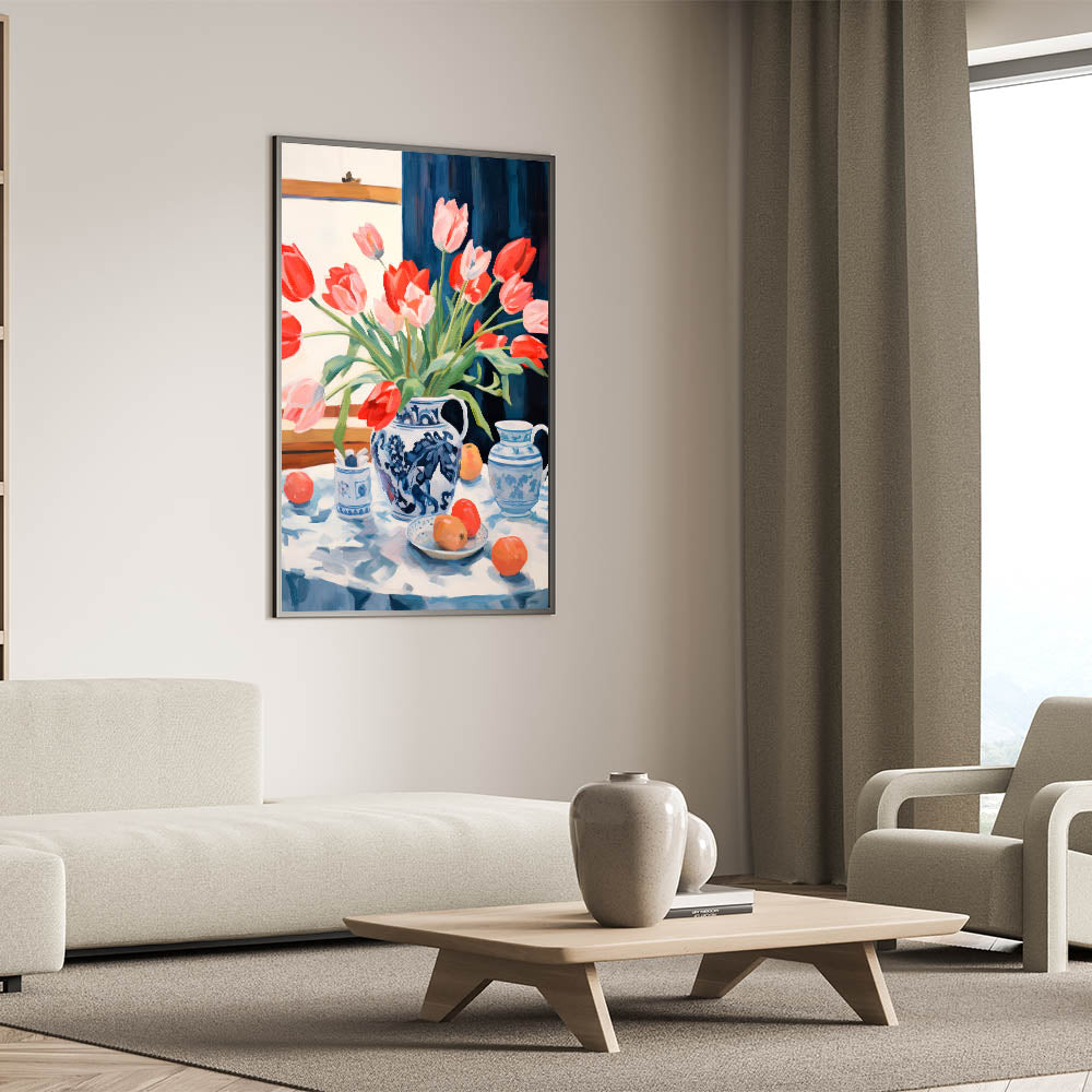 Enhance your home with this beautiful maximalist still life wall art featuring a vibrant bouquet of tulips in a bold, patterned vase. The rich red and pink tulips are arranged in an intricately designed blue-and-white vase, accompanied by subtle fruit accents. This striking composition blends warm and cool tones to create a refreshing and dynamic focal point for any room.