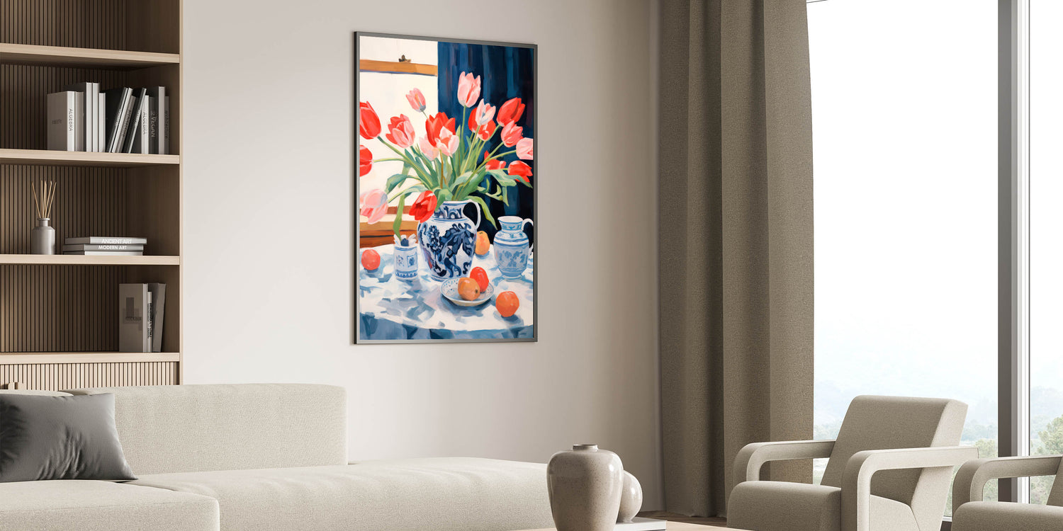 - Bold colors and patterns: The contrasting red and pink tulips with the blue-and-white ceramic vase create a vibrant and engaging piece.