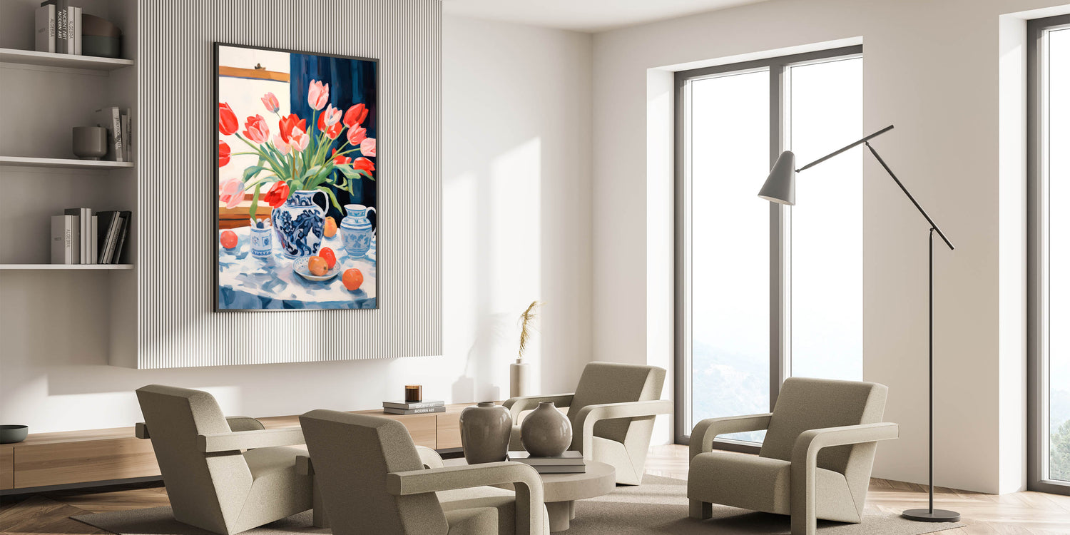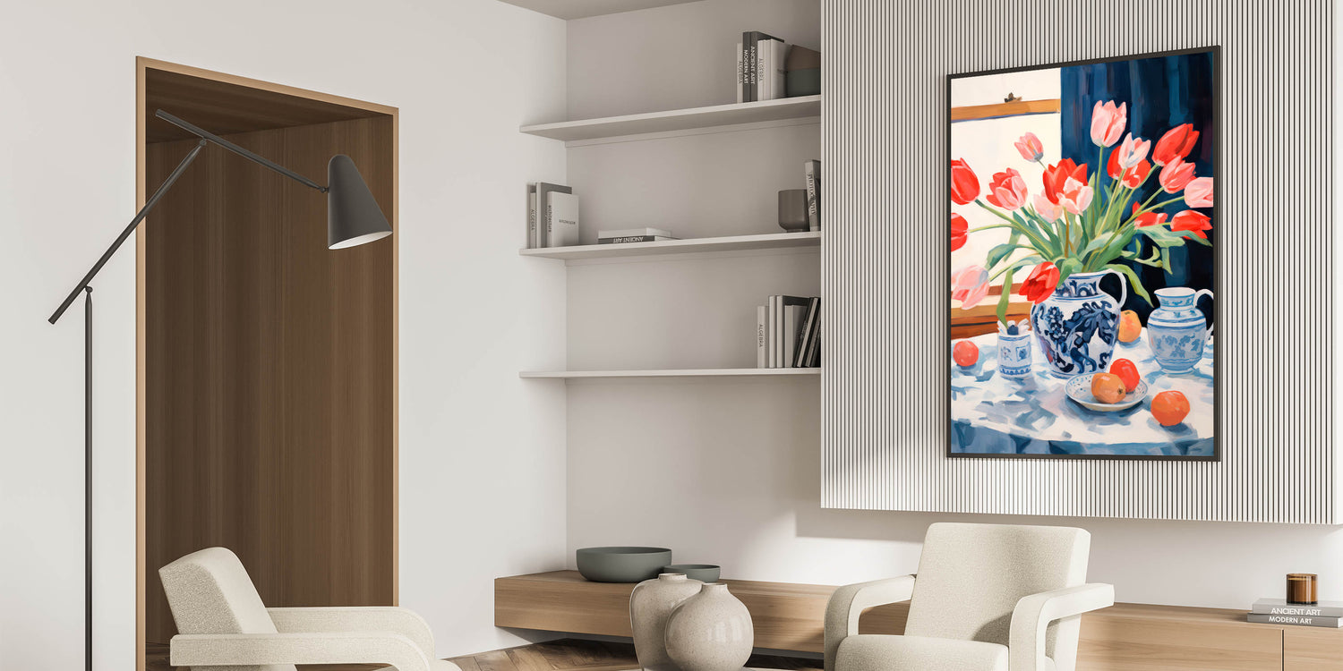Maximalist Floral Still Life Wall Art with Vibrant Tulips and Bold Vase