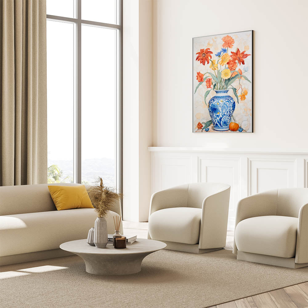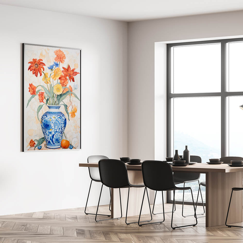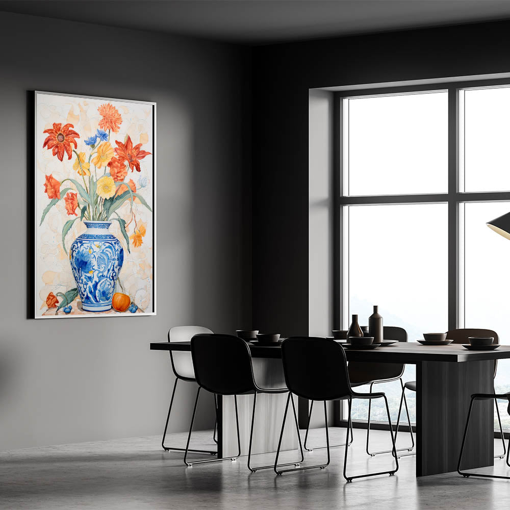 Infuse your home with the beauty of bold maximalism through this stunning floral wall art. Featuring vibrant red, orange, and yellow flowers arranged in an intricate blue-and-white vase, this piece bursts with color and life. The meticulous detailing of the flowers, combined with the ornate design of the vase, creates a visually dynamic composition perfect for those who appreciate expressive, eclectic decor.