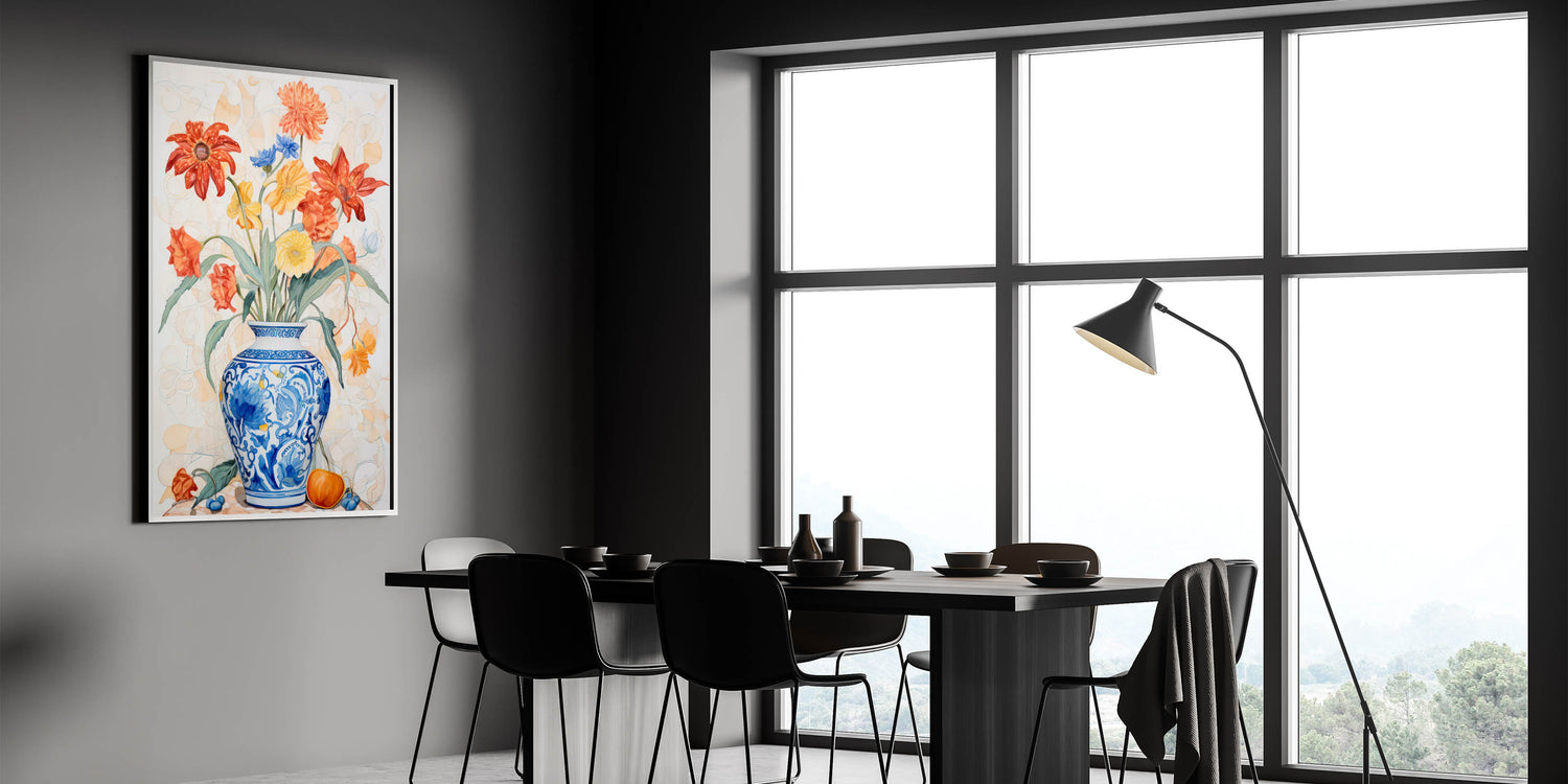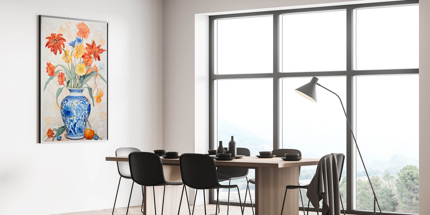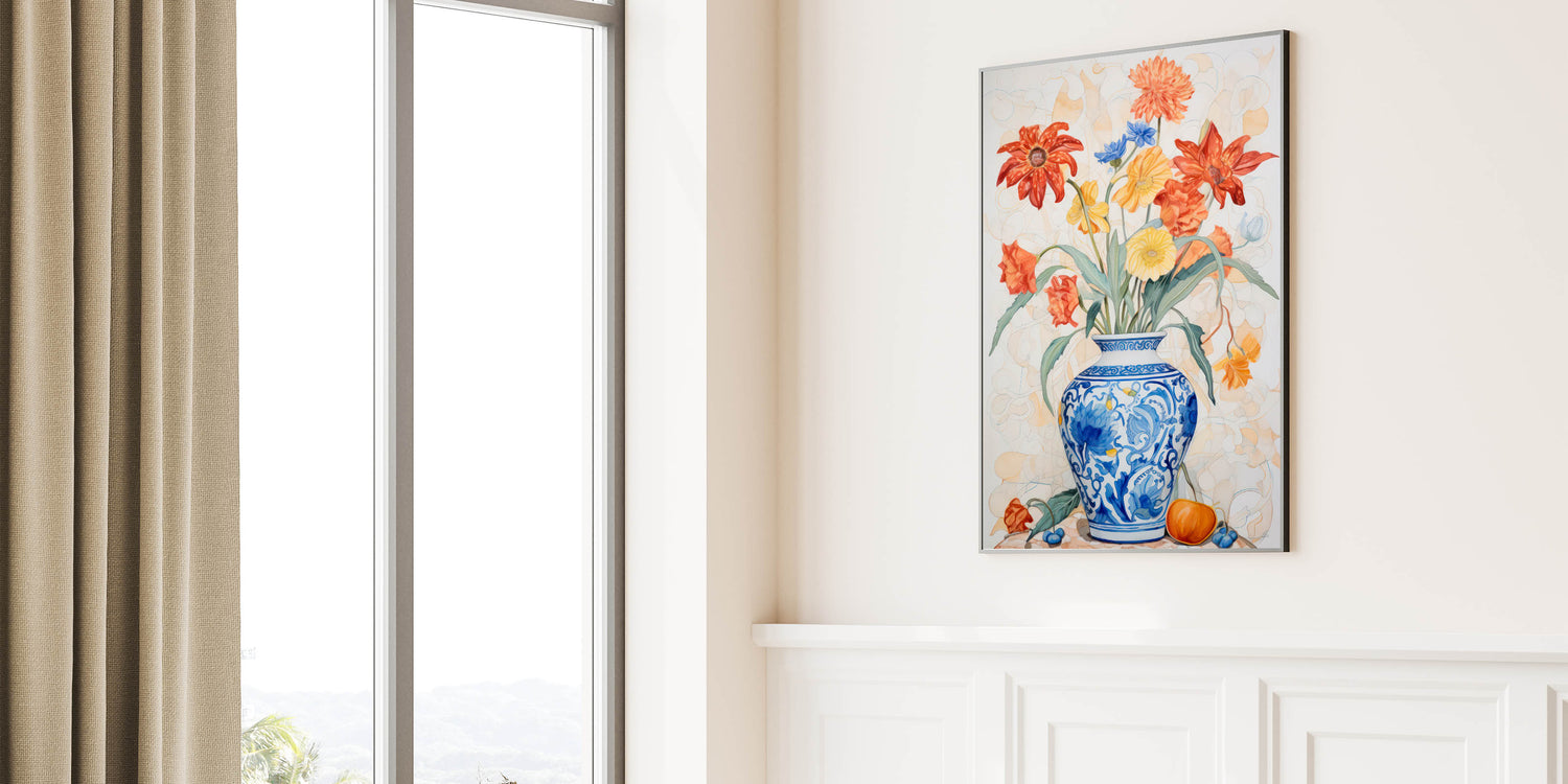 Infuse your home with the beauty of bold maximalism through this stunning floral wall art. Featuring vibrant red, orange, and yellow flowers arranged in an intricate blue-and-white vase, this piece bursts with color and life. The meticulous detailing of the flowers, combined with the ornate design of the vase, creates a visually dynamic composition perfect for those who appreciate expressive, eclectic decor.