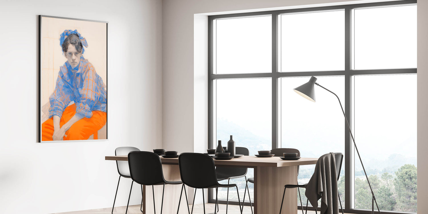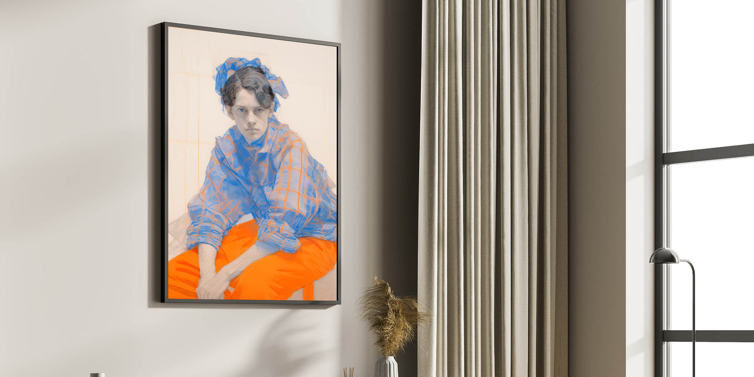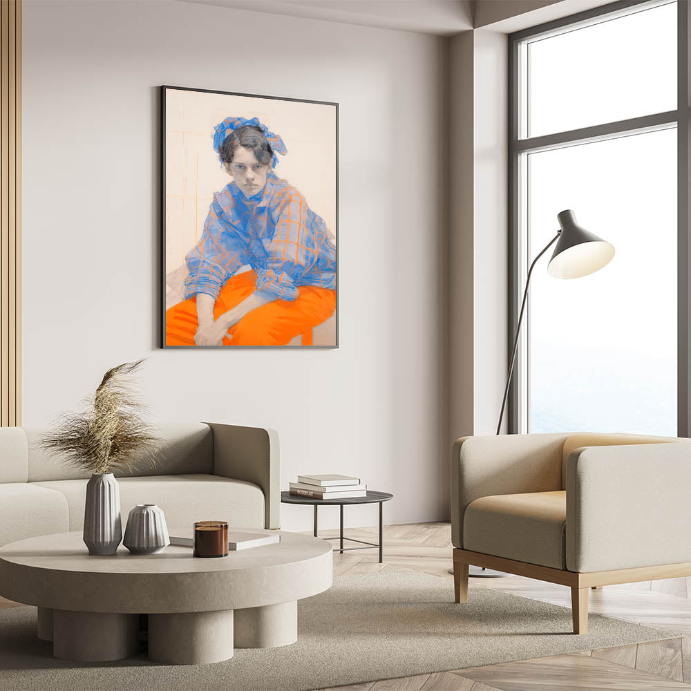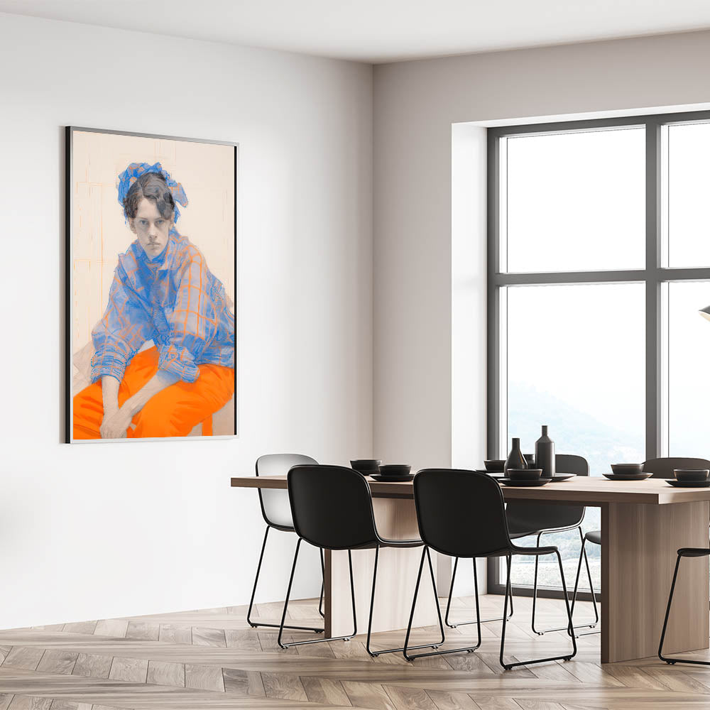 Maximalist Wall Art: Bold Blue and Orange Portrait for Eclectic Spaces