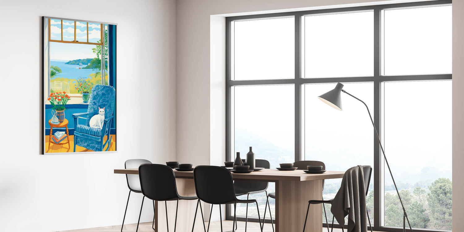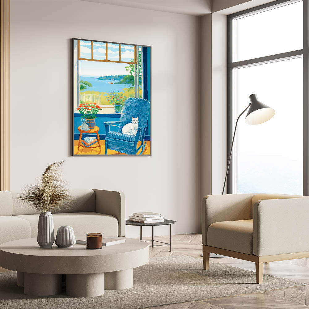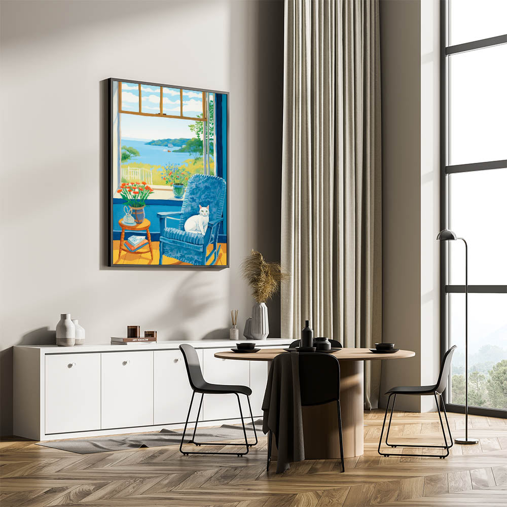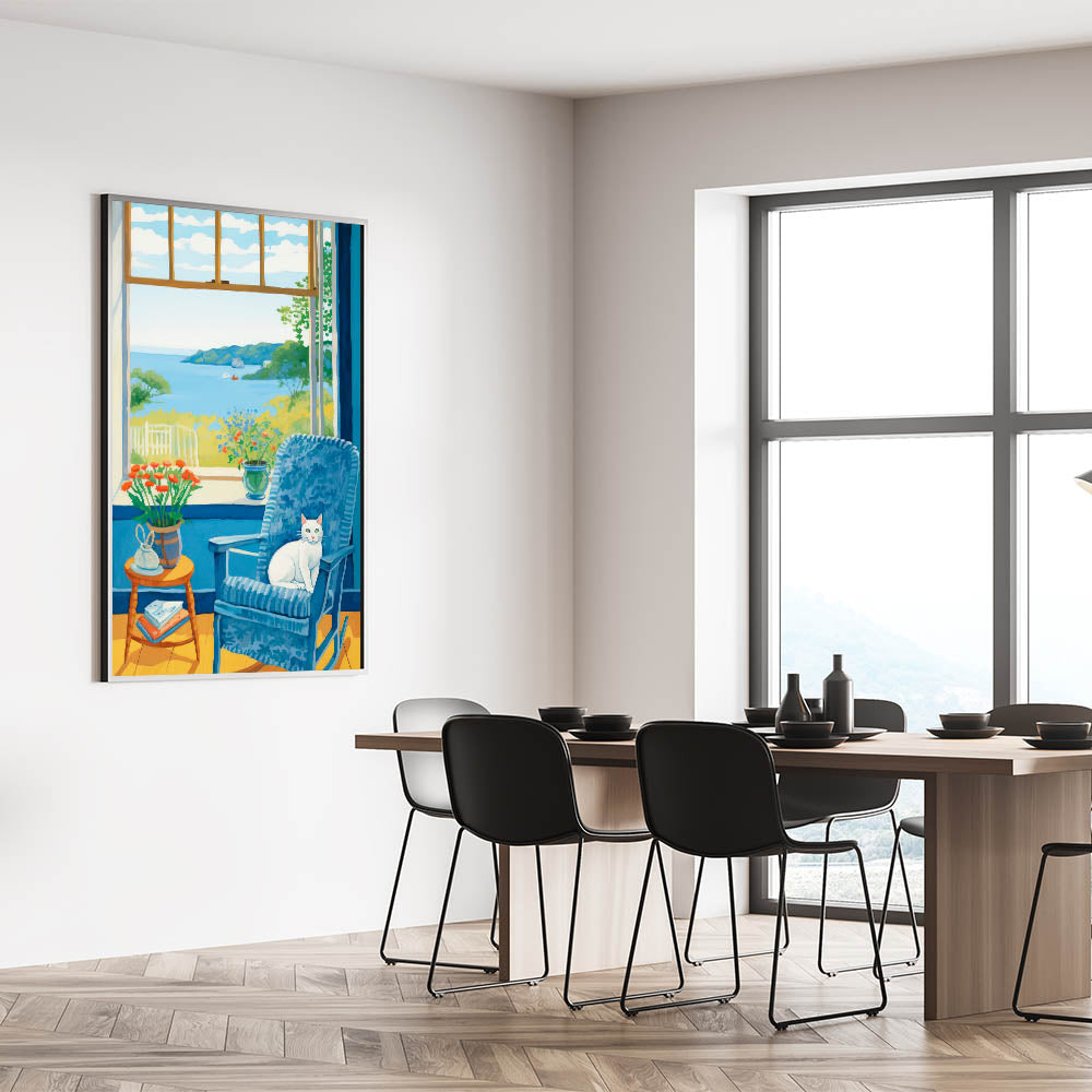 Add a touch of tranquility to your home with this charming Maximalist Wall Art featuring a cozy seaside scene. The artwork captures the peaceful ambiance of a sunny room overlooking the ocean, with a relaxed white cat sitting on a blue chair by the window. The bright colors of the sea, sky, and greenery outside contrast beautifully with the vibrant orange flowers inside, creating a harmonious blend of bold colors and patterns that bring warmth and comfort to any room.