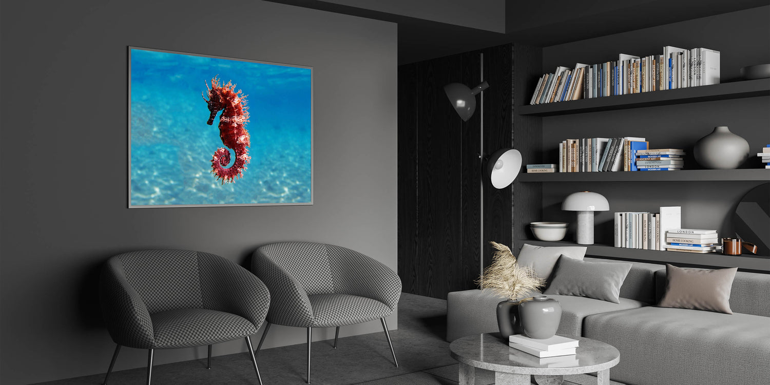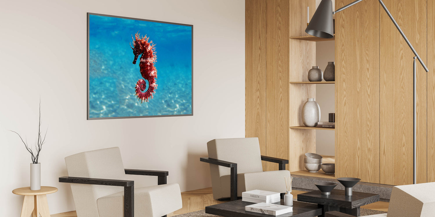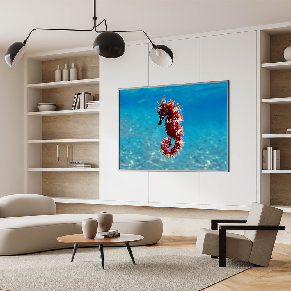 Add a touch of marine elegance to your decor with this striking underwater scene featuring a vibrant seahorse swimming gracefully in the clear Mediterranean Sea. The detailed capture of the seahorse, set against the serene blue of the ocean, makes this piece a perfect choice for anyone seeking Mediterranean-inspired wall decor. This unique artwork is ideal for creating a calming, aquatic atmosphere in any space, from living rooms to bedrooms.