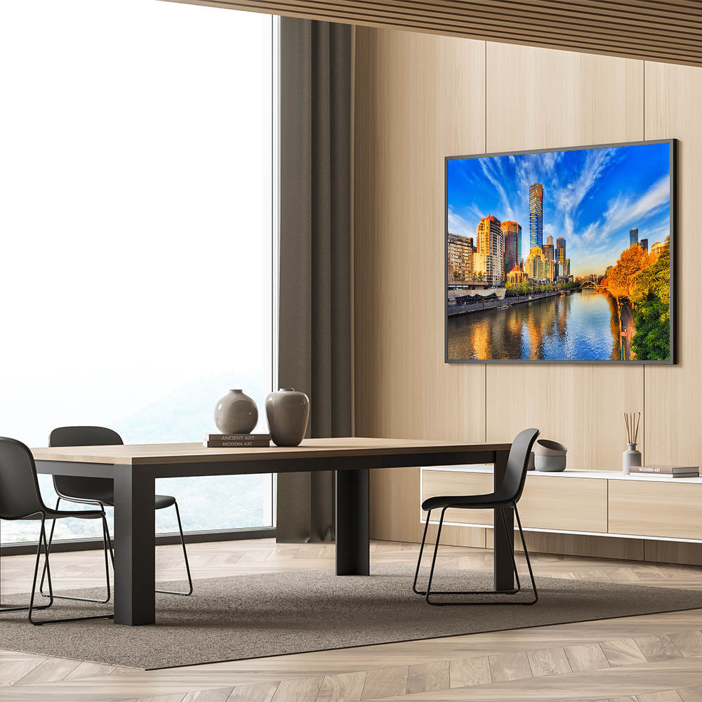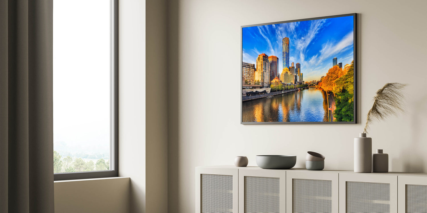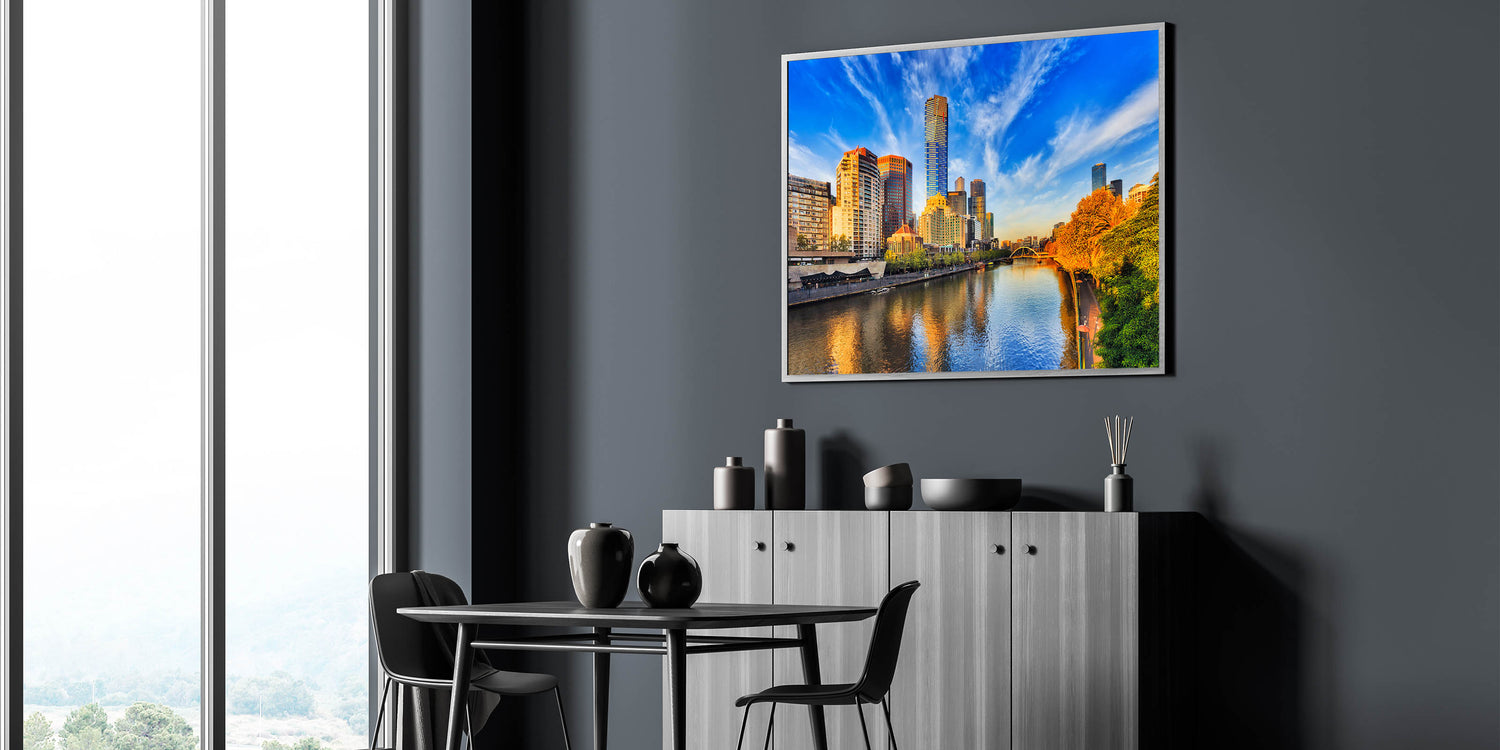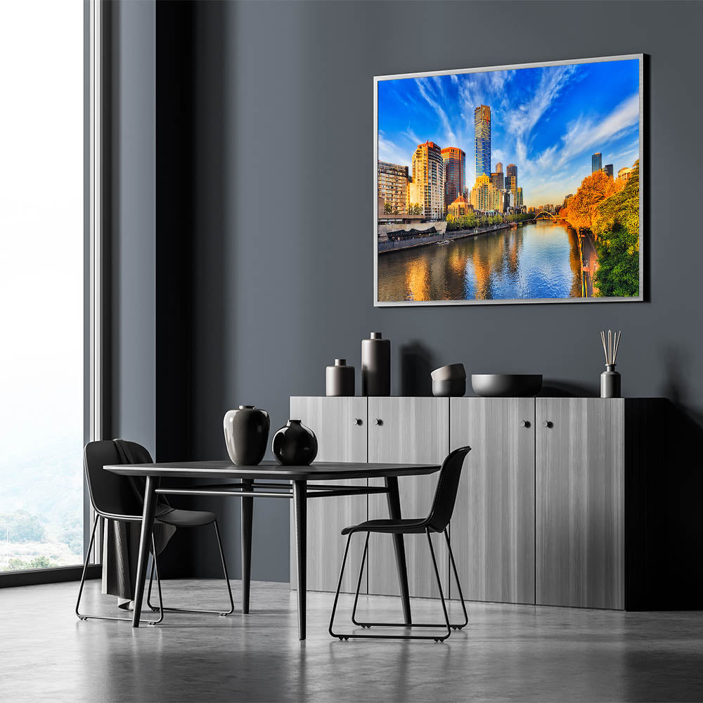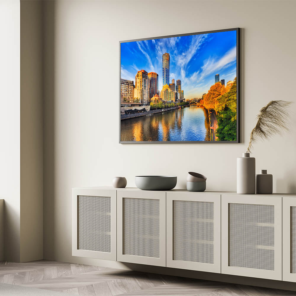Immerse yourself in the radiant beauty of Melbourne's skyline with this vibrant daytime wall art. This stunning piece captures the city’s towering skyscrapers under a brilliant blue sky, with warm sunlight reflecting off the Yarra River. The lush greenery and golden hues of the trees along the riverbank create a perfect balance between nature and urban sophistication. Whether you're a fan of modern architecture or the charm of Melbourne’s cityscape, this canvas print brings the best of the city into your home.