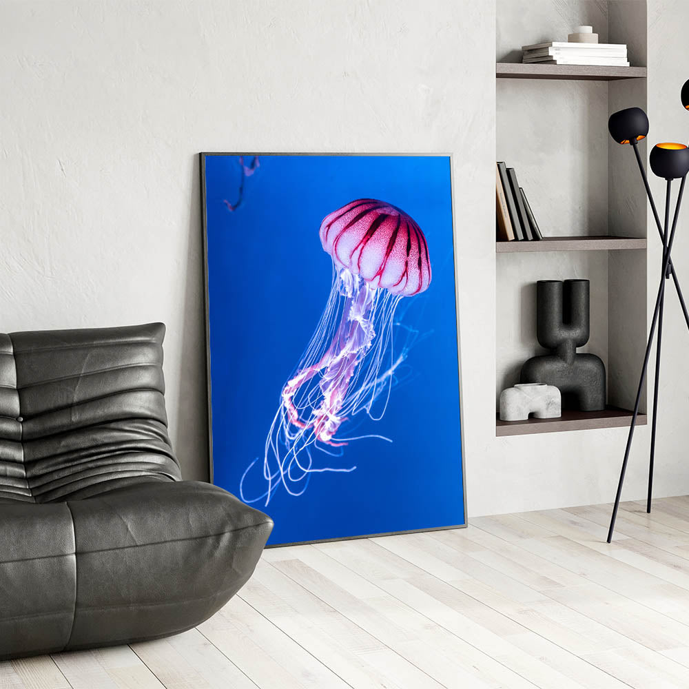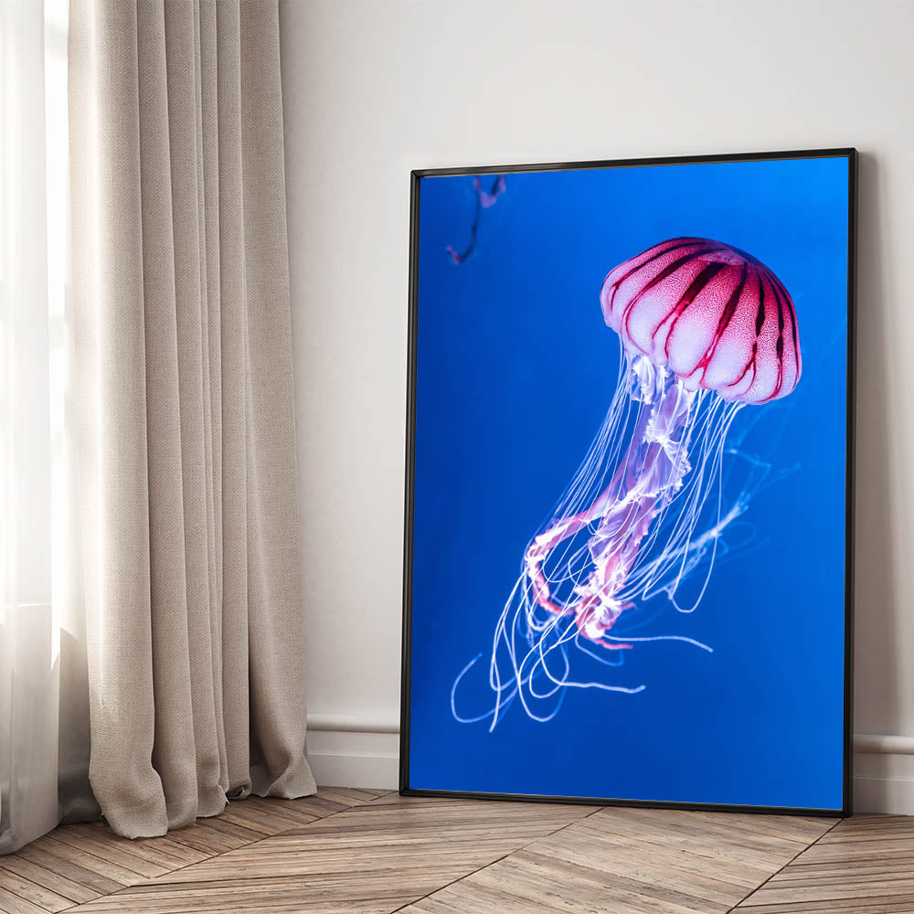 Transform your walls into an underwater sanctuary with this stunning jellyfish art print. Whether you're a fan of sea life or simply looking to add a unique touch to your decor, this piece is sure to impress. Ideal for gifting to ocean lovers or enhancing your own collection of aquatic art.