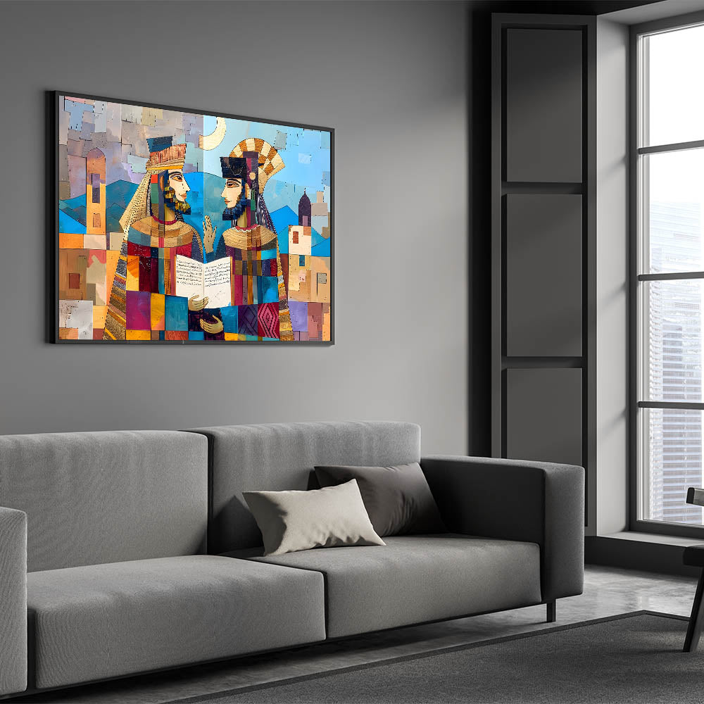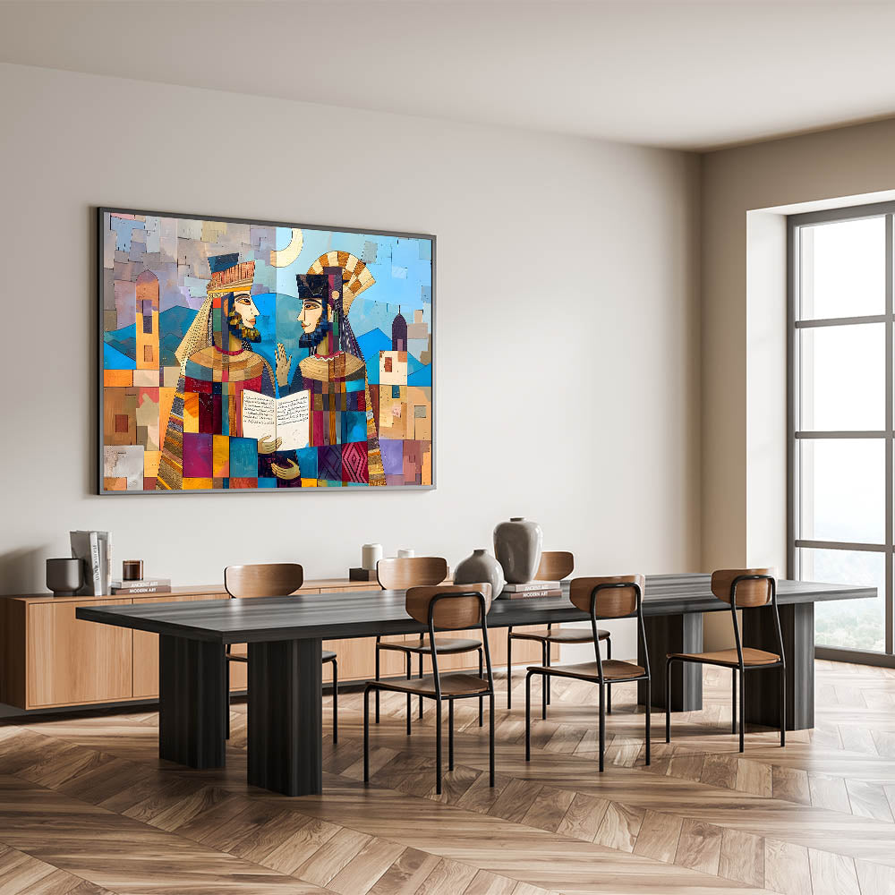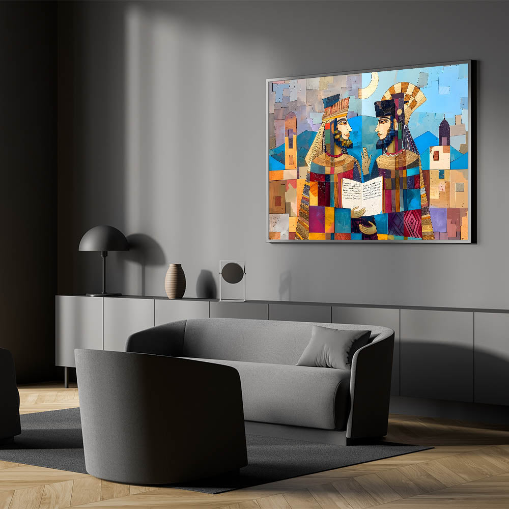 Step into the world of ancient Mesopotamia with this striking Mesopotamian Royalty wall art, featuring two intricately detailed figures dressed in vibrant colors. The geometric patterns and bold blocks of color add a modern, artistic twist to the depiction of historical figures, making this artwork a blend of ancient and contemporary styles. The figures are shown in deep conversation, holding a scroll, which adds a layer of cultural significance to the piece. The detailed backgrounds of the blue mountains and warm city structures enhance the depth of the scene, bringing the story of Mesopotamian royalty to life.