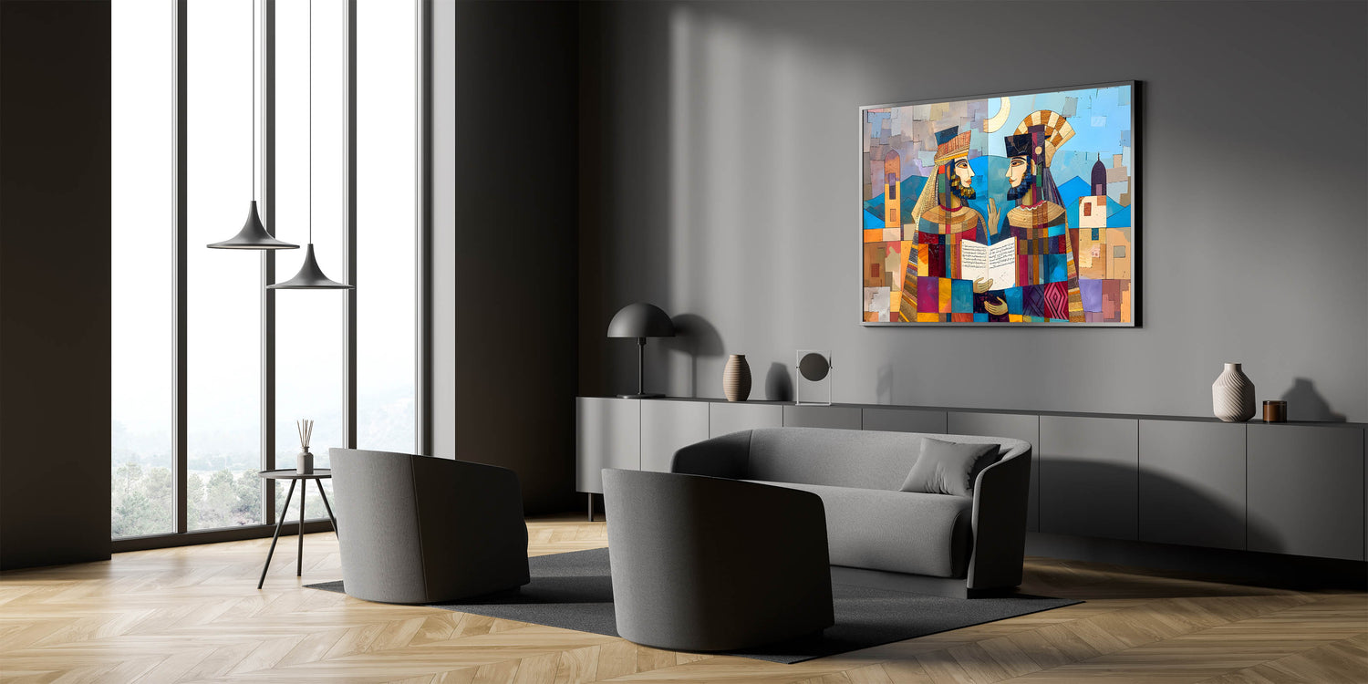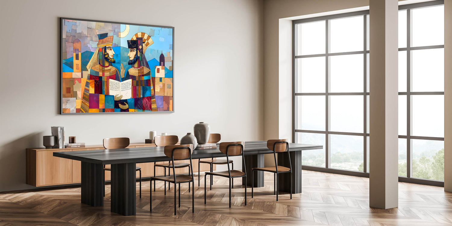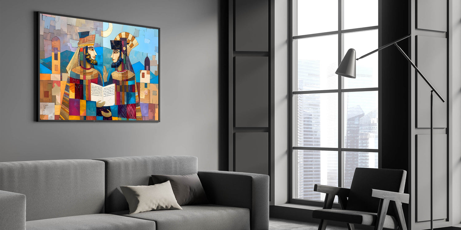 Step into the world of ancient Mesopotamia with this striking Mesopotamian Royalty wall art, featuring two intricately detailed figures dressed in vibrant colors. The geometric patterns and bold blocks of color add a modern, artistic twist to the depiction of historical figures, making this artwork a blend of ancient and contemporary styles. The figures are shown in deep conversation, holding a scroll, which adds a layer of cultural significance to the piece. The detailed backgrounds of the blue mountains and warm city structures enhance the depth of the scene, bringing the story of Mesopotamian royalty to life.