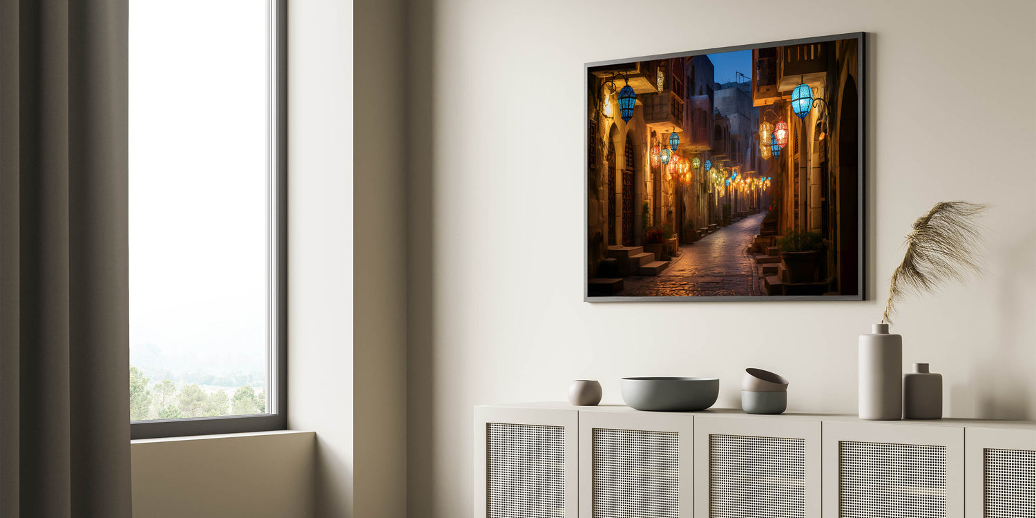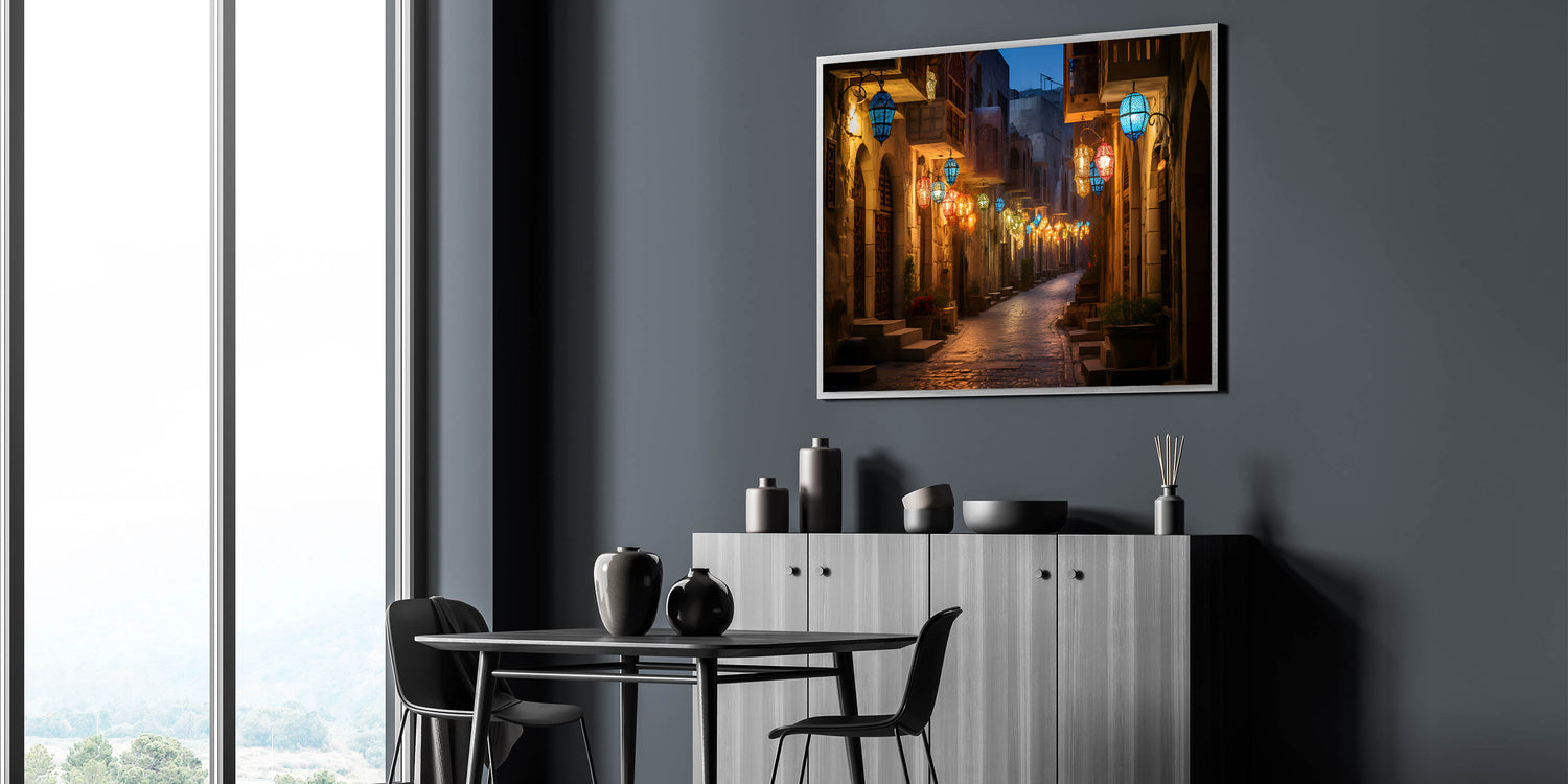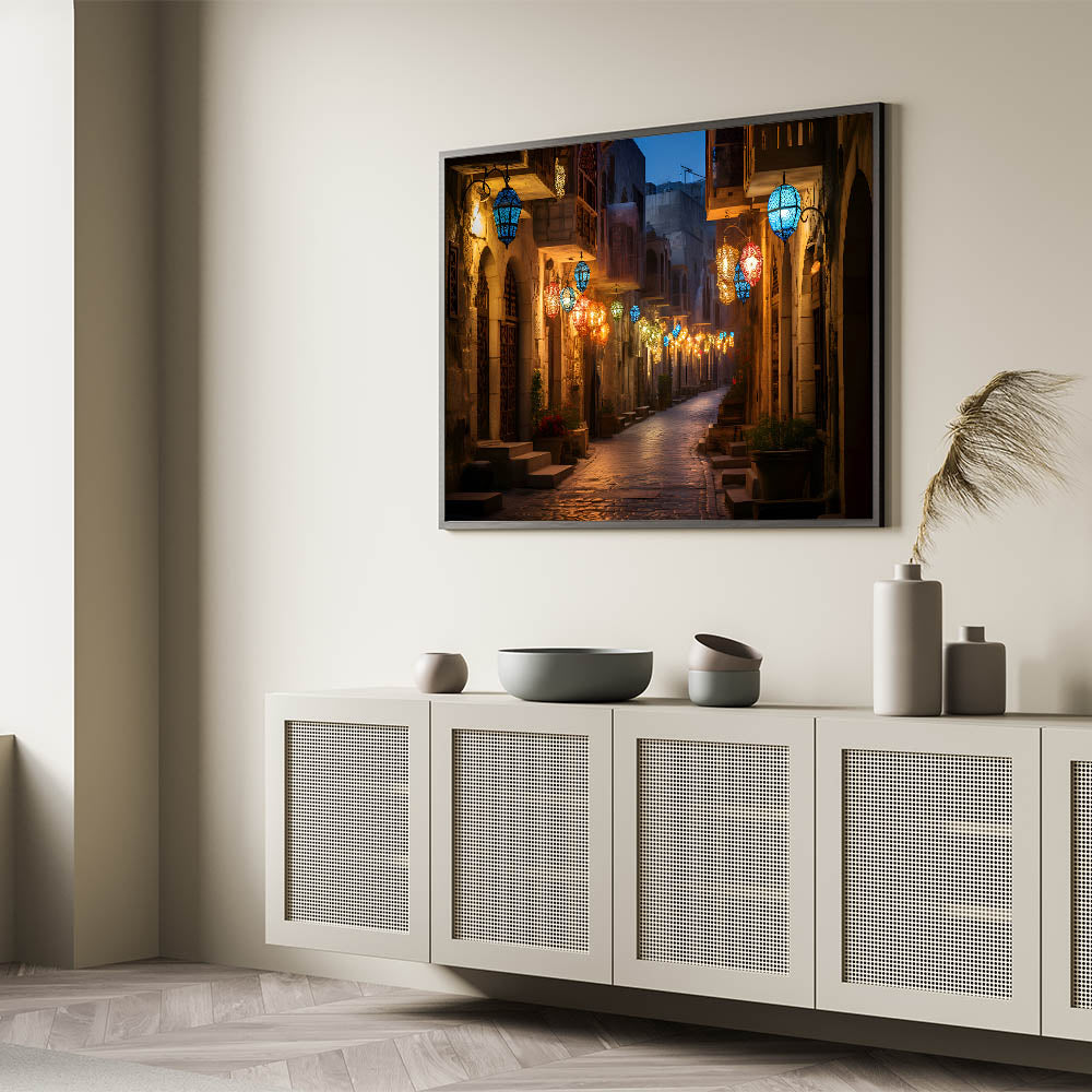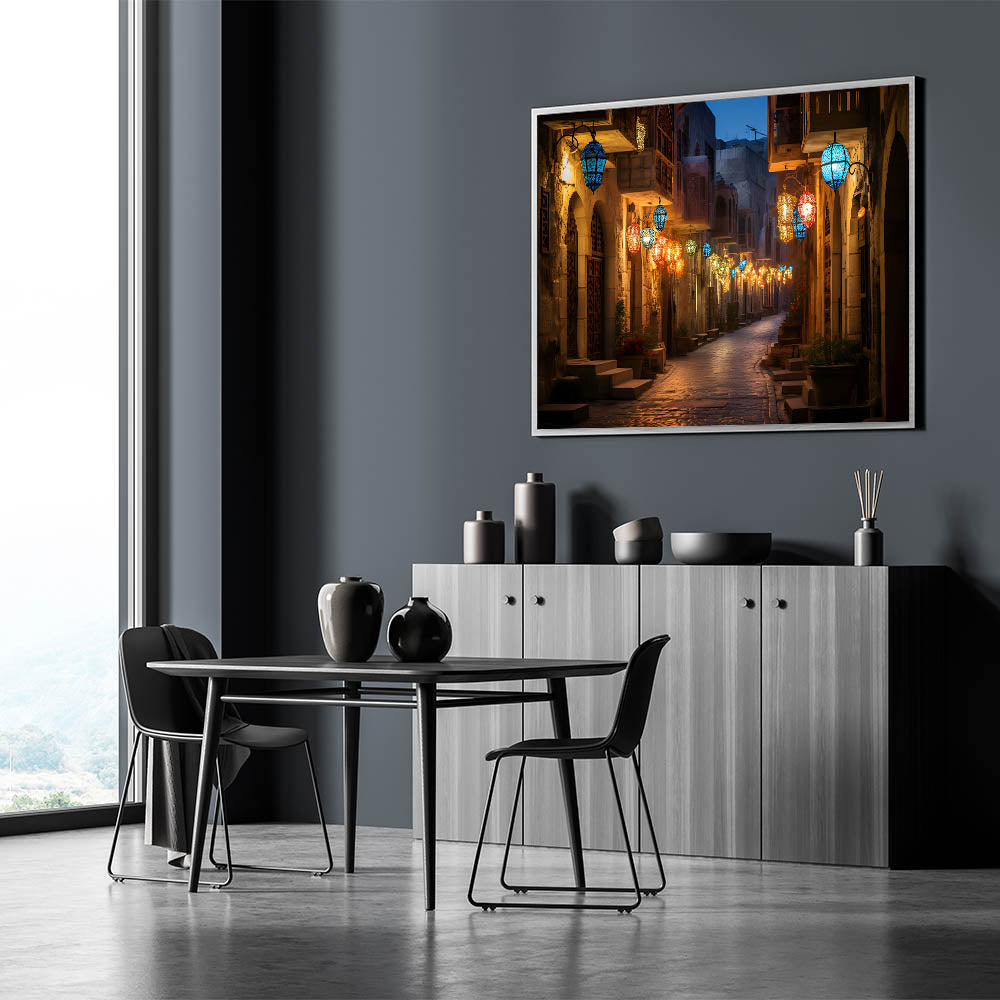 Immerse yourself in the magical ambiance of a Middle Eastern street adorned with vibrant lanterns in this stunning wall art. This high-quality Dubai canvas print captures the warm glow of colorful lanterns hanging from traditional buildings, casting soft light onto the cobblestone path below. Perfect for those who appreciate cultural street photography and atmospheric decor, this artwork brings a sense of wonder and serenity to any room. Whether you're looking for unique Middle Eastern decor or an enchanting nighttime cityscape, this piece will transform your space into a peaceful retreat.