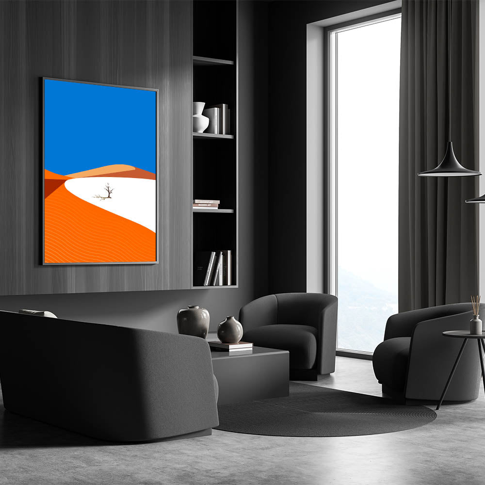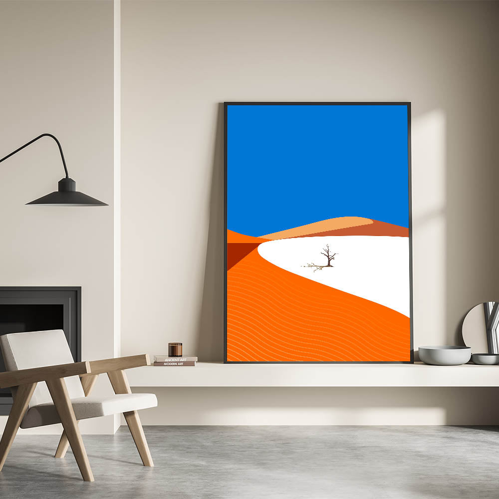 Add a touch of modern style to your home with this vibrant minimalist Oman wall art, featuring a striking desert landscape. With bold orange dunes set against a vivid blue sky, this high-quality Oman wall art captures the essence of the Arabian Peninsula’s natural beauty in a contemporary and abstract style. Perfect for those who appreciate clean lines and bold colors, this artwork brings the warmth of the desert into any room.
