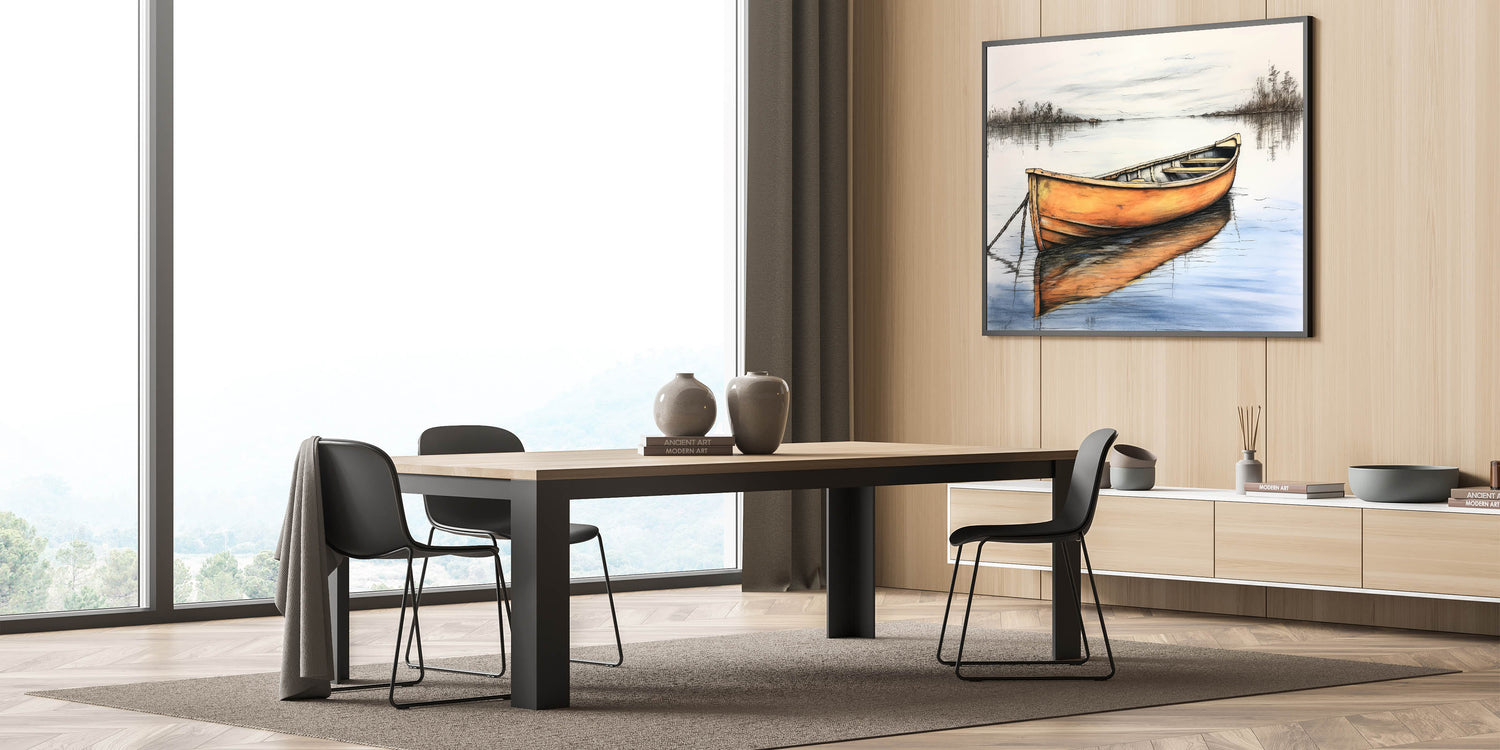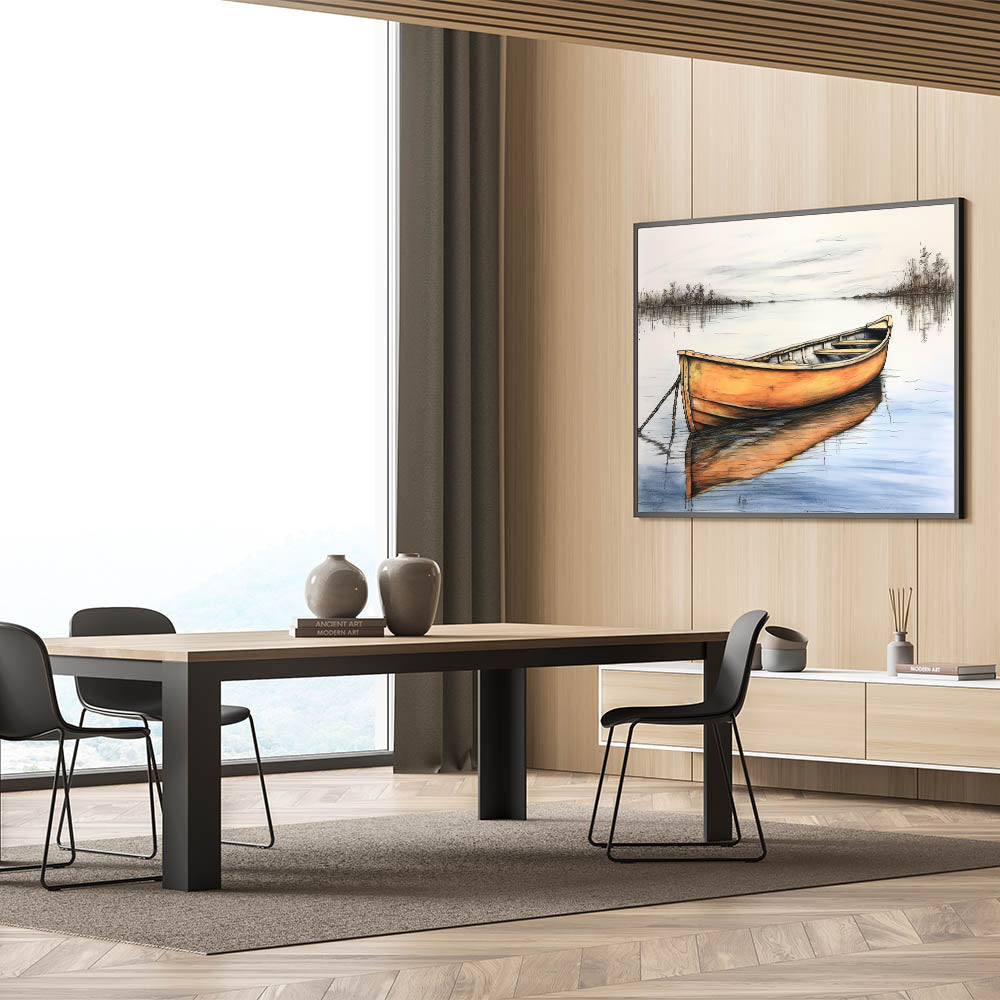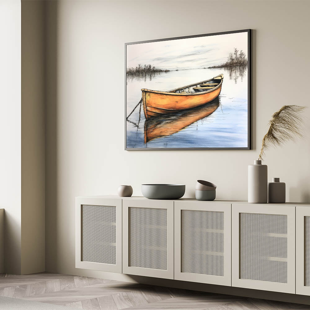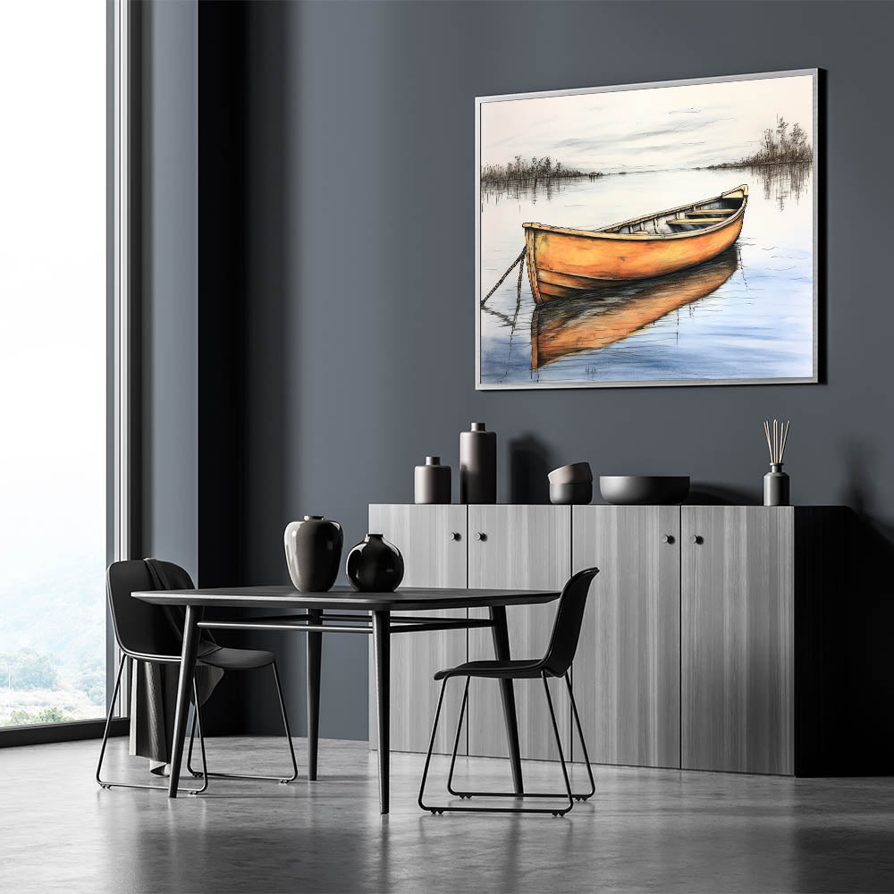 Embrace the beauty of simplicity with this minimalist rowboat wall art. This captivating piece features a lone wooden rowboat gently tethered on still waters, surrounded by a calm and serene environment. The clean lines and subtle color palette create a peaceful atmosphere, making this artwork a perfect addition to any space seeking tranquility and elegance. Ideal for contemporary or coastal-themed interiors, this handcrafted boat art is available in a variety of high-quality materials, including Stretched Canvas, Framed Canvas, Acrylic Glass, Framed Acrylic Glass, Framed Print, Rolled Canvas, and Rolled Print.