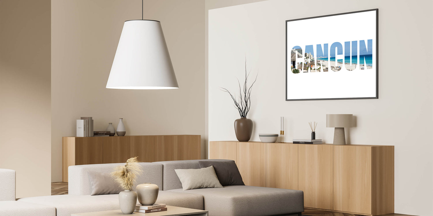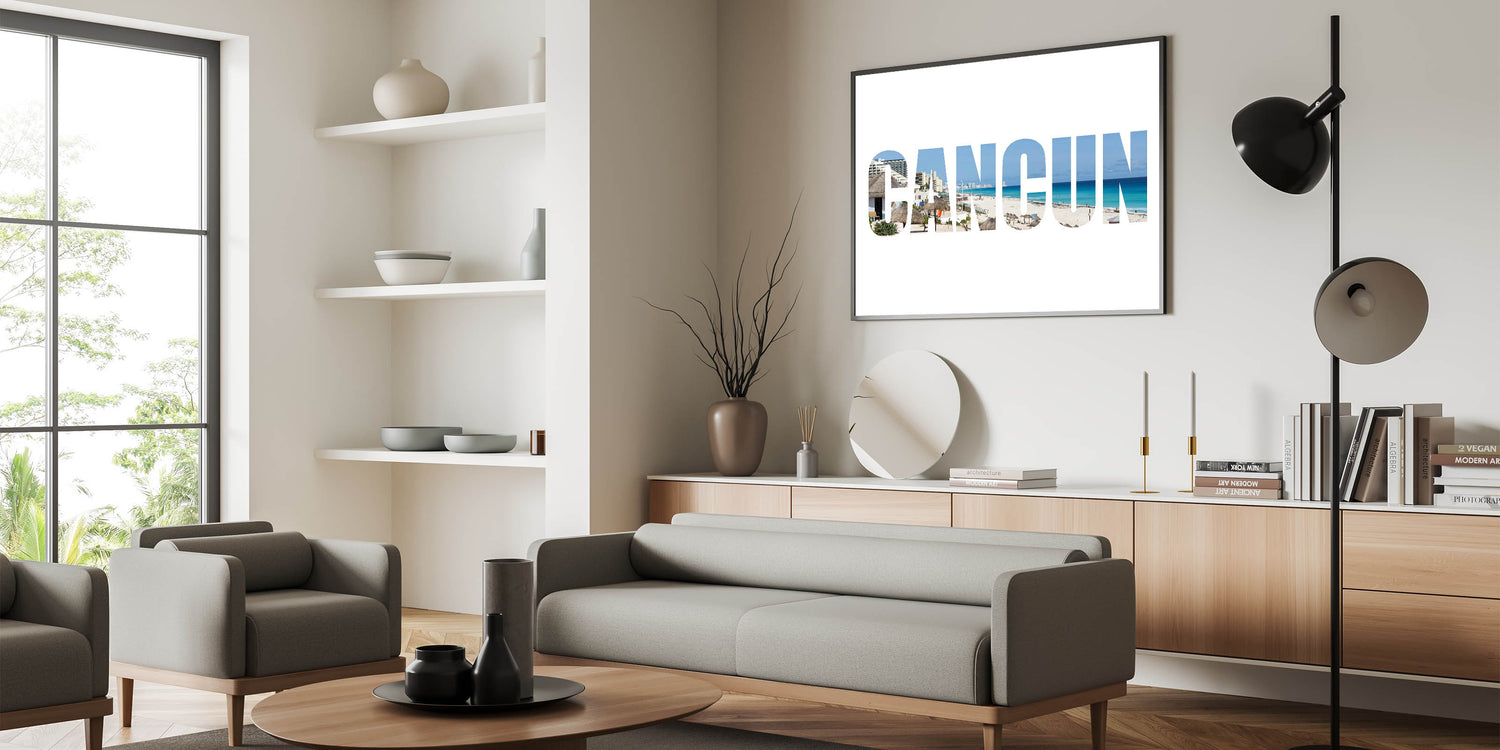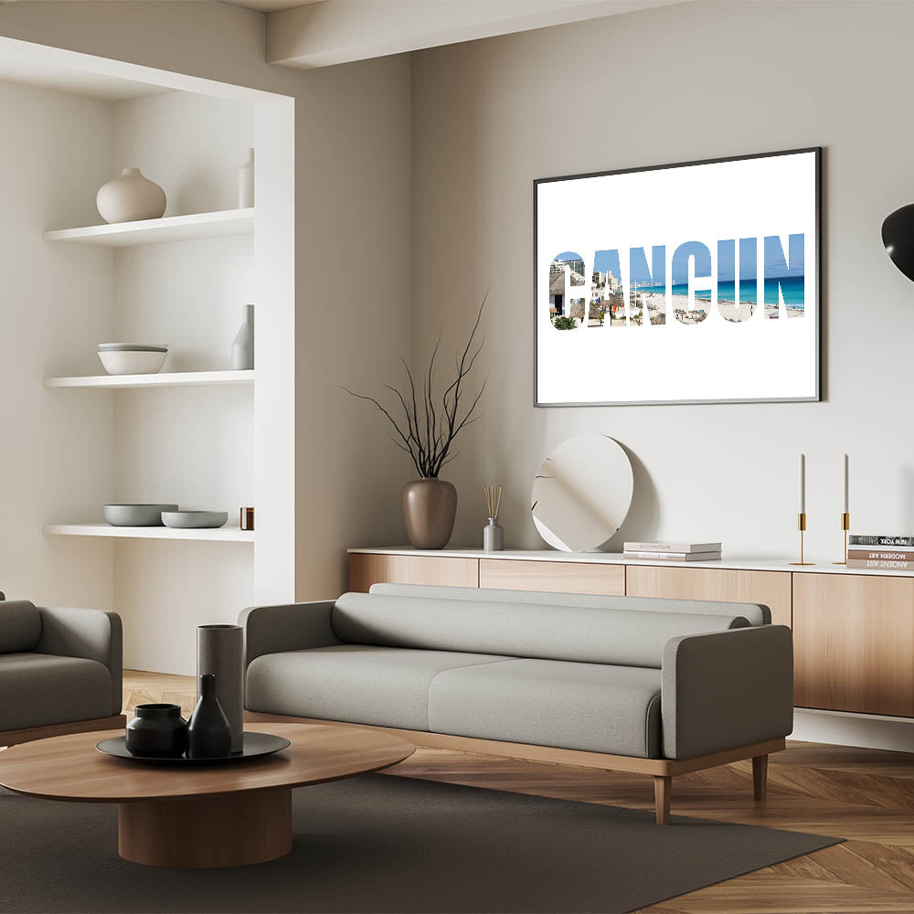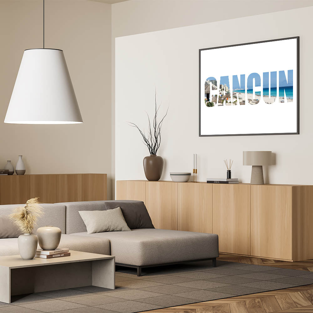 This Cancun photography print with its modern typography is an excellent addition for those seeking to balance contemporary style with tropical flair. The clean lines and vibrant beach scene make it an eye-catching piece in any room.