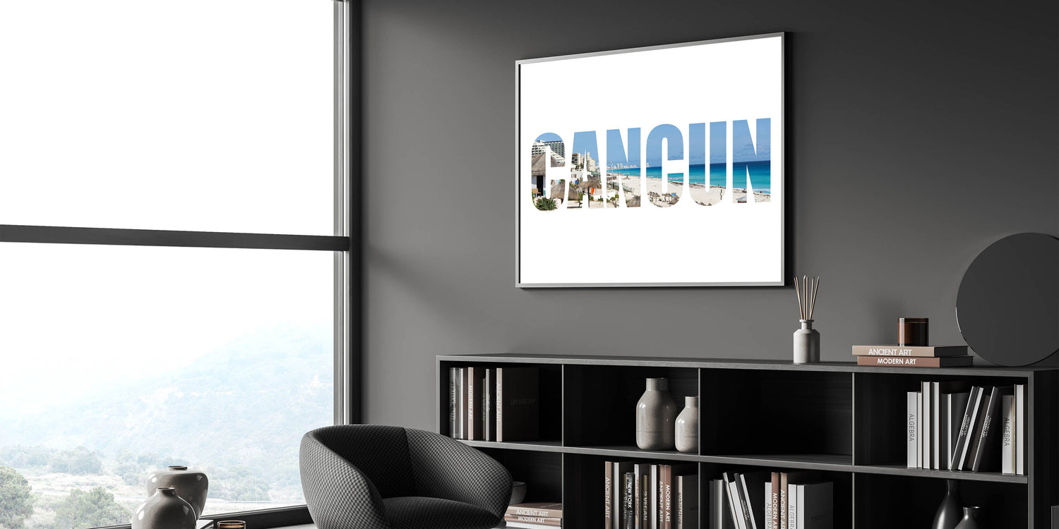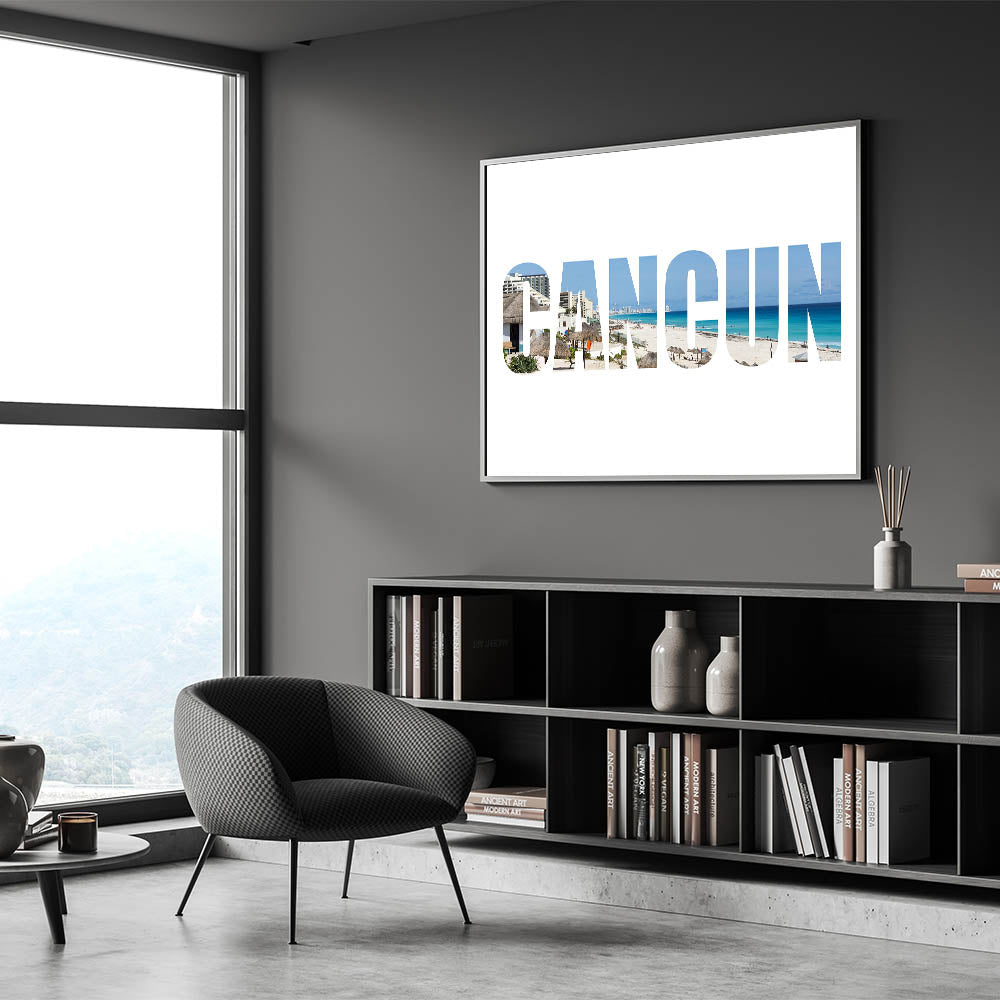 Bring a contemporary twist to your tropical decor with this unique Cancun beach typography wall art. Featuring a striking combination of bold typography and beautiful coastal photography, the word "CANCUN" is artistically filled with the iconic beach scenes of this famous Mexican destination. This artwork is perfect for modern interiors looking for a touch of vibrant beach vibes.