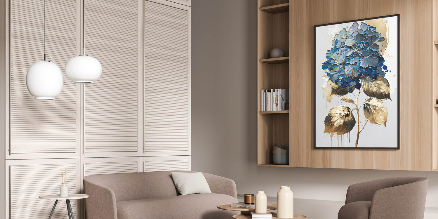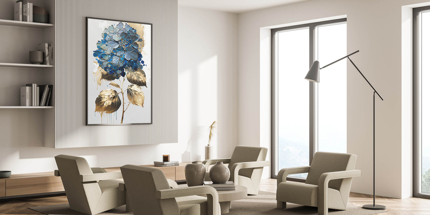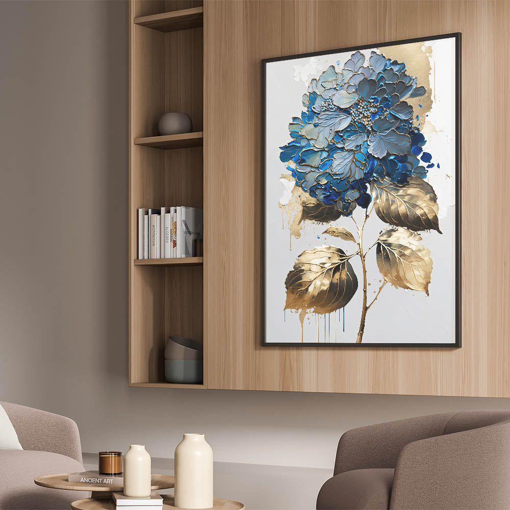 Introduce a touch of elegance to your space with our "Modern Floral Abstract Wall Art," a stunning piece that blends blue and gold hues in an intricate botanical design. This artwork captures the essence of contemporary floral beauty, making it a perfect addition to any modern decor.