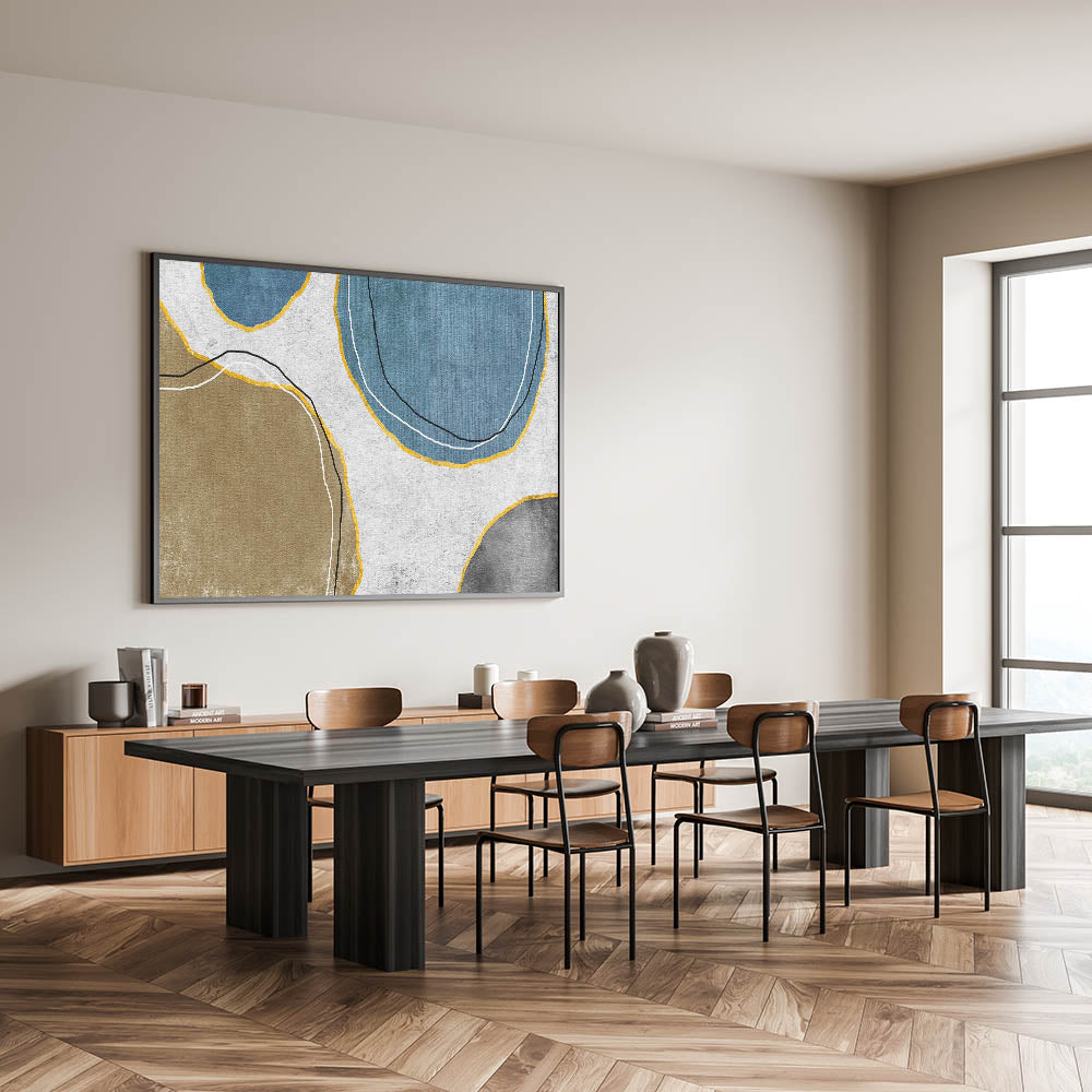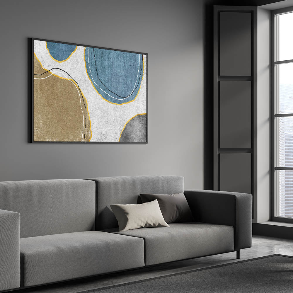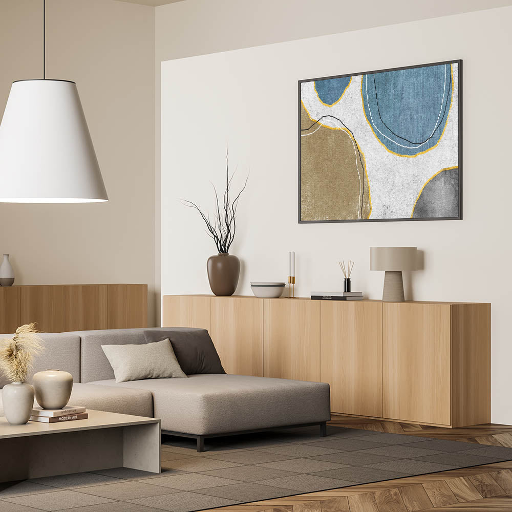 Add a touch of contemporary elegance to your home with this "Modern Geometric Abstract Art" piece. This artwork features a harmonious blend of blue, beige, and gray tones, outlined with bold black and white lines, creating a striking geometric composition. The abstract shapes and soft color palette make this piece an ideal choice for those looking to enhance their modern or minimalist interiors.