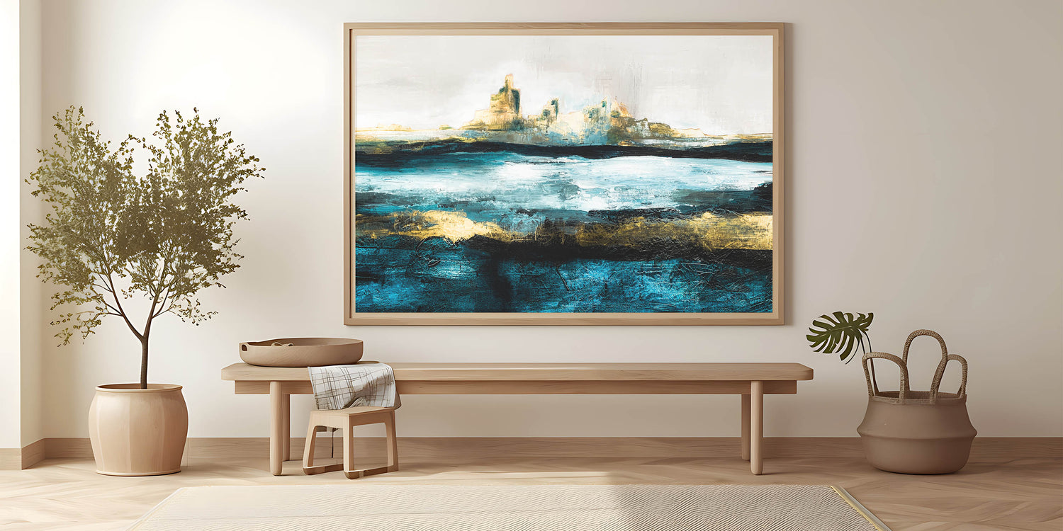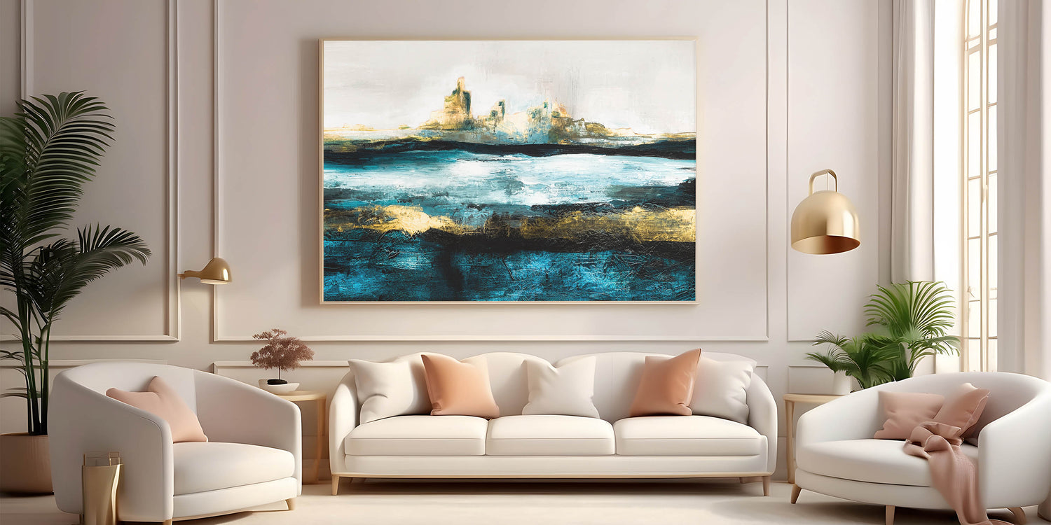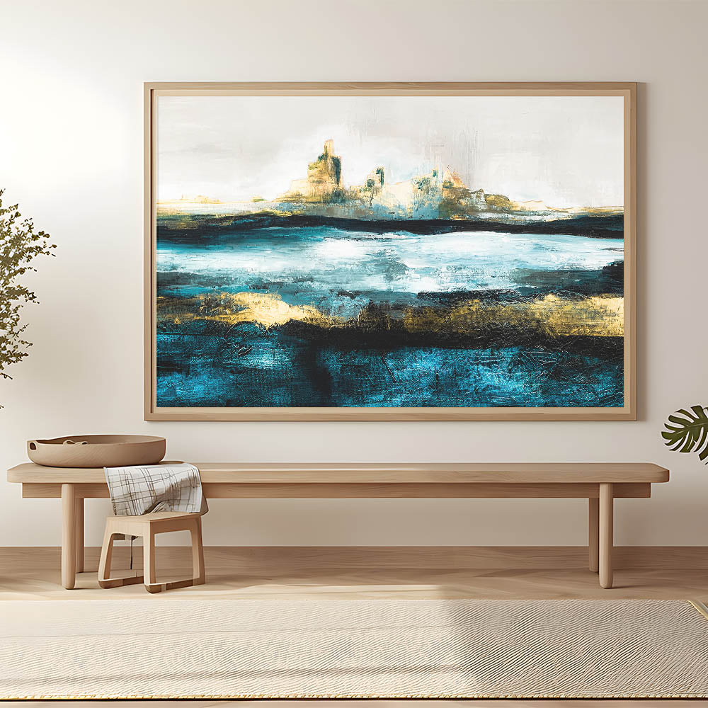 Introduce a stunning piece of abstract landscape art that beautifully captures the essence of natural scenery through bold textures and vibrant colors. This "Modern Landscape Abstract" wall art showcases a unique combination of deep blues, golden hues, and soft white tones, creating a captivating and contemporary representation of nature's beauty.