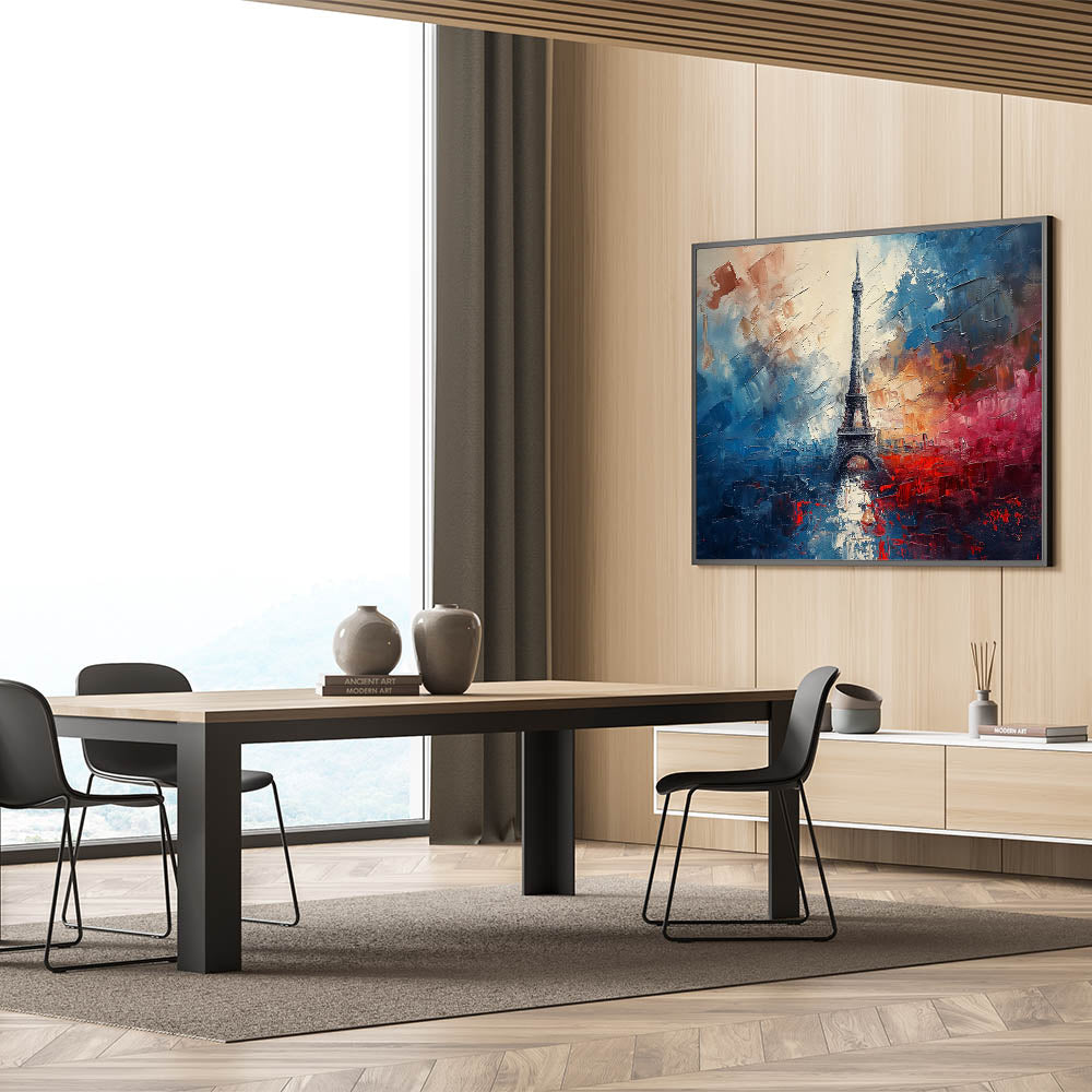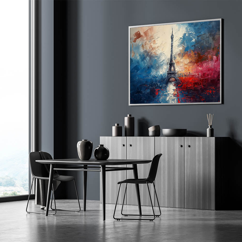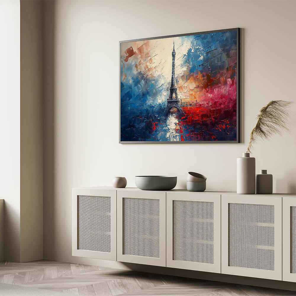 This vibrant Paris wall art presents the Eiffel Tower in a stunning abstract style, blending bold strokes of red, blue, and beige. The dynamic colors evoke movement and energy, while the iconic Eiffel Tower stands strong amidst the textured background. This modern canvas print is perfect for anyone looking to add a contemporary touch to their home or office décor, offering a fresh and artistic take on one of the world’s most famous landmarks.