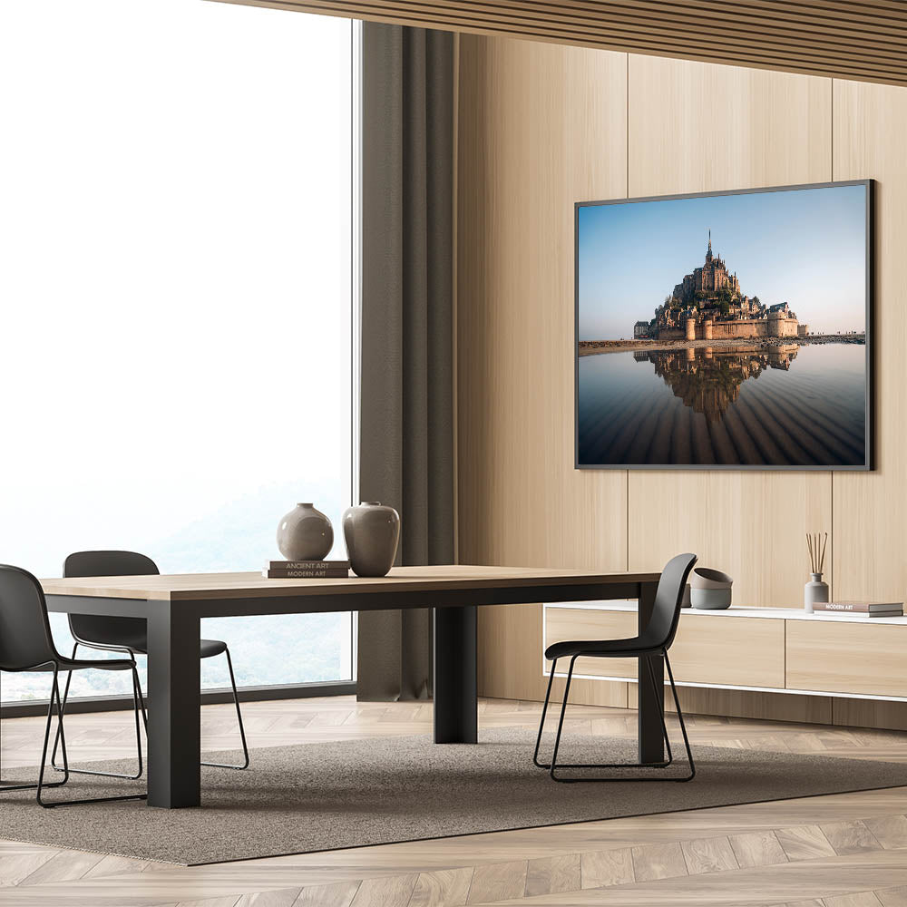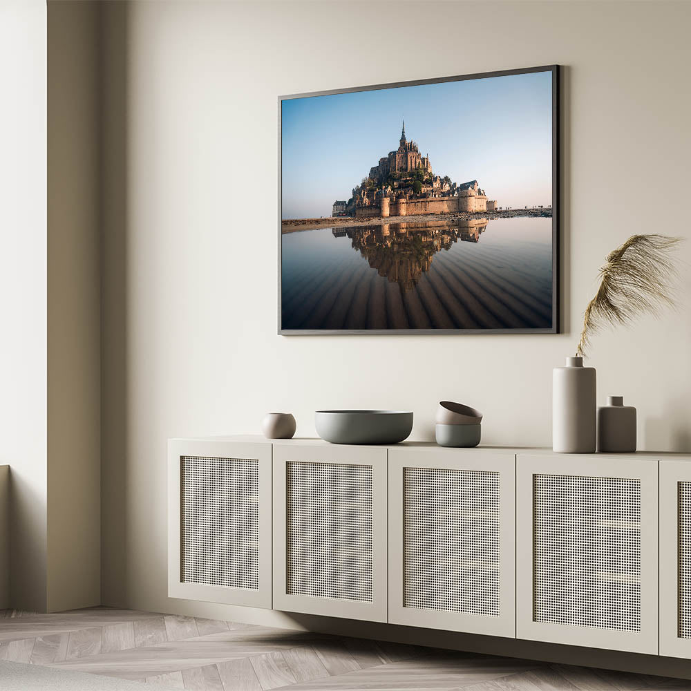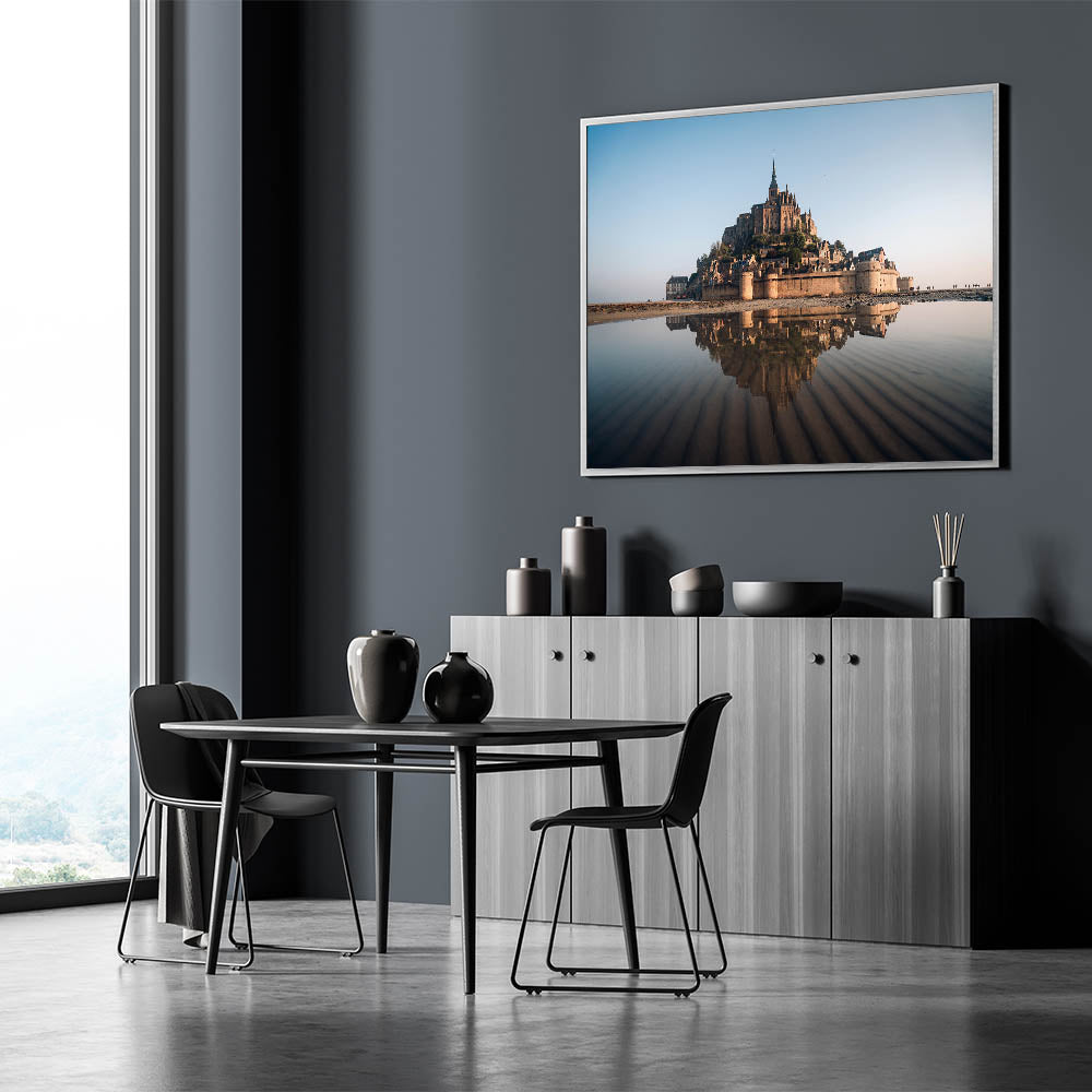 Capture the timeless beauty of France's Mont Saint-Michel with this exquisite castle wall art. This iconic landmark, set against the expansive horizon and reflected in the tranquil waters below, creates a breathtaking scene that will elevate any space. Perfect for those who appreciate the grandeur of historic architecture and the serene beauty of nature, this piece is a must-have for your home or office decor.