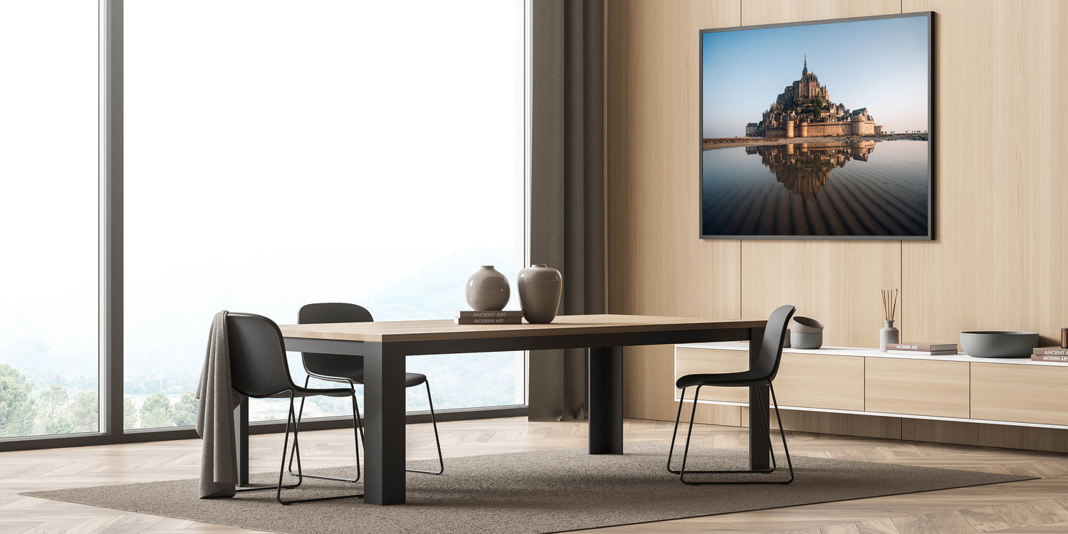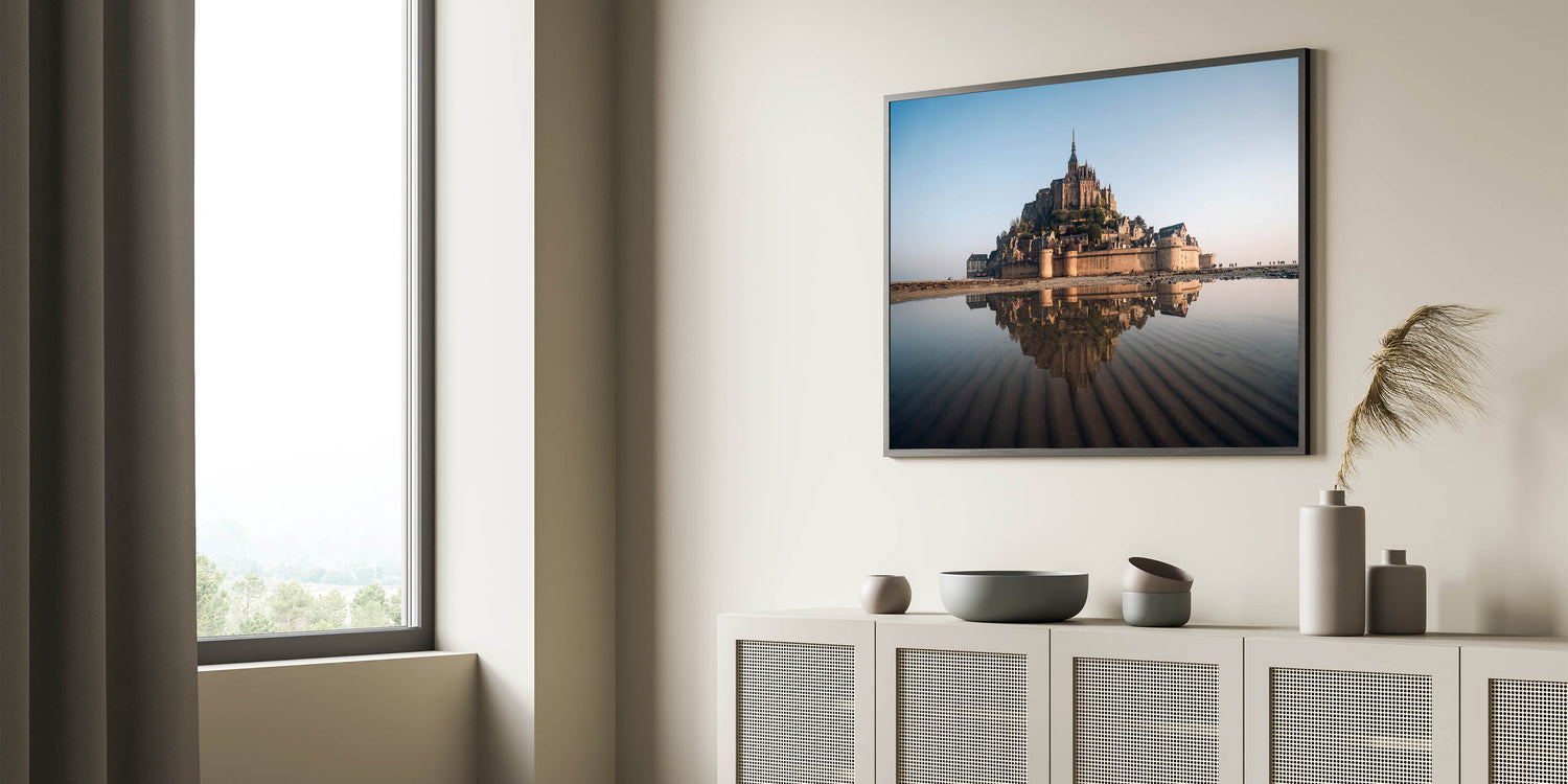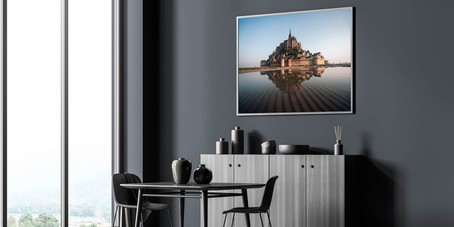 Capture the timeless beauty of France's Mont Saint-Michel with this exquisite castle wall art. This iconic landmark, set against the expansive horizon and reflected in the tranquil waters below, creates a breathtaking scene that will elevate any space. Perfect for those who appreciate the grandeur of historic architecture and the serene beauty of nature, this piece is a must-have for your home or office decor.