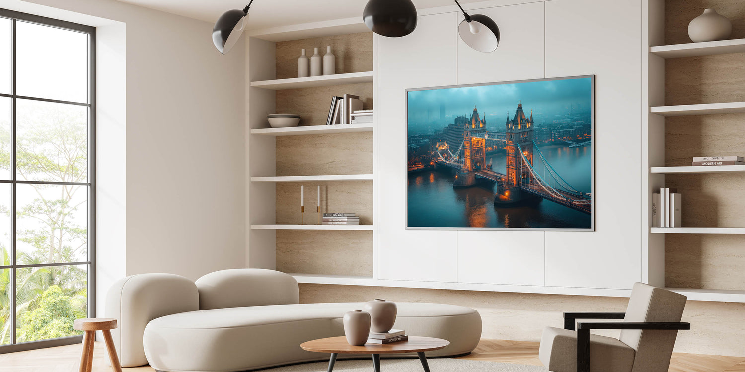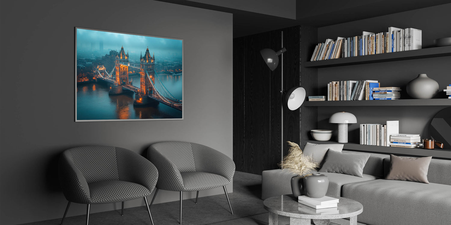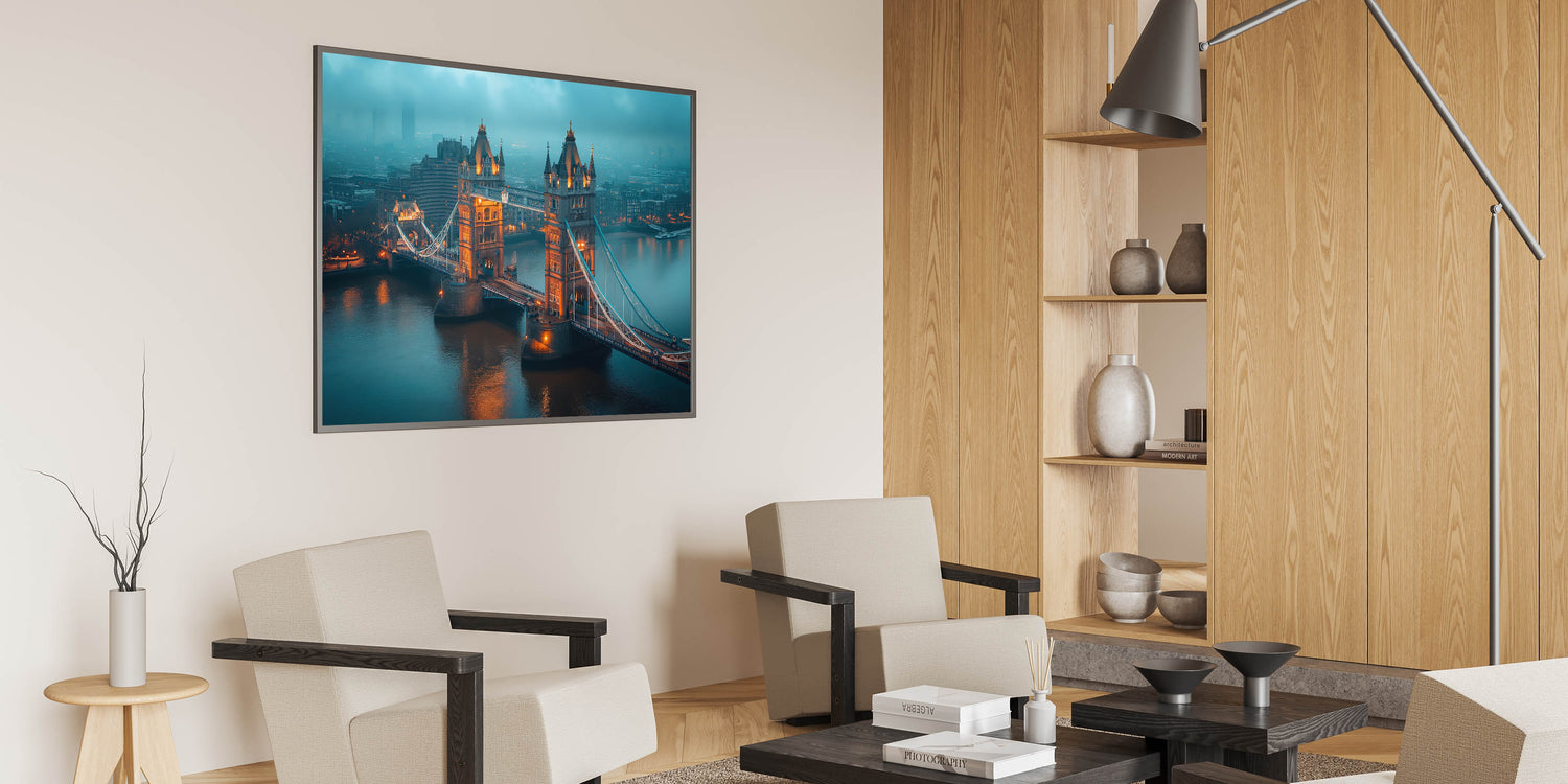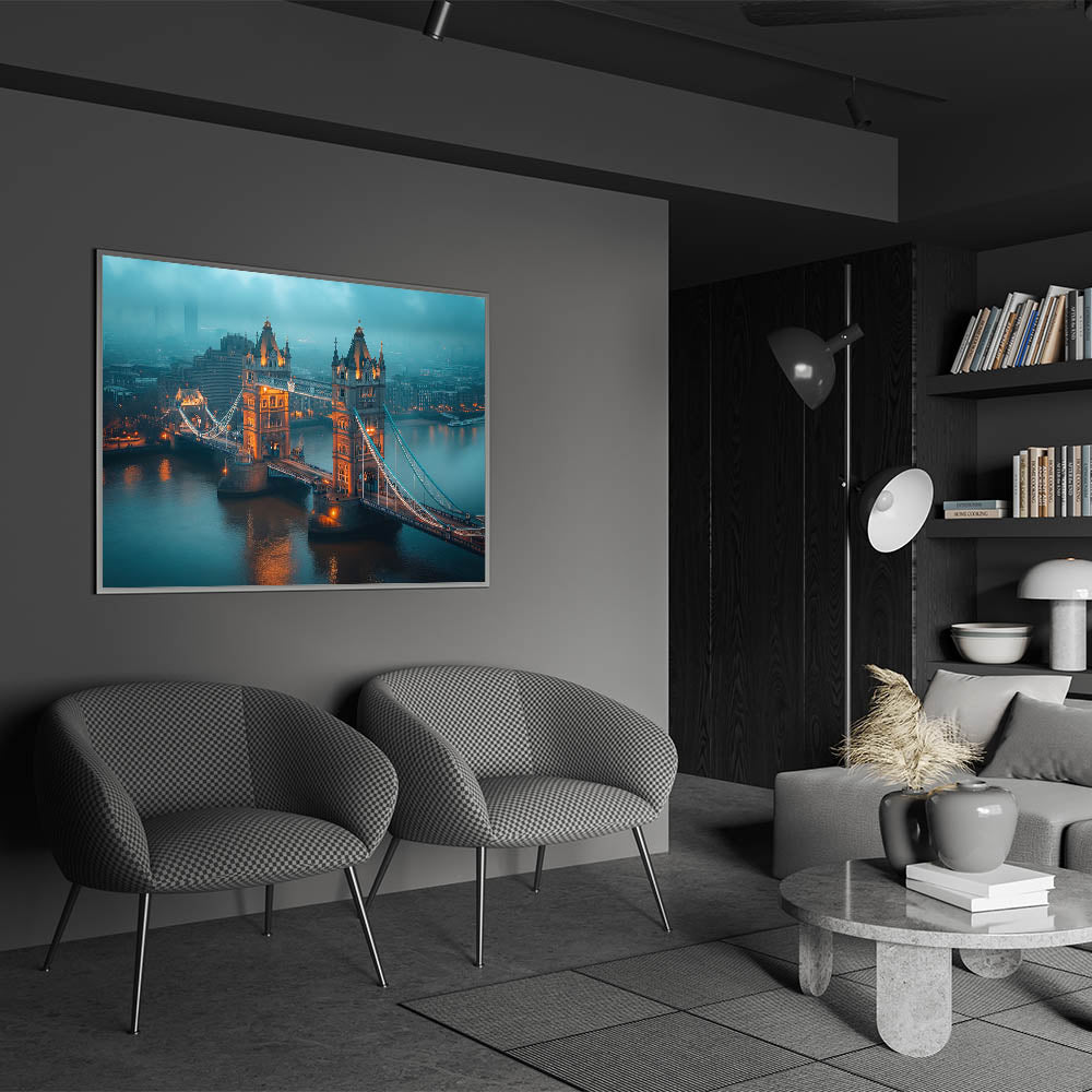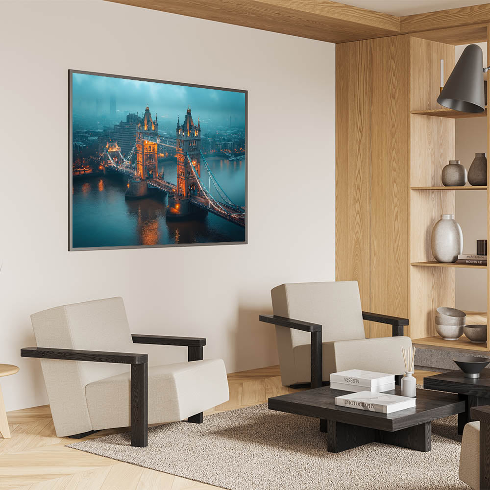 Bring the mysterious allure of London into your space with this atmospheric wall art featuring the Tower Bridge shrouded in early morning mist. The warm lights of the bridge pierce through the fog, creating a stunning contrast against the cool, muted tones of the city. This piece perfectly captures the moody and iconic essence of London at dawn, making it a captivating addition to any home or office decor.
