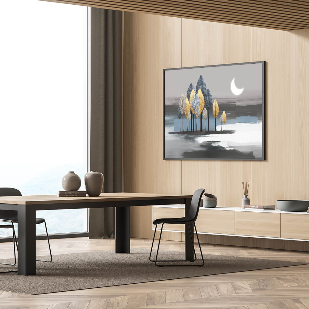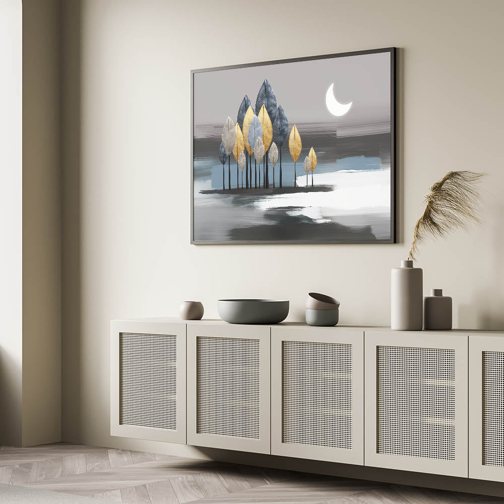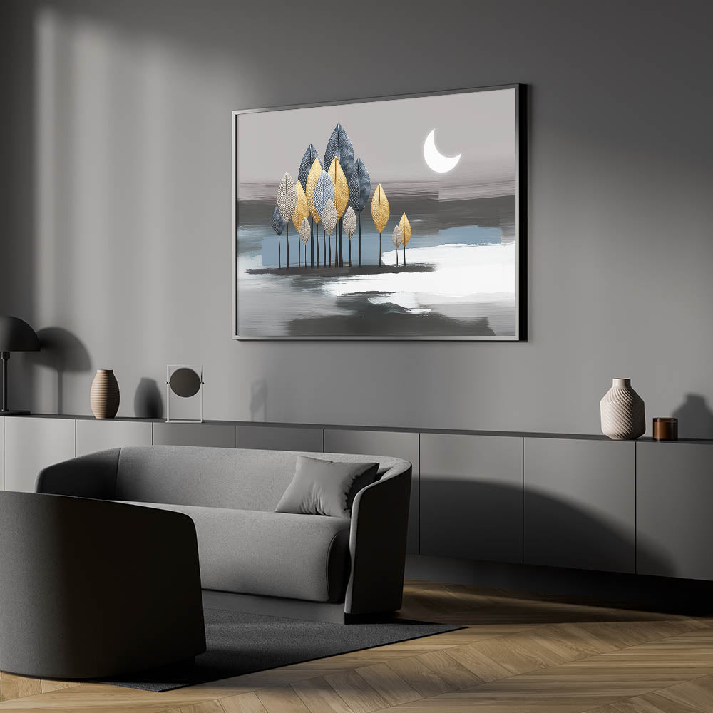 Illuminate your space with this enchanting moonlit forest artwork, featuring an abstract design that combines metallic leaves and soothing strokes. The artwork depicts a serene night scene with a crescent moon casting a gentle glow over a forest of gold, silver, and blue leaves. The background's soft grey and blue tones add depth and tranquility, making this piece a perfect addition to any modern or contemporary space.