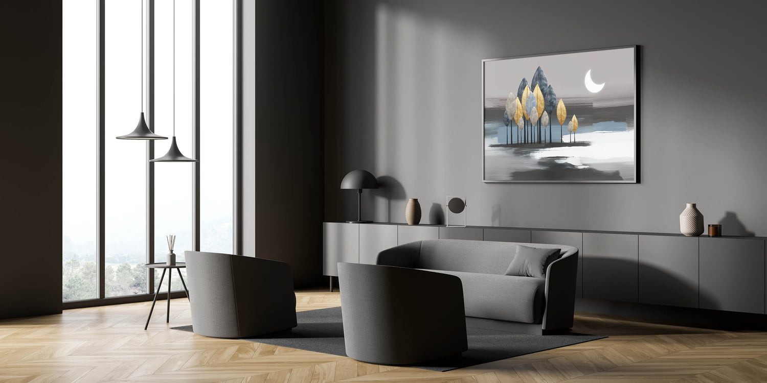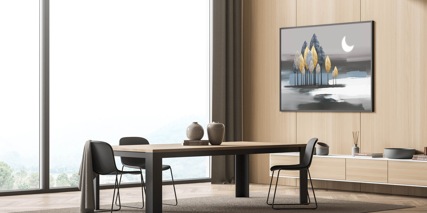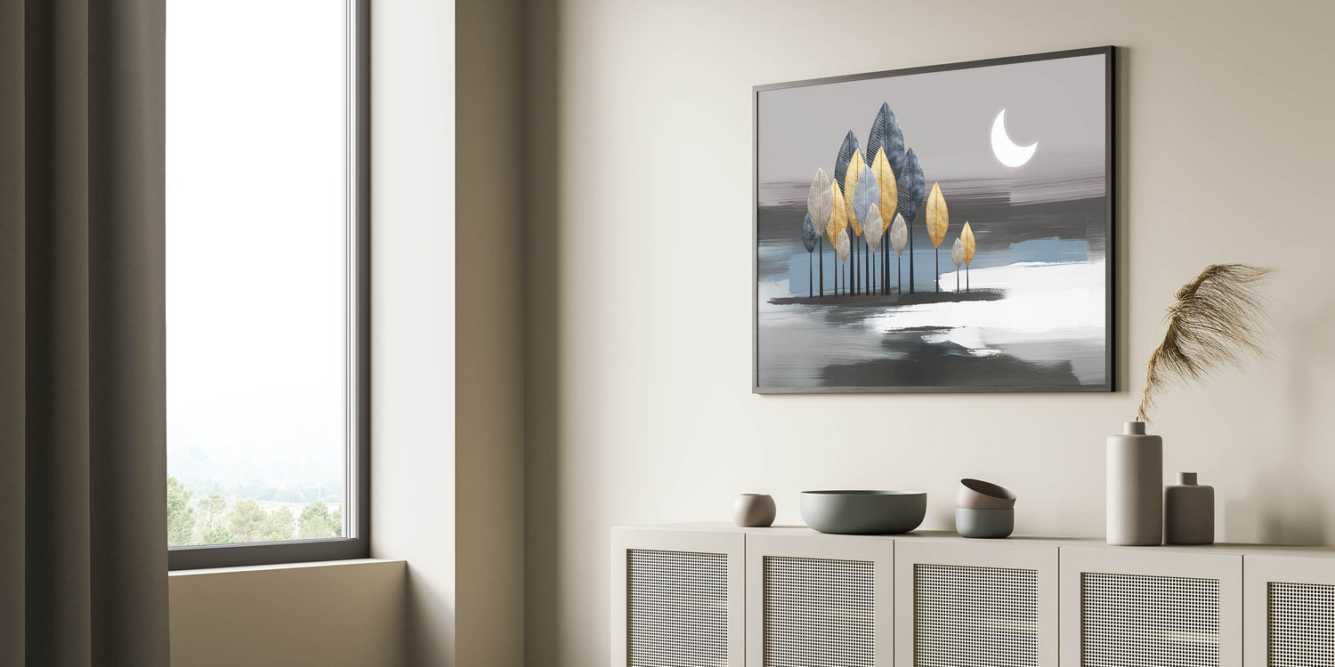 Illuminate your space with this enchanting moonlit forest artwork, featuring an abstract design that combines metallic leaves and soothing strokes. The artwork depicts a serene night scene with a crescent moon casting a gentle glow over a forest of gold, silver, and blue leaves. The background's soft grey and blue tones add depth and tranquility, making this piece a perfect addition to any modern or contemporary space.