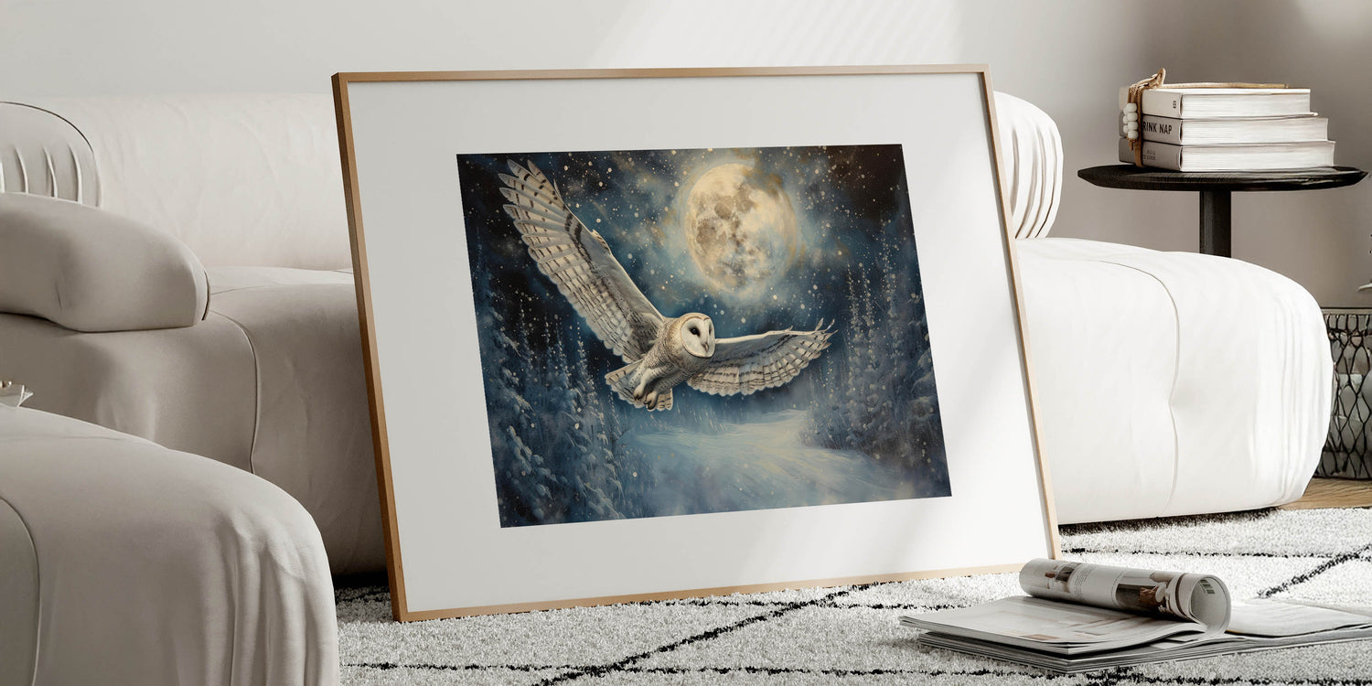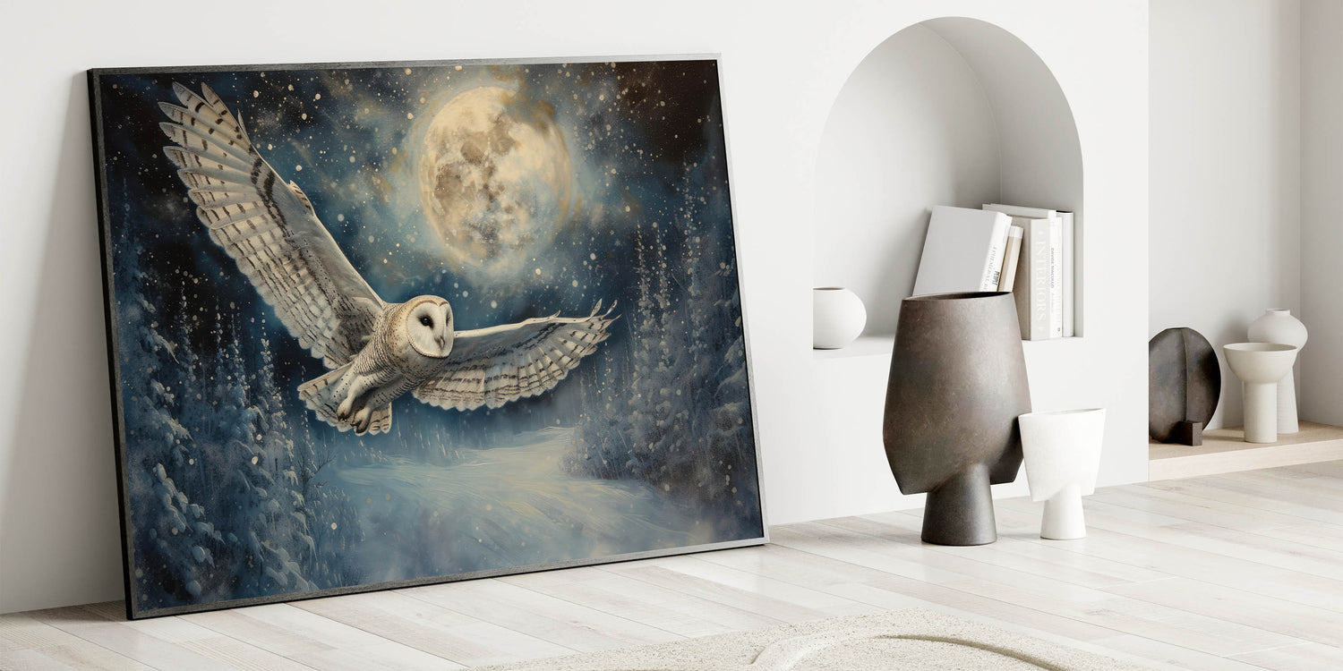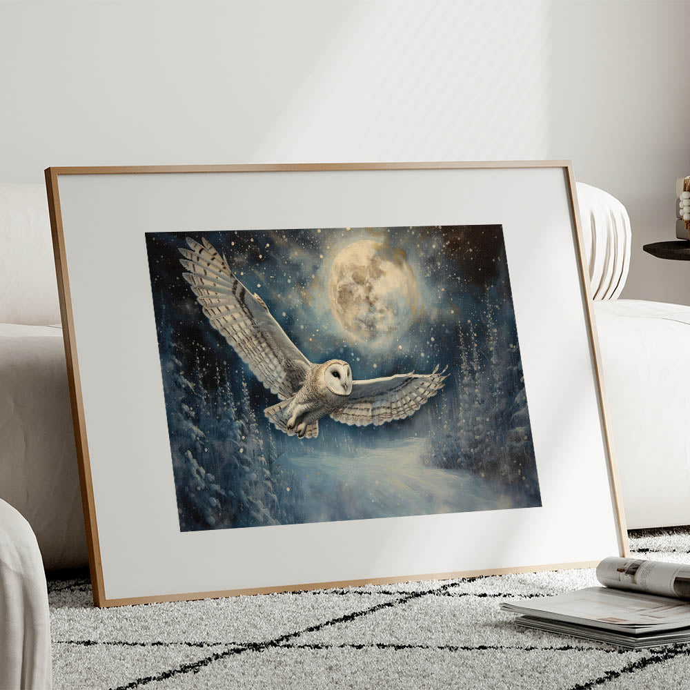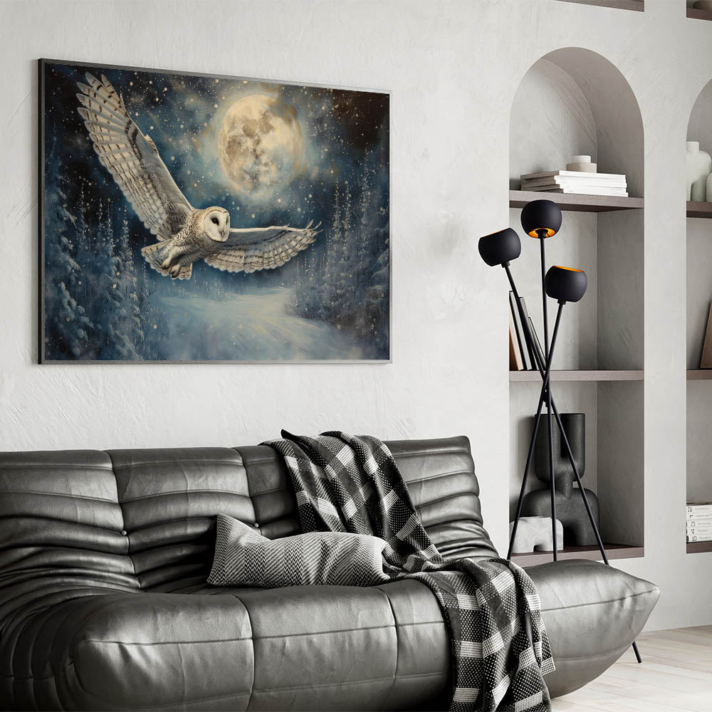 Moonlit Owl Wall Art - Mystical Owl in Flight Canvas & Framed Prints