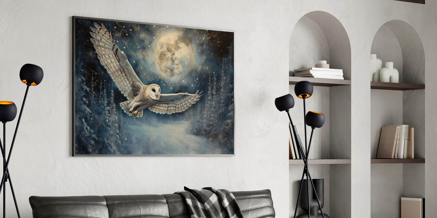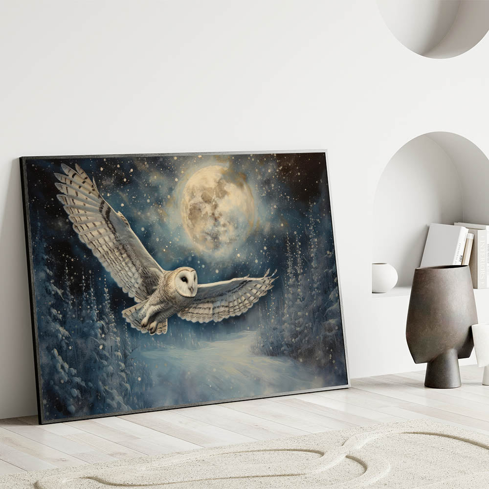 Immerse yourself in the enchanting beauty of the night with this stunning moonlit owl wall art. This piece features a majestic owl soaring through a wintery landscape, illuminated by the glow of a full moon. The artwork captures the serene and mystical atmosphere of a moonlit night, with the owl's graceful wings spread wide against a backdrop of twinkling stars and snow-covered trees. Perfect for those who appreciate the magic of nature and the elegance of nocturnal creatures.