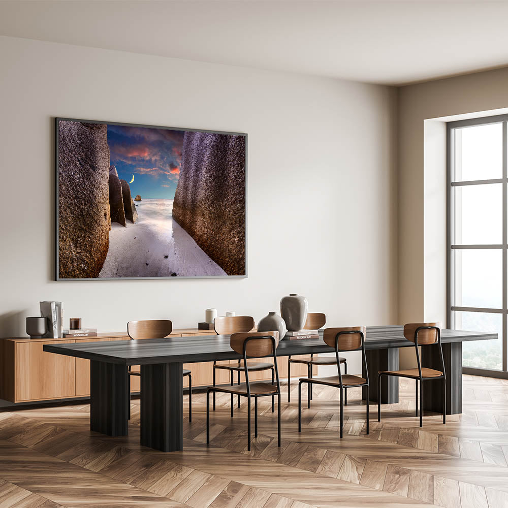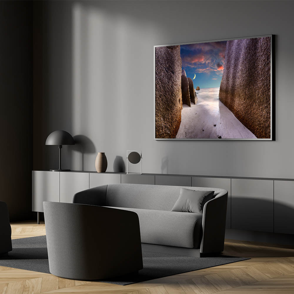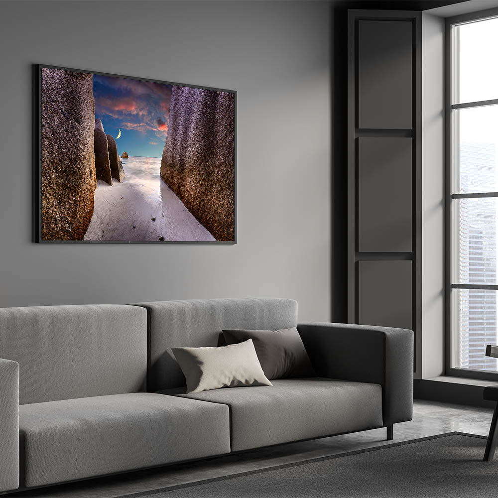 Experience the enchanting beauty of a moonlit Seychelles beach with this breathtaking wall art. Featuring the soft glow of the moon over the calm sea, framed by striking rock formations, this print evokes a sense of peace and mystery. Perfect for those who love coastal nightscapes and dream of serene island evenings.