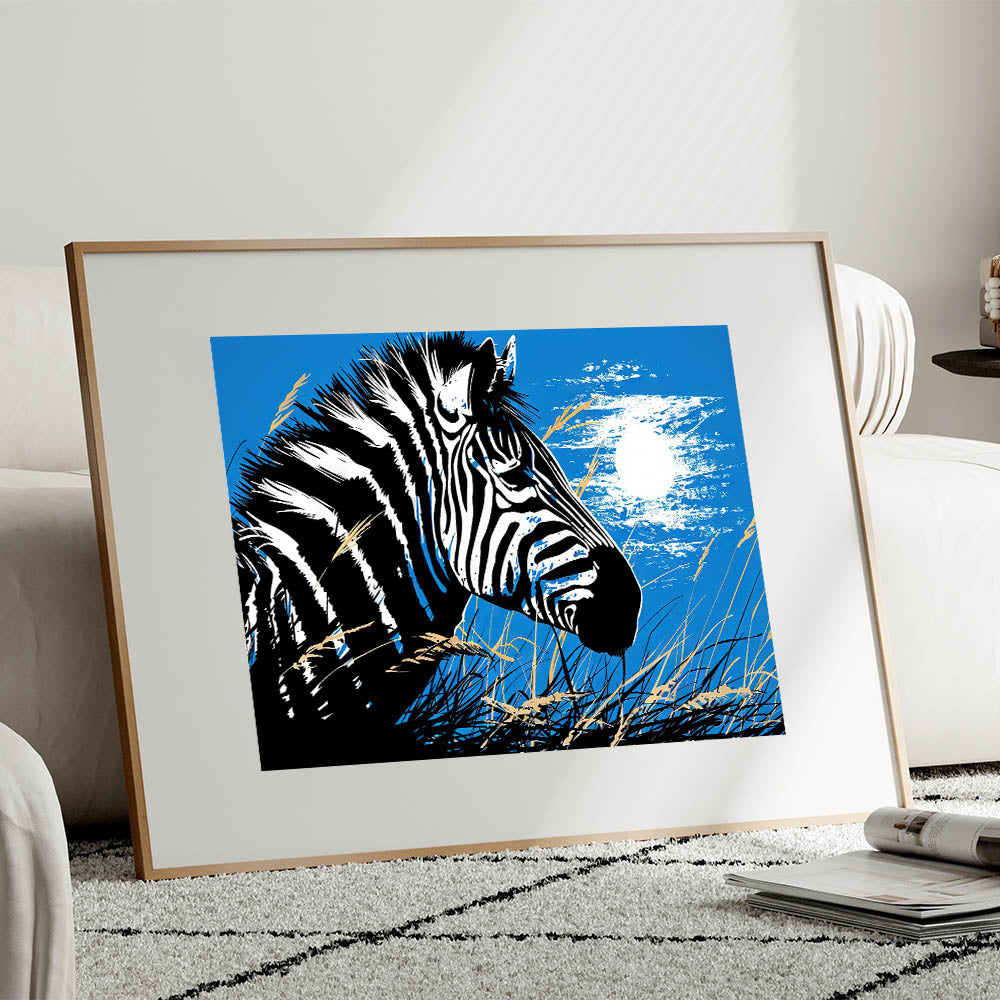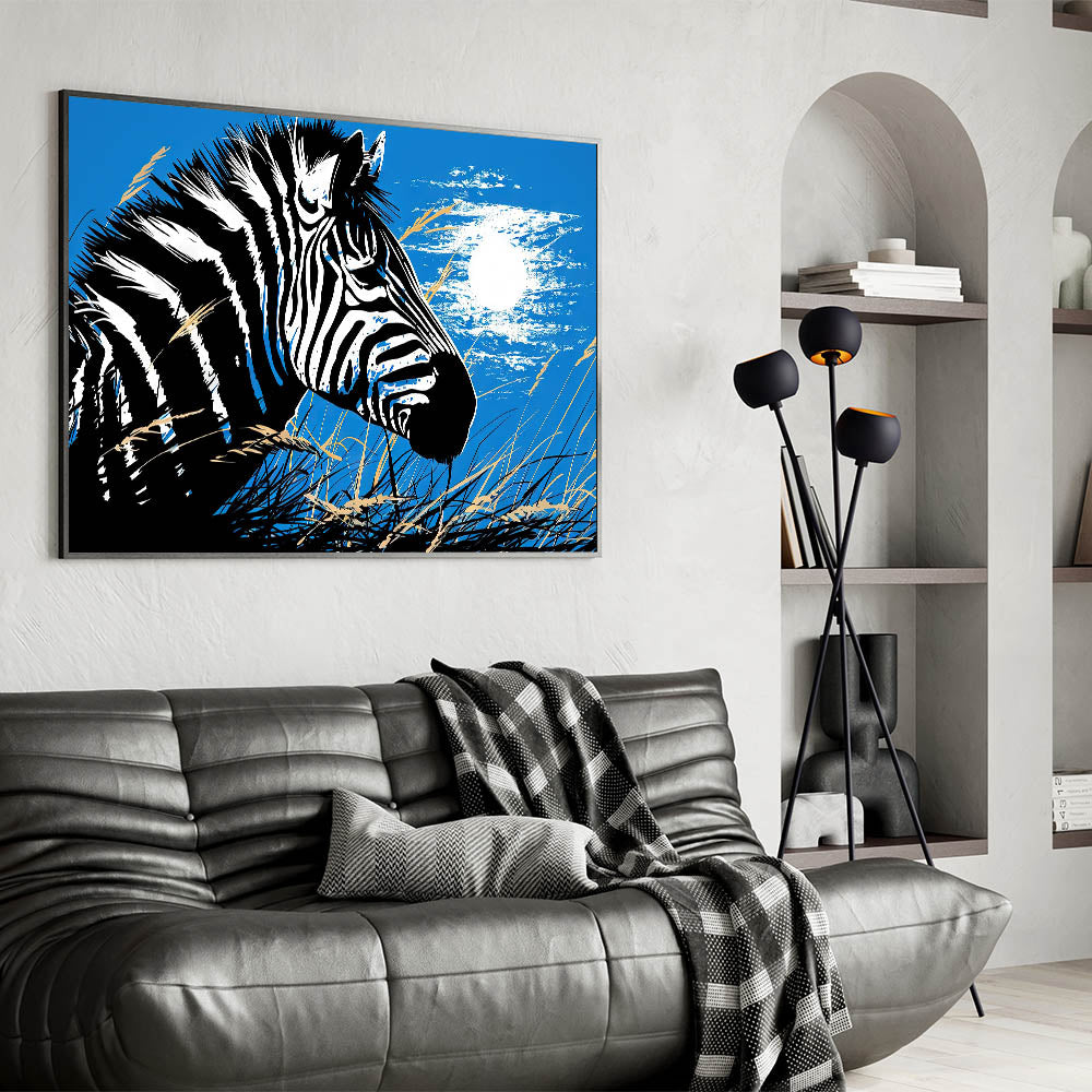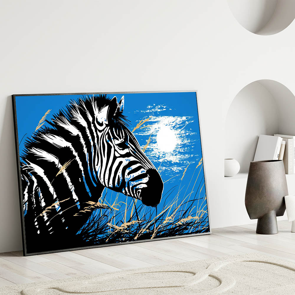 - Bold Design: A striking portrayal of a zebra under the moonlight, set against a vibrant blue background, ideal for making a statement in any room.