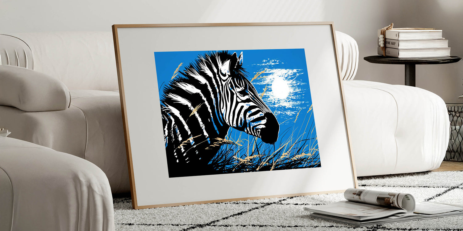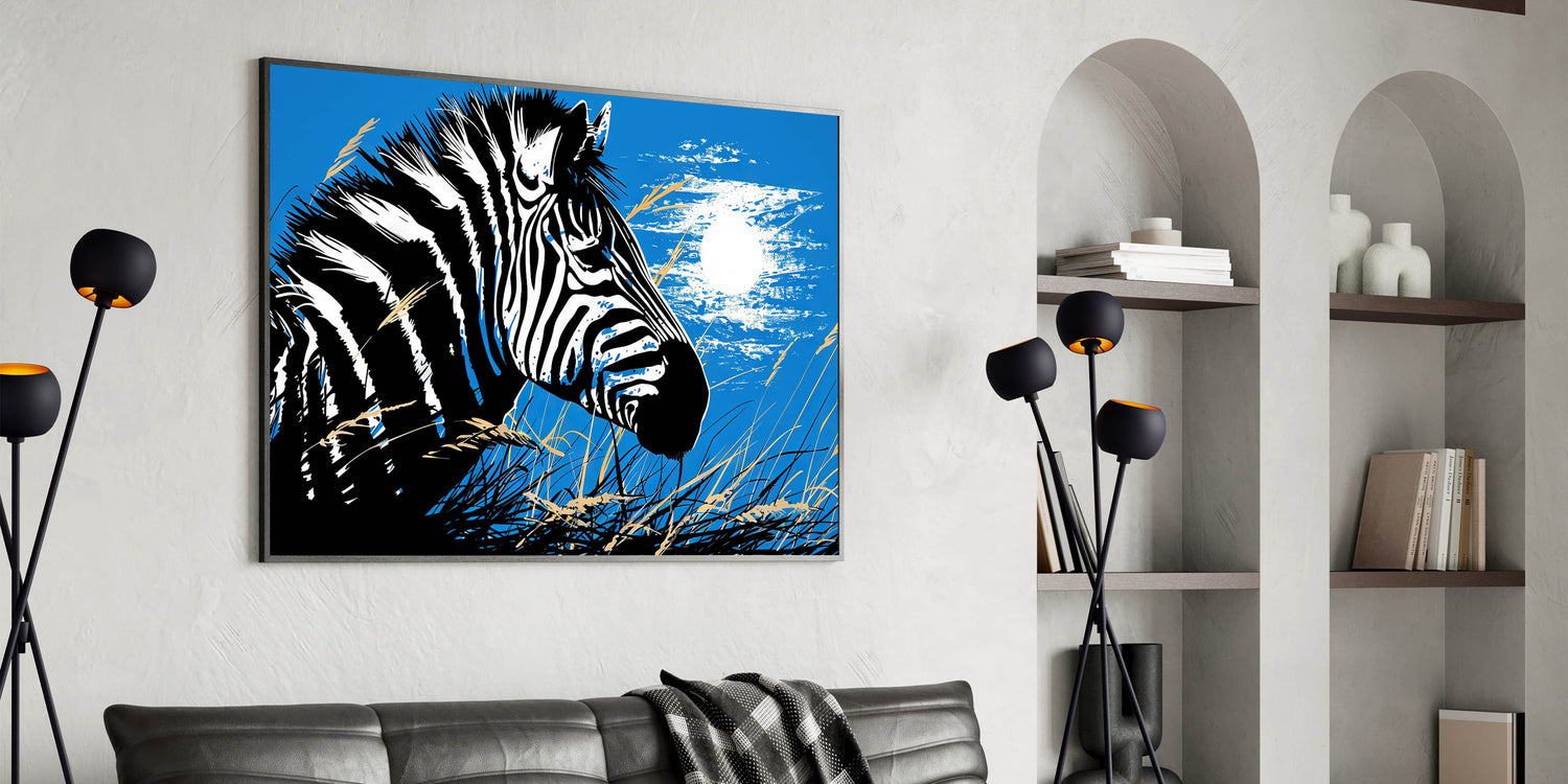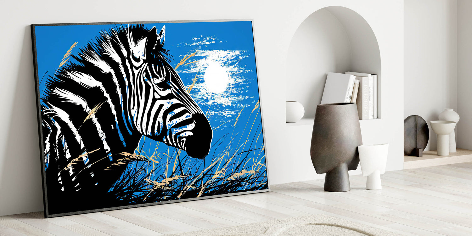 - Bold Design: A striking portrayal of a zebra under the moonlight, set against a vibrant blue background, ideal for making a statement in any room.