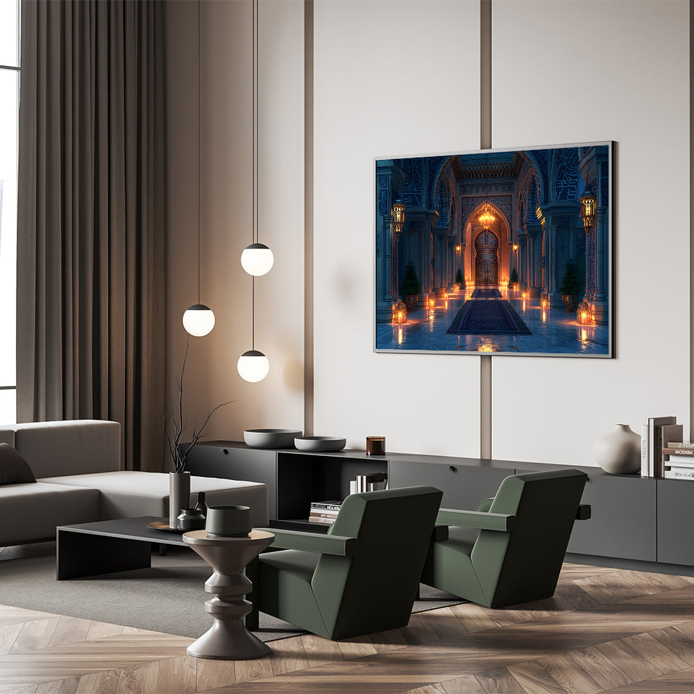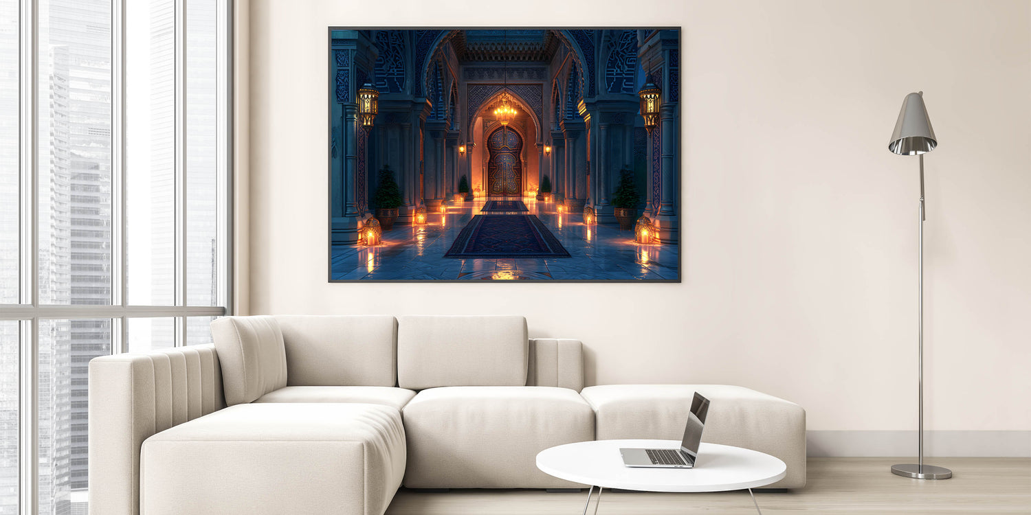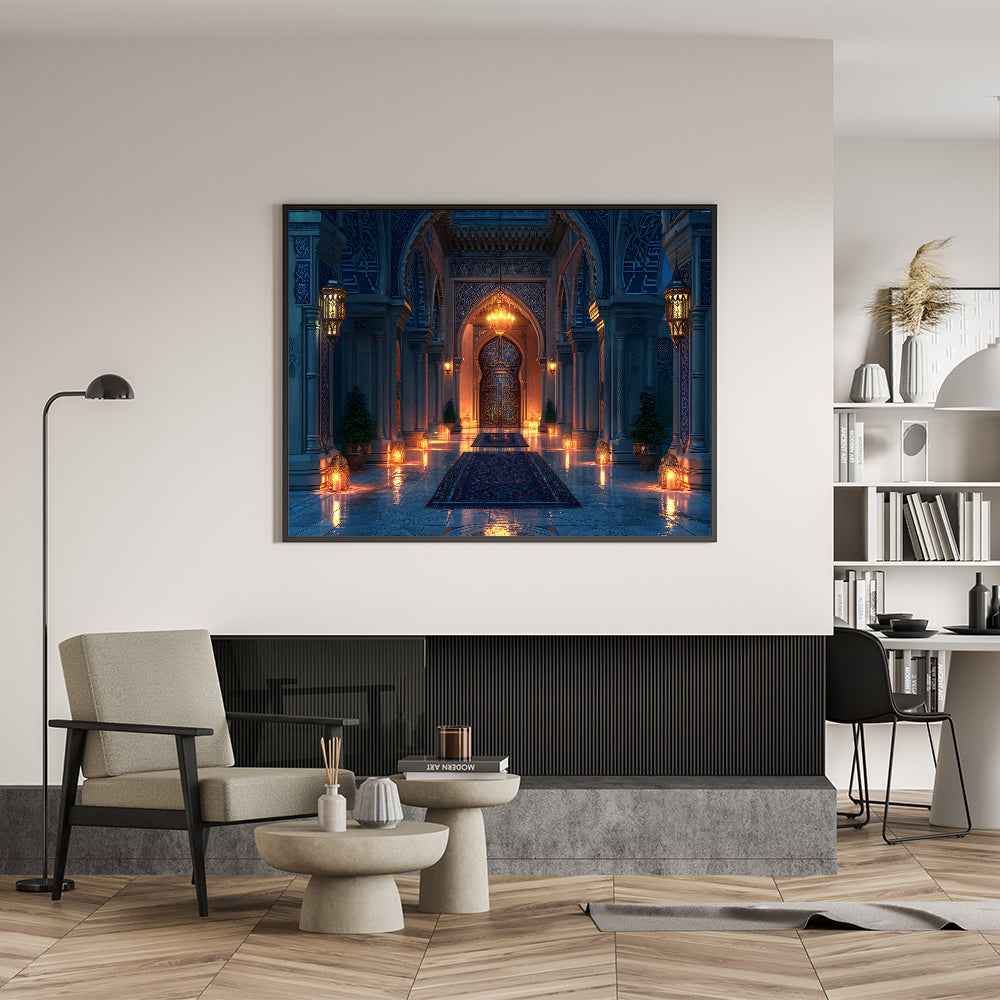 Step into a world of enchanting beauty with this stunning wall art featuring a grand Moorish archway illuminated by the warm glow of lanterns at night. The intricate patterns and rich details of the architecture are brought to life by the soft, ambient light, creating a captivating and luxurious atmosphere. This artwork is perfect for those who appreciate the elegance of Islamic architecture and want to bring a touch of exotic charm into their home.