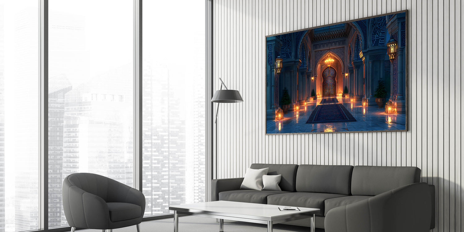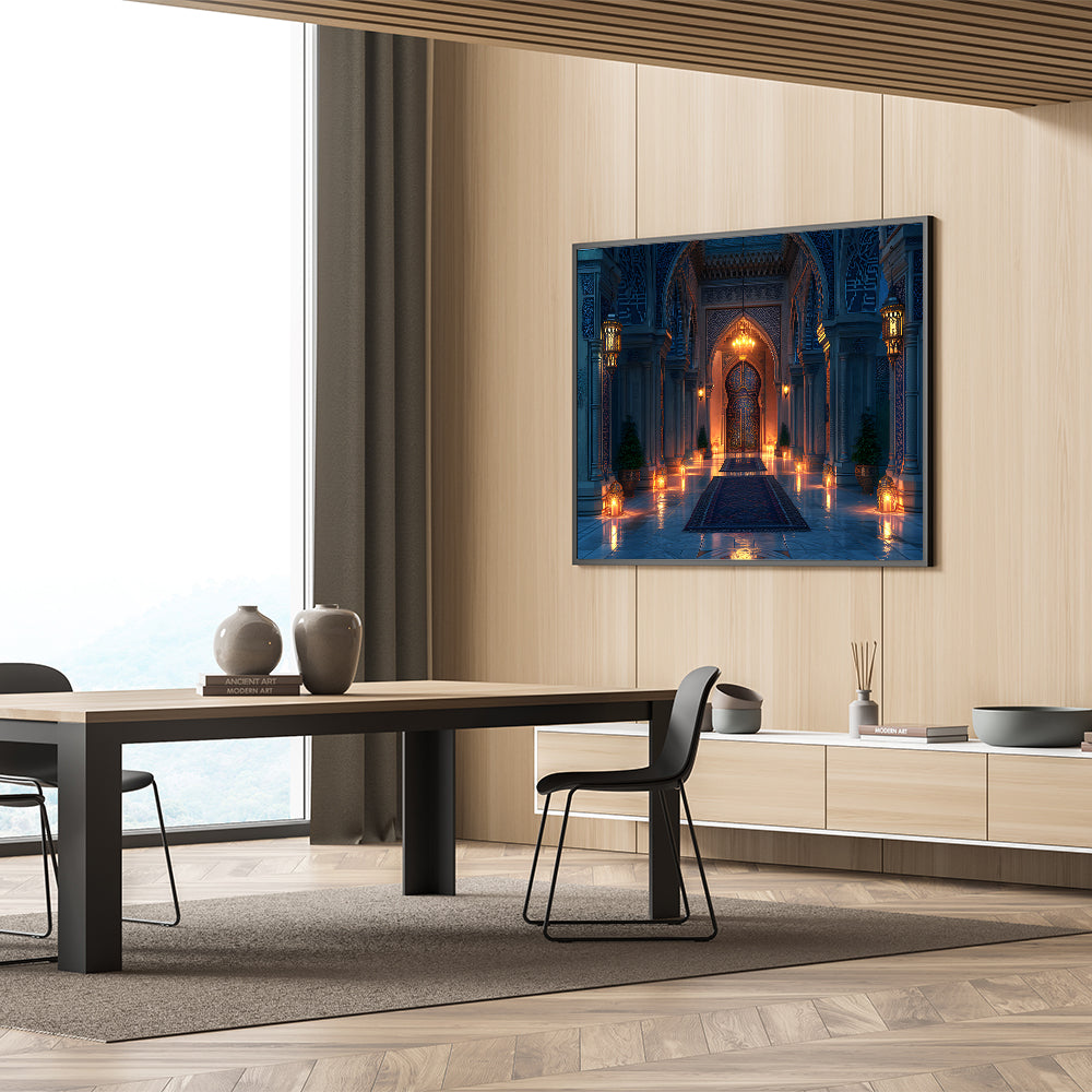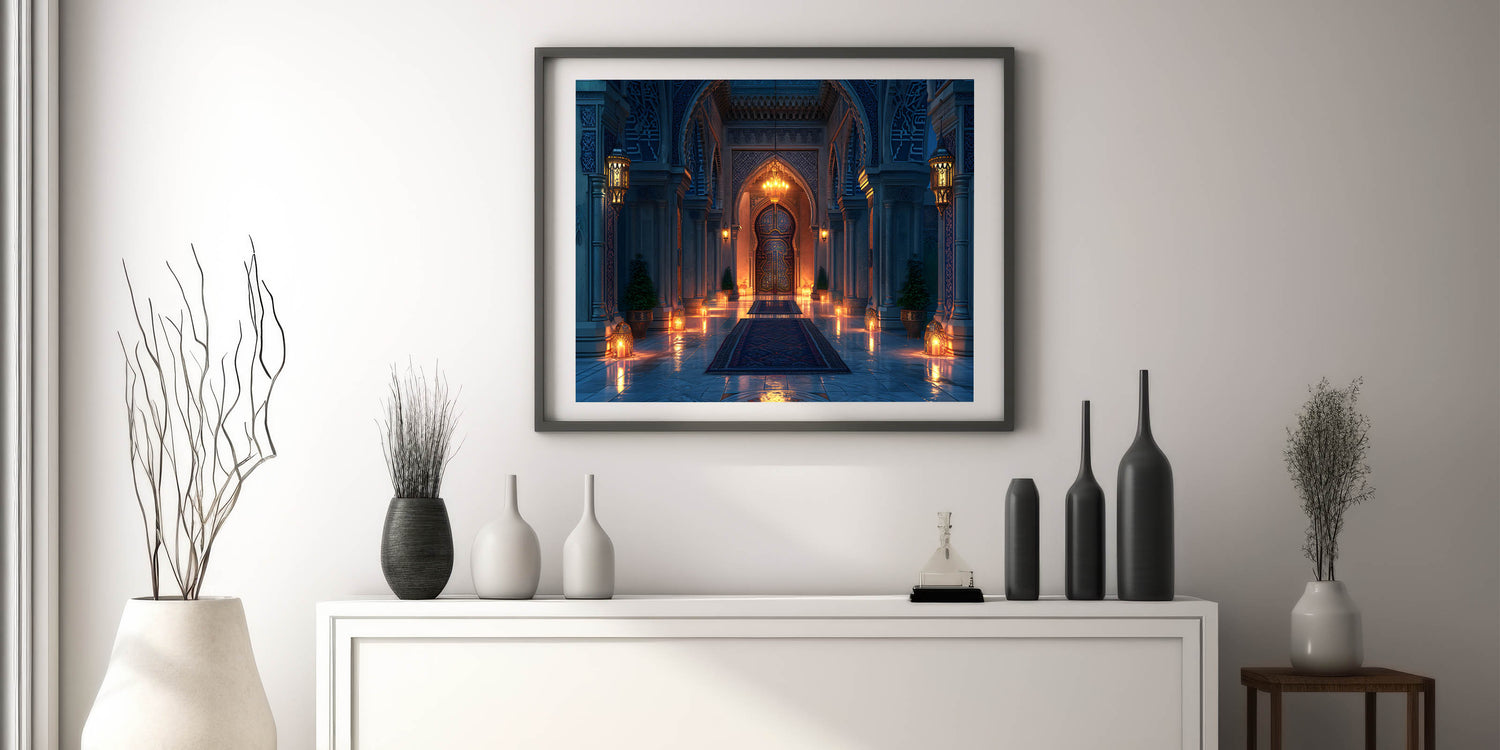 Step into a world of enchanting beauty with this stunning wall art featuring a grand Moorish archway illuminated by the warm glow of lanterns at night. The intricate patterns and rich details of the architecture are brought to life by the soft, ambient light, creating a captivating and luxurious atmosphere. This artwork is perfect for those who appreciate the elegance of Islamic architecture and want to bring a touch of exotic charm into their home.