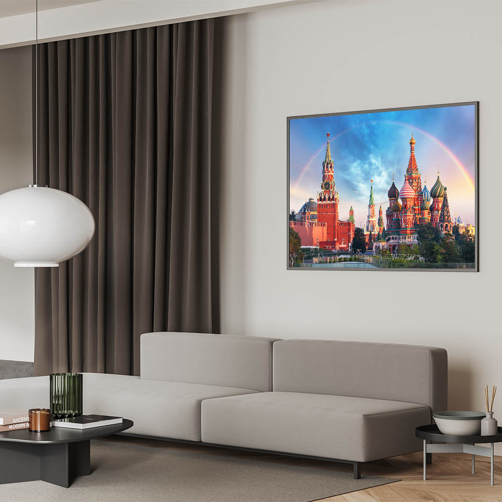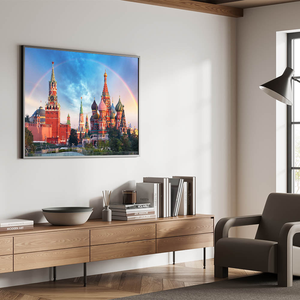 Transform your space with this mesmerizing Moscow framed art featuring Red Square and St. Basil’s Cathedral beneath a brilliant rainbow. The combination of vibrant colors and the iconic Moscow skyline makes this artwork a captivating addition to any room. Perfect for lovers of Moscow cityscape photography, this print captures a rare and magical moment in the heart of Russia’s capital.