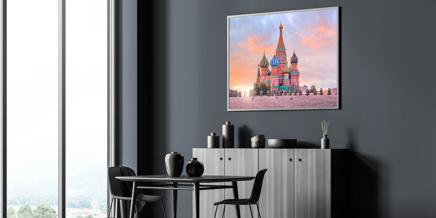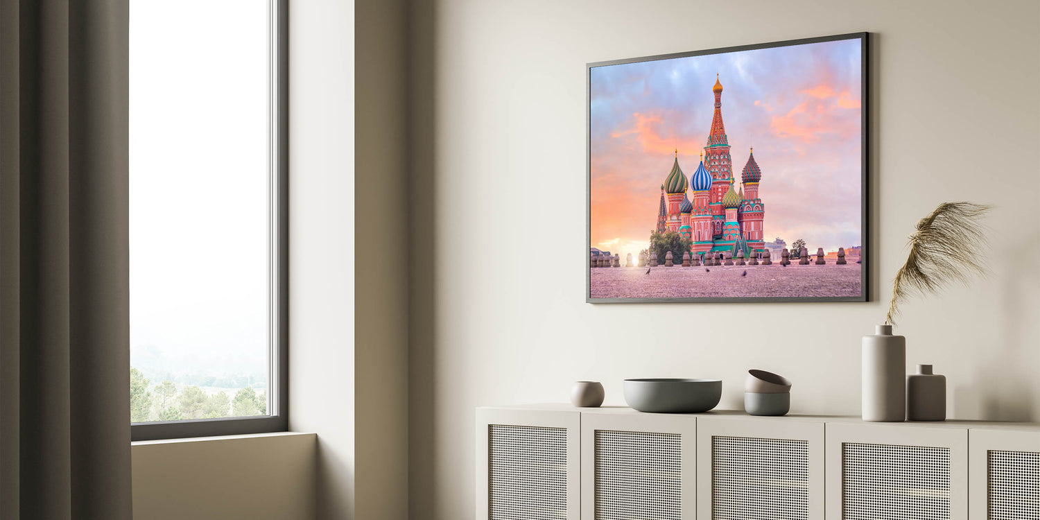 - High-quality Moscow canvas prints with options for framing and rolled formats.
