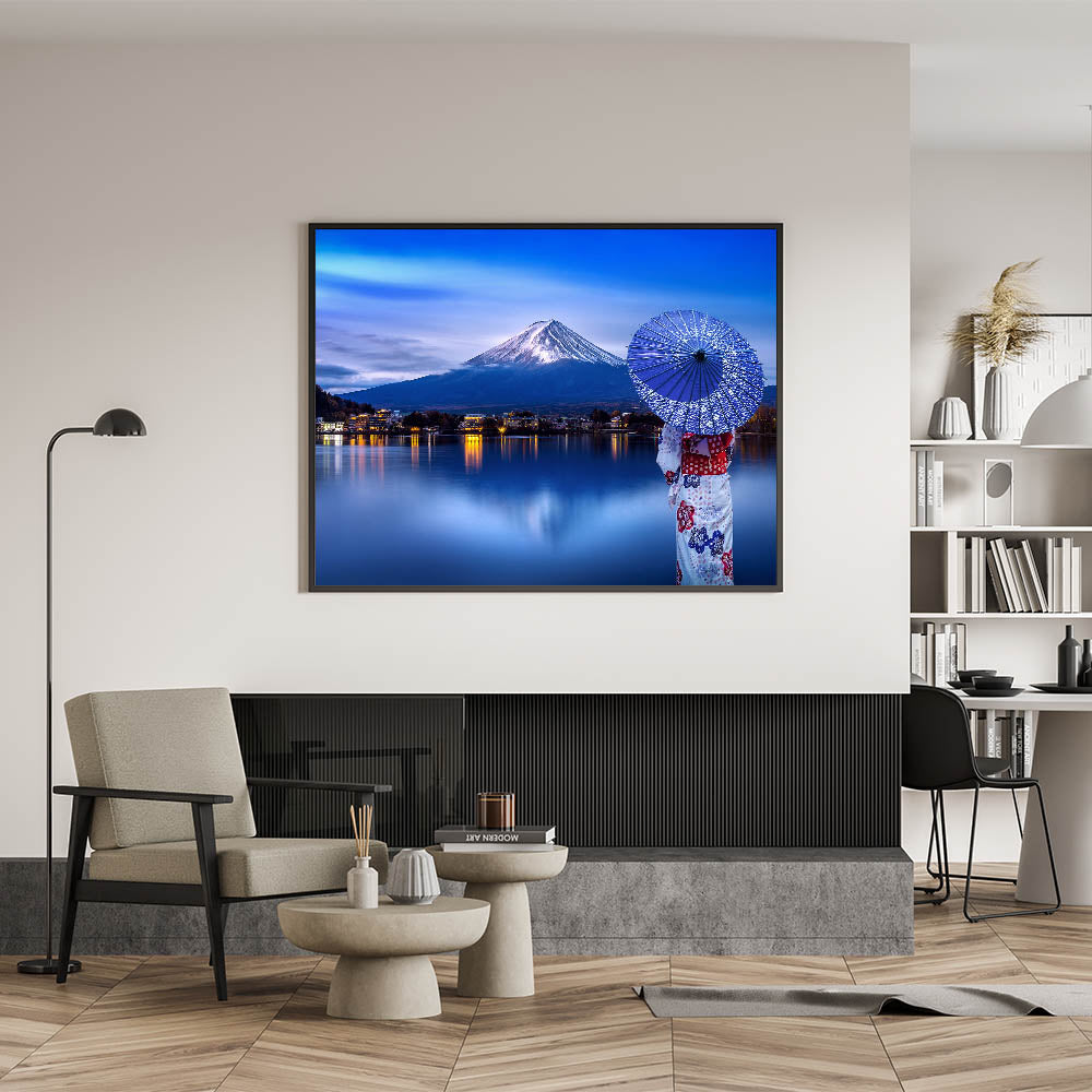 Capture the tranquil beauty of Japan with this breathtaking Mount Fuji Art Print, featuring a serene lakeside view and a traditional Japanese umbrella. The majestic Mount Fuji dominates the background, reflecting in the calm waters, while the foreground showcases a woman in a kimono holding a beautifully detailed umbrella. The striking contrast between the deep blue hues of the water and sky with the snowy peak of Mount Fuji creates a mesmerizing visual effect, making this piece a perfect addition to any room.