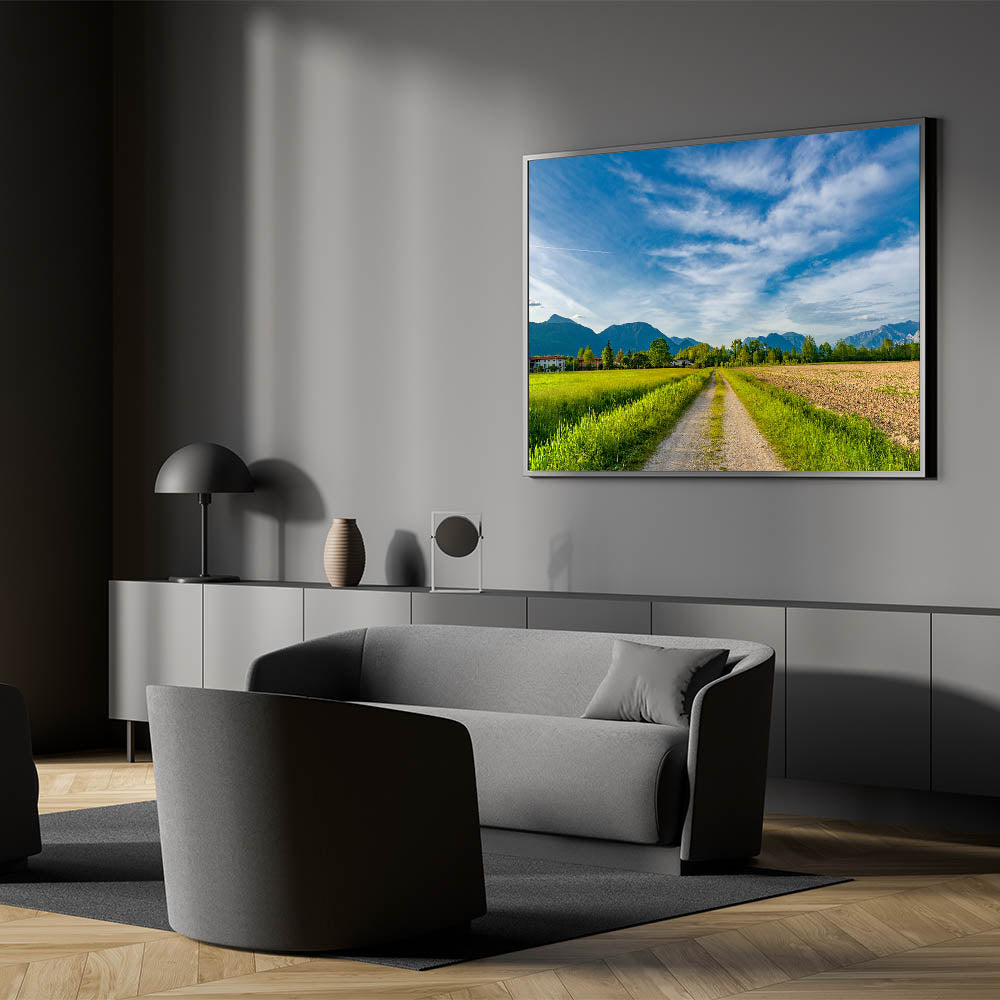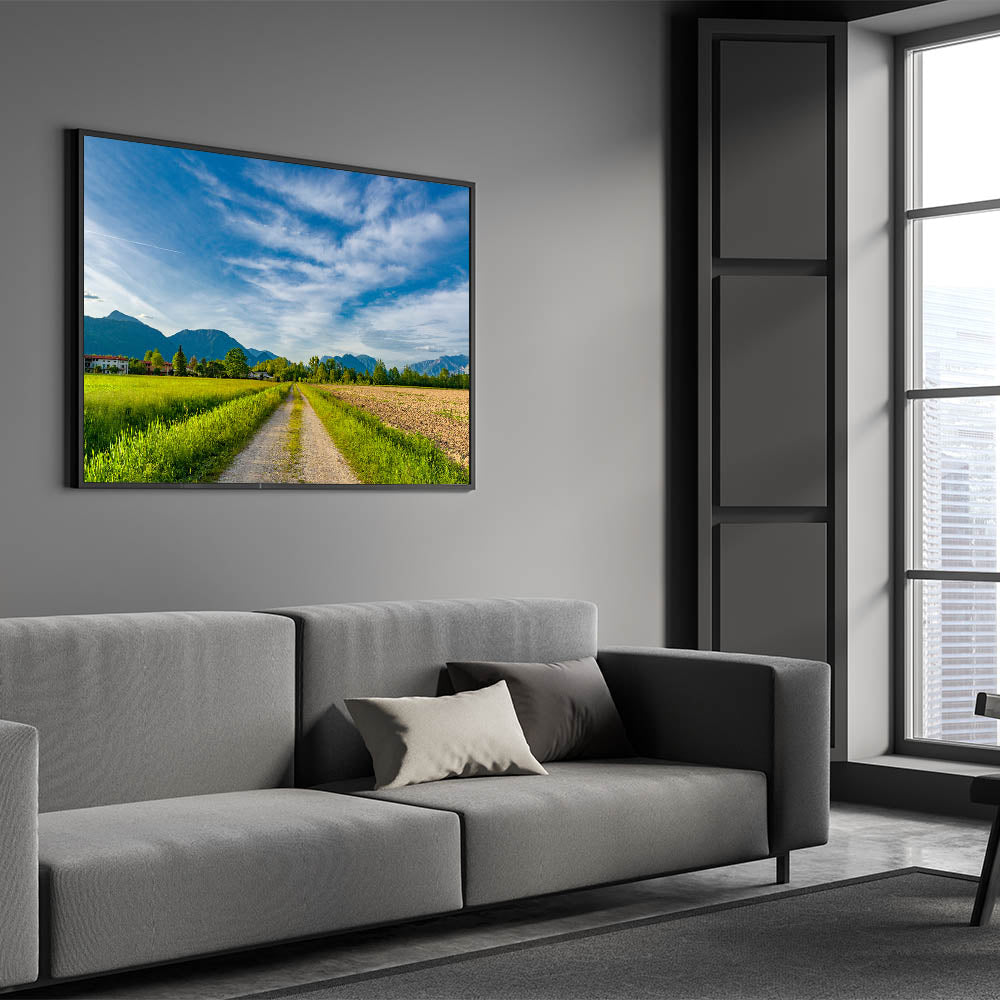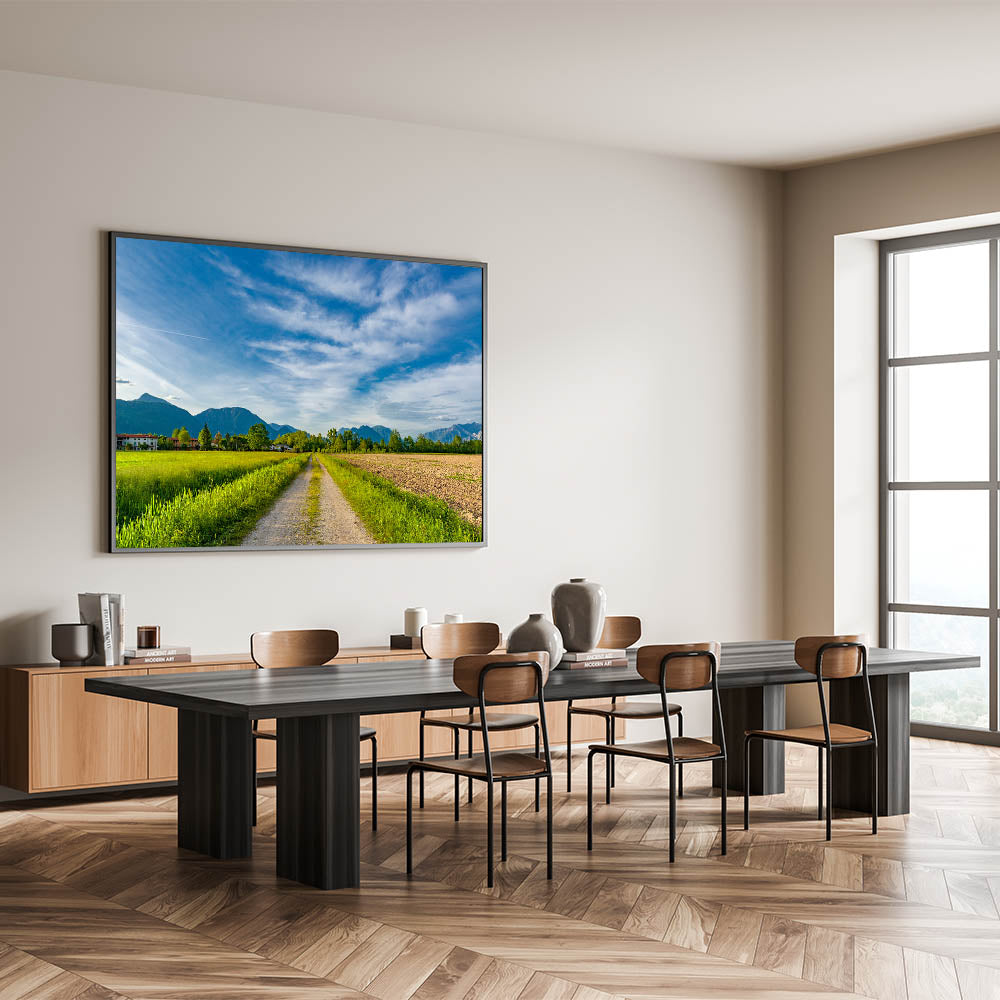 This countryside landscape art print is ideal for creating a sense of space and freedom in your home or office. The peaceful yet dynamic scene will inspire a sense of exploration and tranquility, making it a perfect addition to any space that values the beauty of nature.