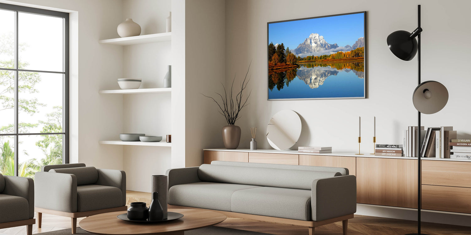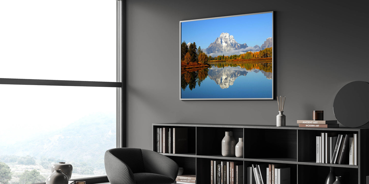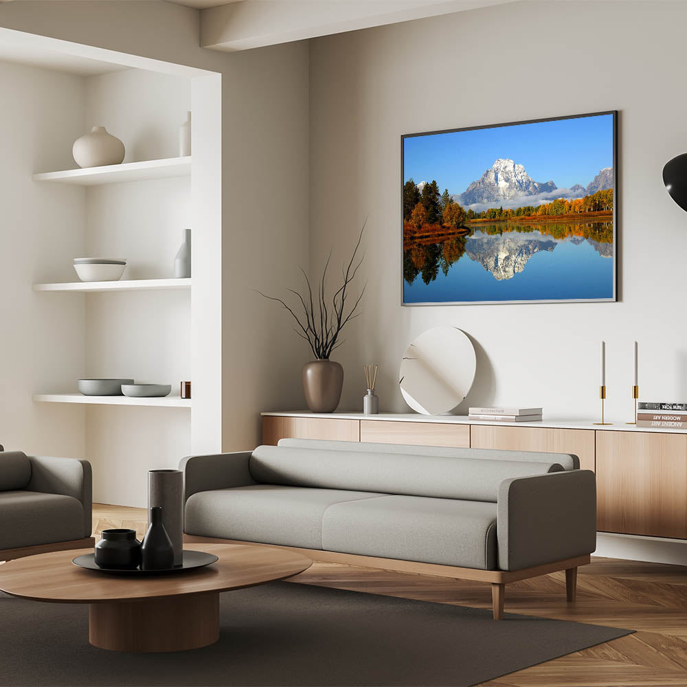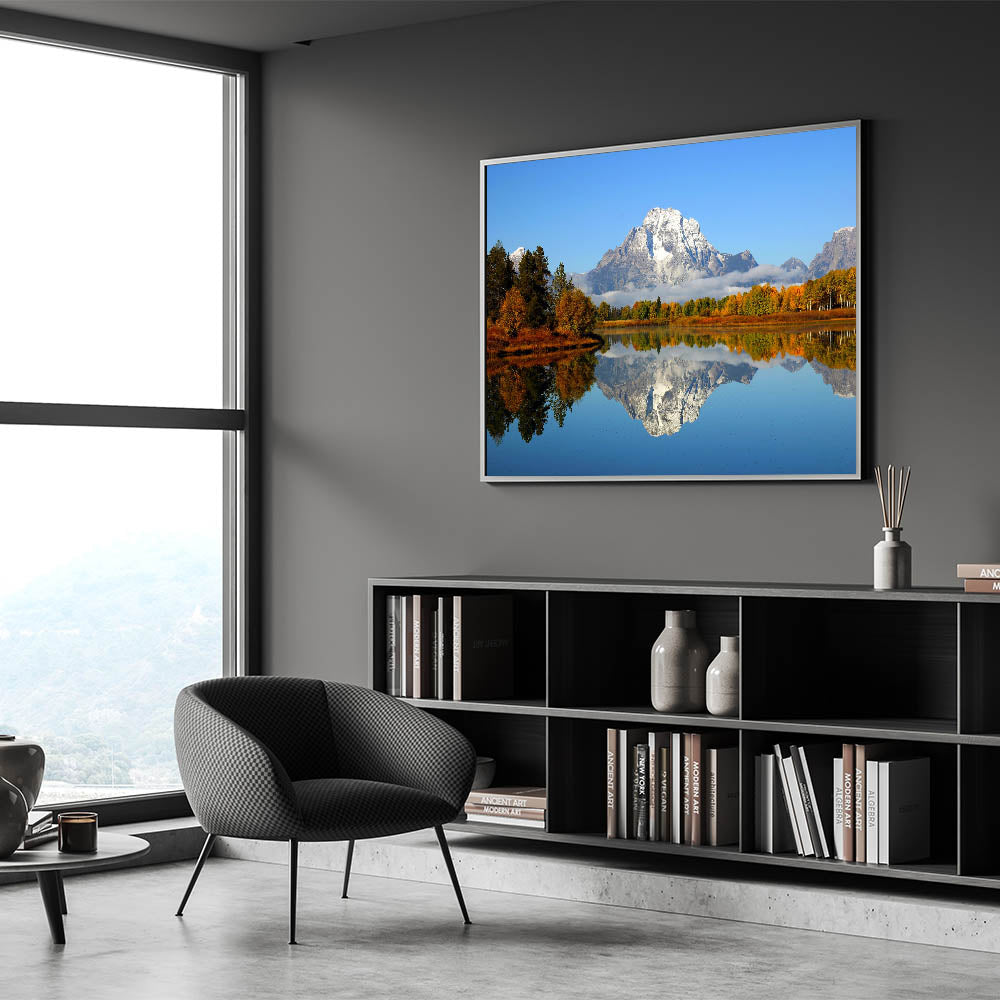 Immerse your space in the serene beauty of this mountain reflection in autumn wall art. This stunning piece captures the perfect mirror image of a snow-capped mountain in the still waters of a lake, surrounded by a vibrant array of autumn foliage. The crisp blue sky and the rich colors of the trees create a harmonious and tranquil scene, making this artwork an ideal addition to any room that seeks to evoke a sense of peace and natural beauty.