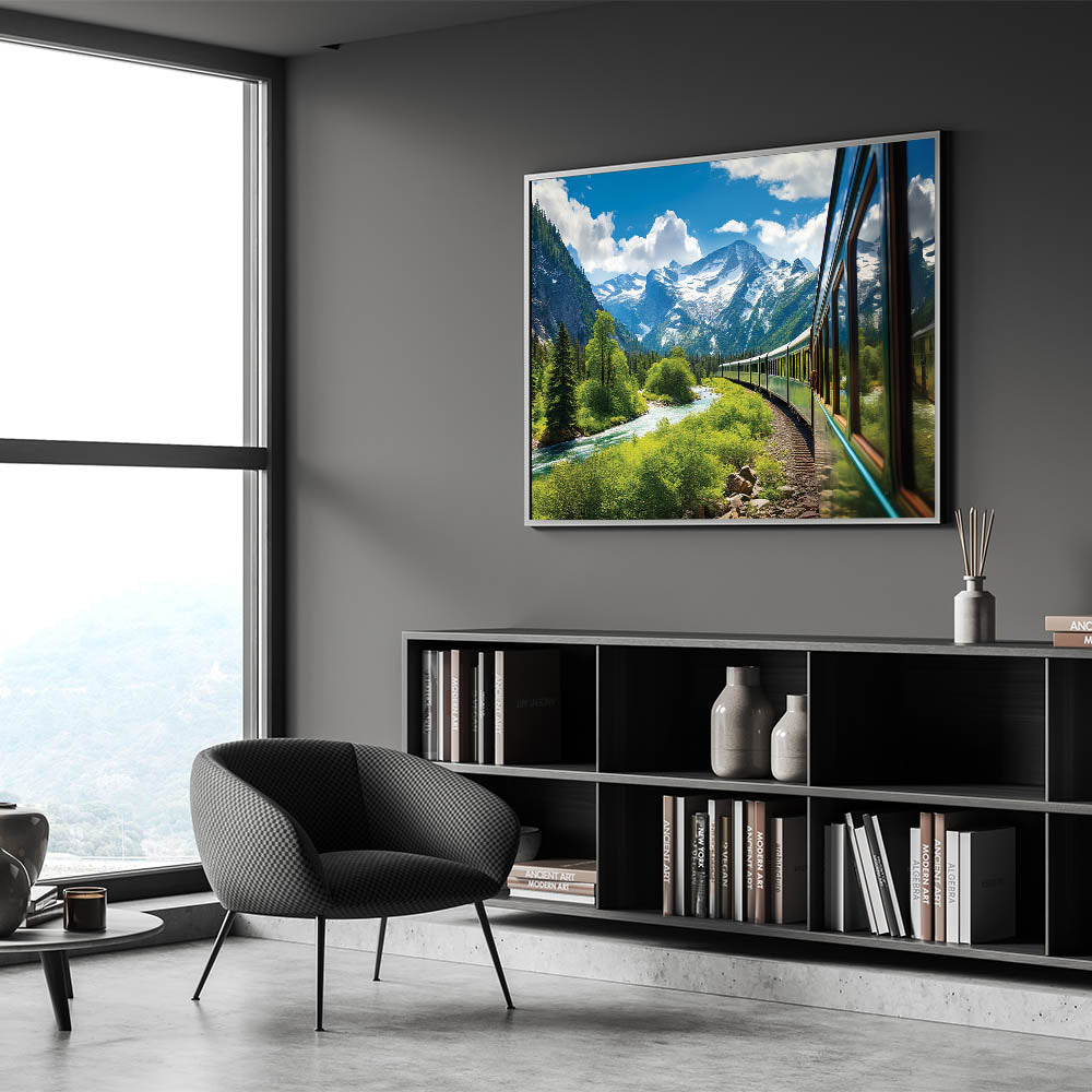 Embark on a breathtaking journey through the mountains with this stunning railway wall art. The vibrant greens of the trees, the crisp blues of the sky and river, and the majestic snowy peaks create a captivating scene that evokes a sense of adventure and tranquility.