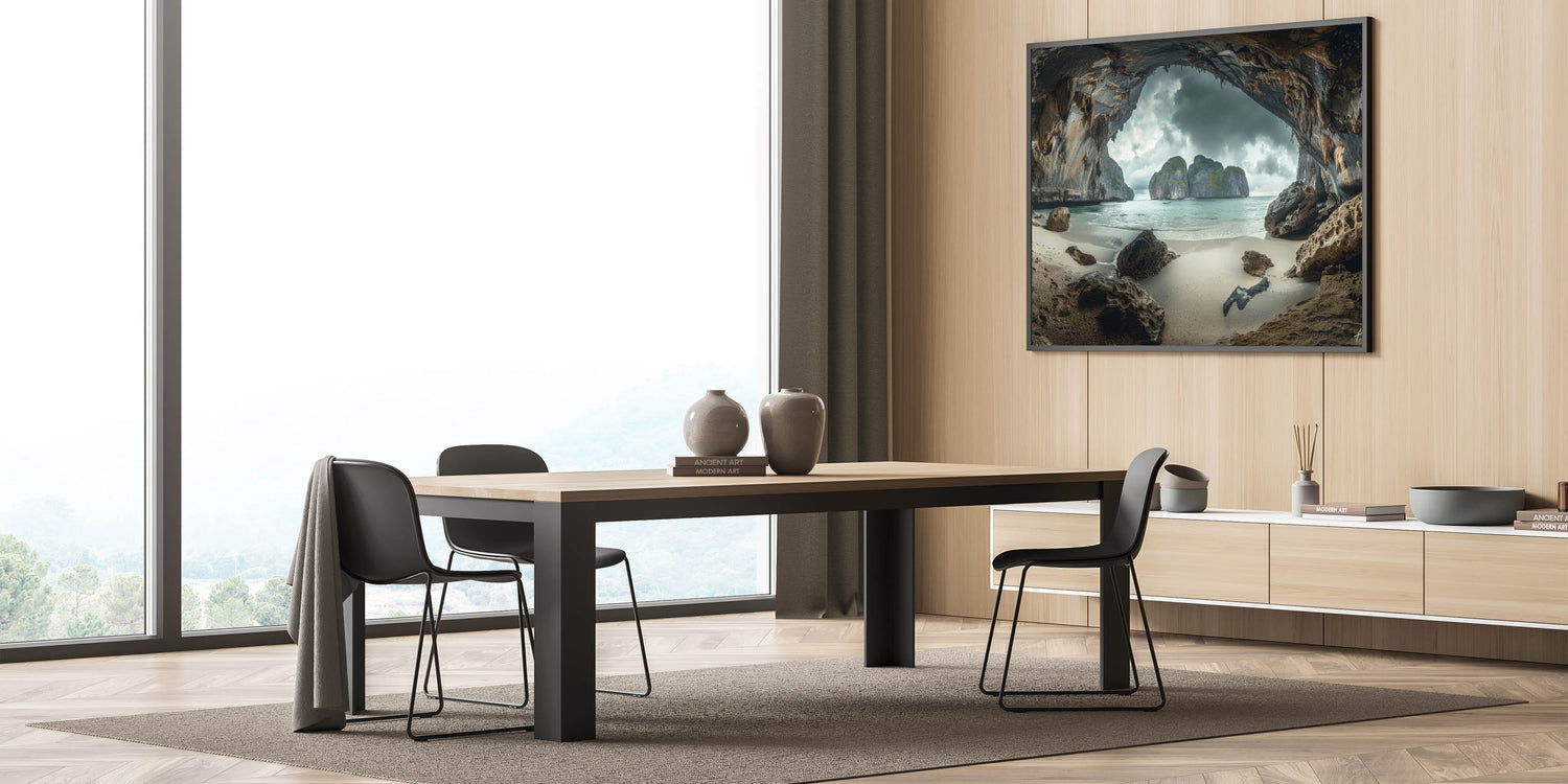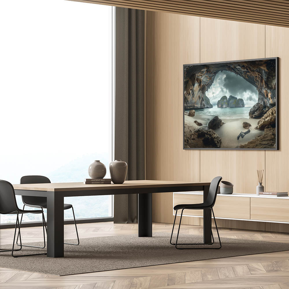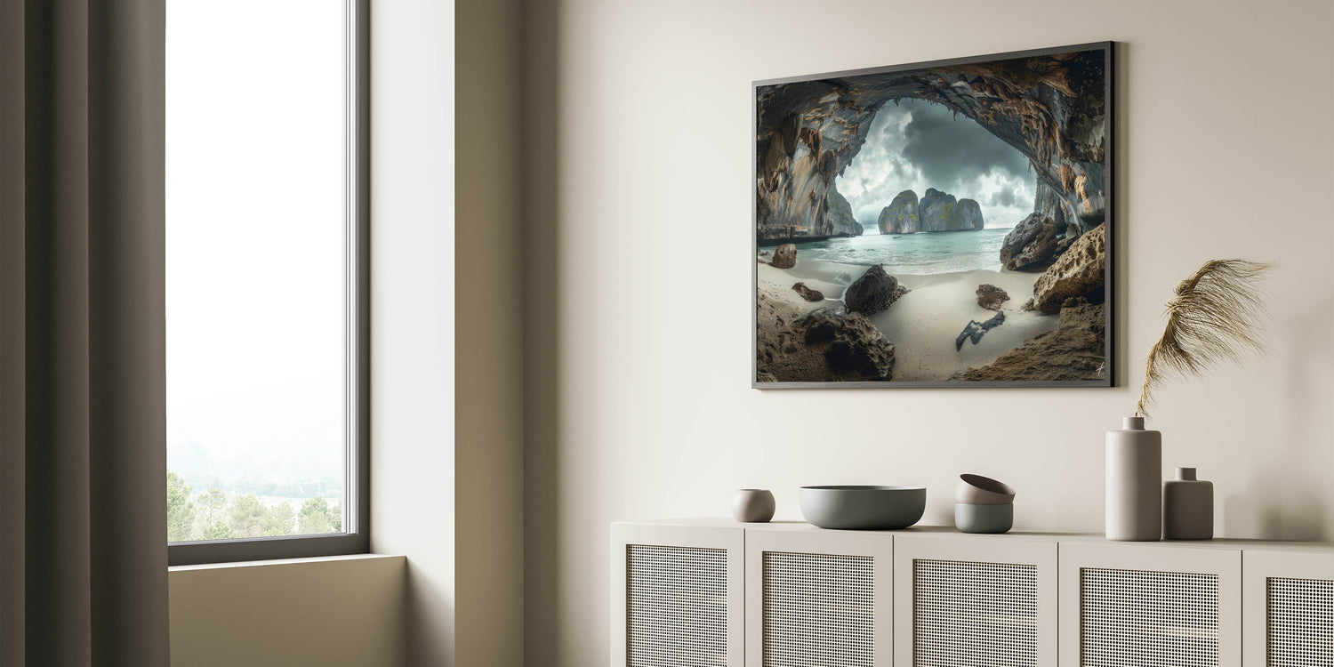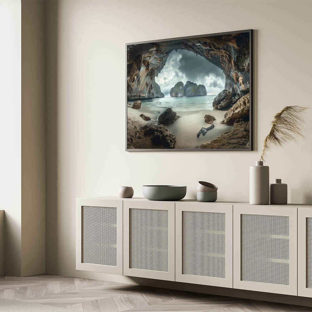Unveil the mystery and beauty of Thailand with our "Mystic Cave Beach - Dramatic Coastal Thailand Canvas Art." This piece transports viewers to a secluded cave beach, where towering rock formations frame a serene coastal view under a moody sky, creating a captivating and almost otherworldly atmosphere.