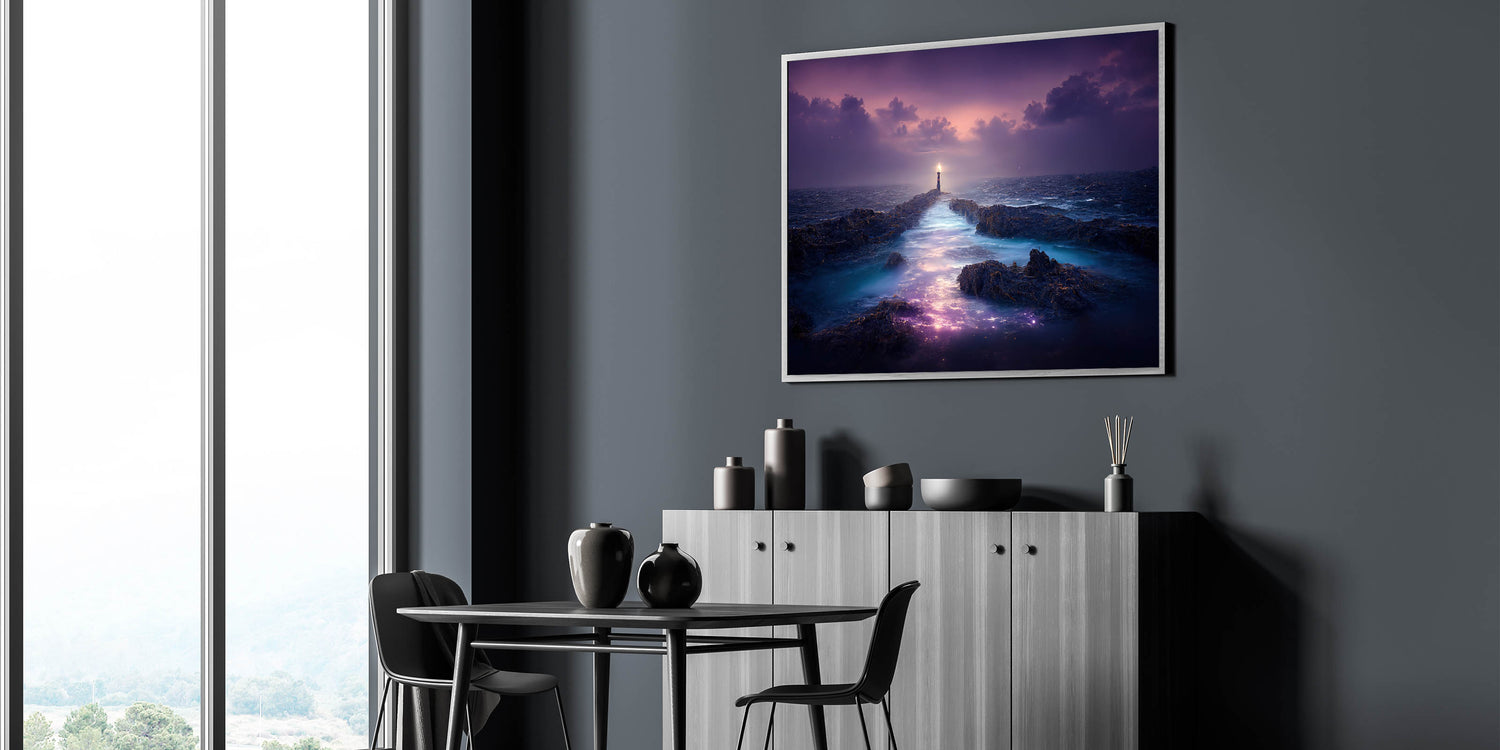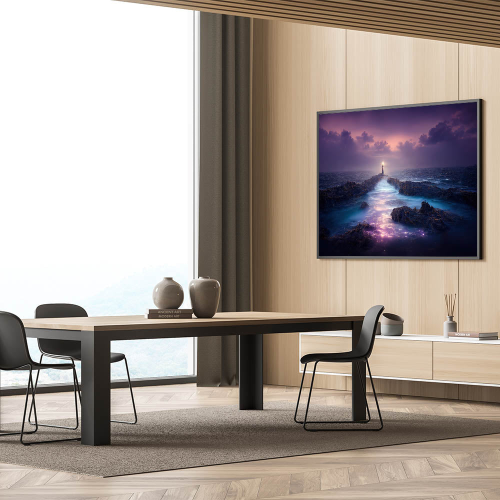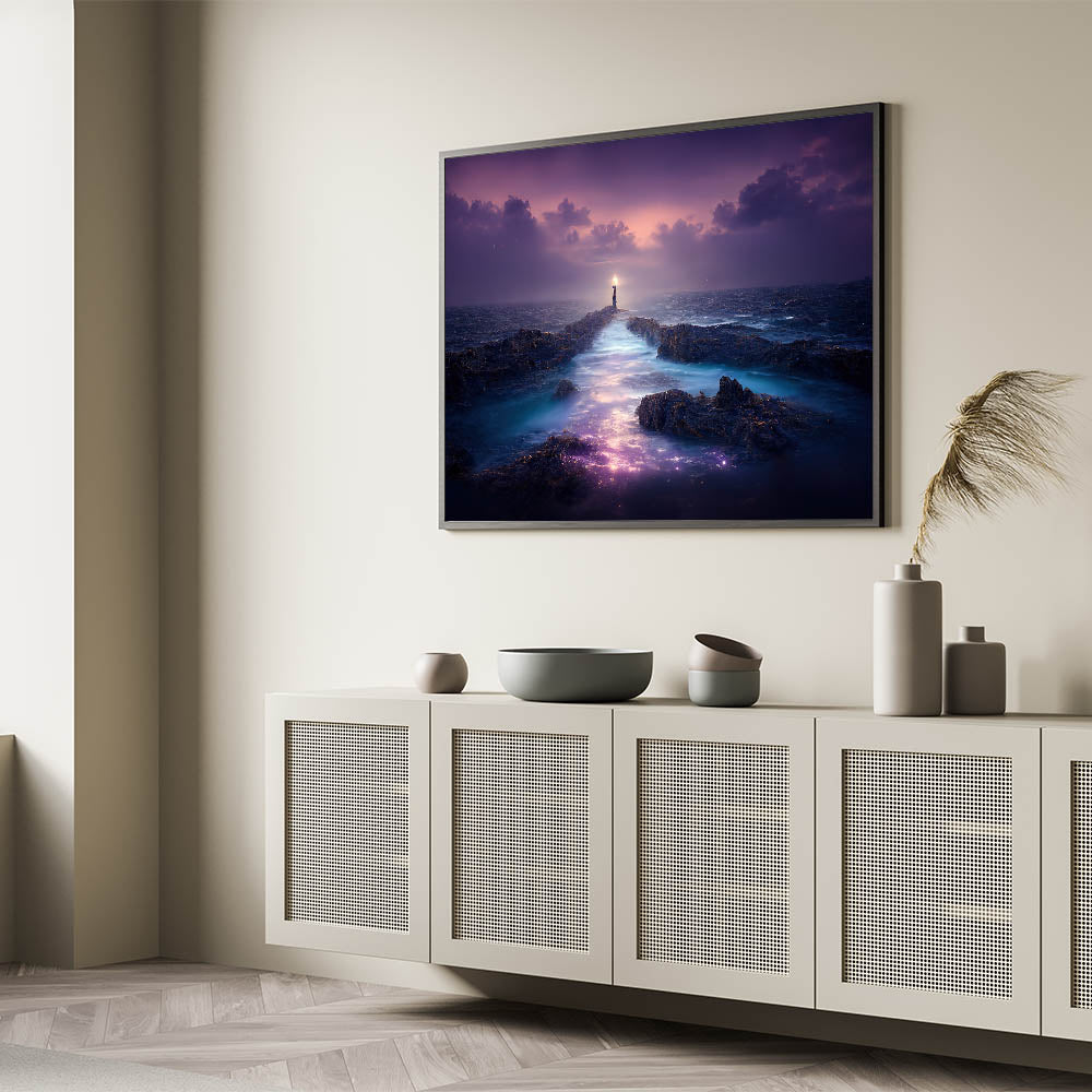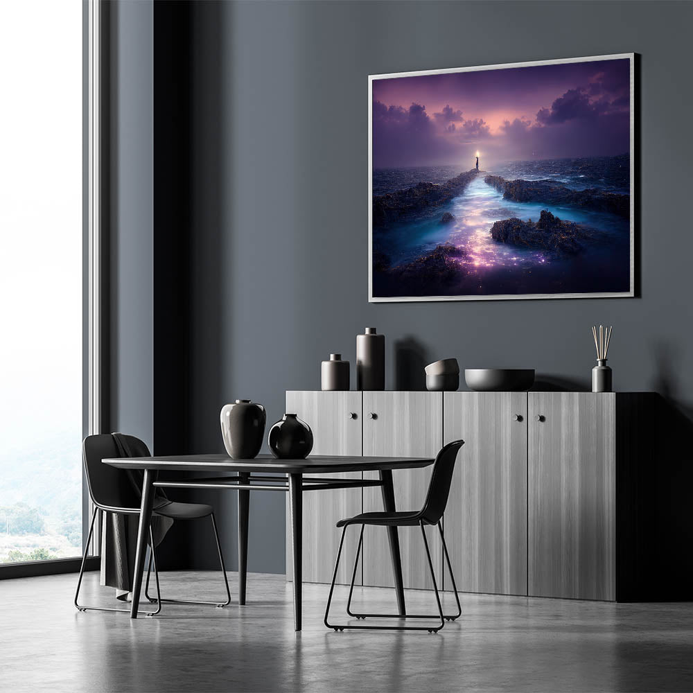 This lighthouse art piece is perfect for those who are drawn to the enigmatic and tranquil nature of the sea. The rich, dark tones and captivating composition make it a standout addition to any room, bringing a sense of calm and intrigue.